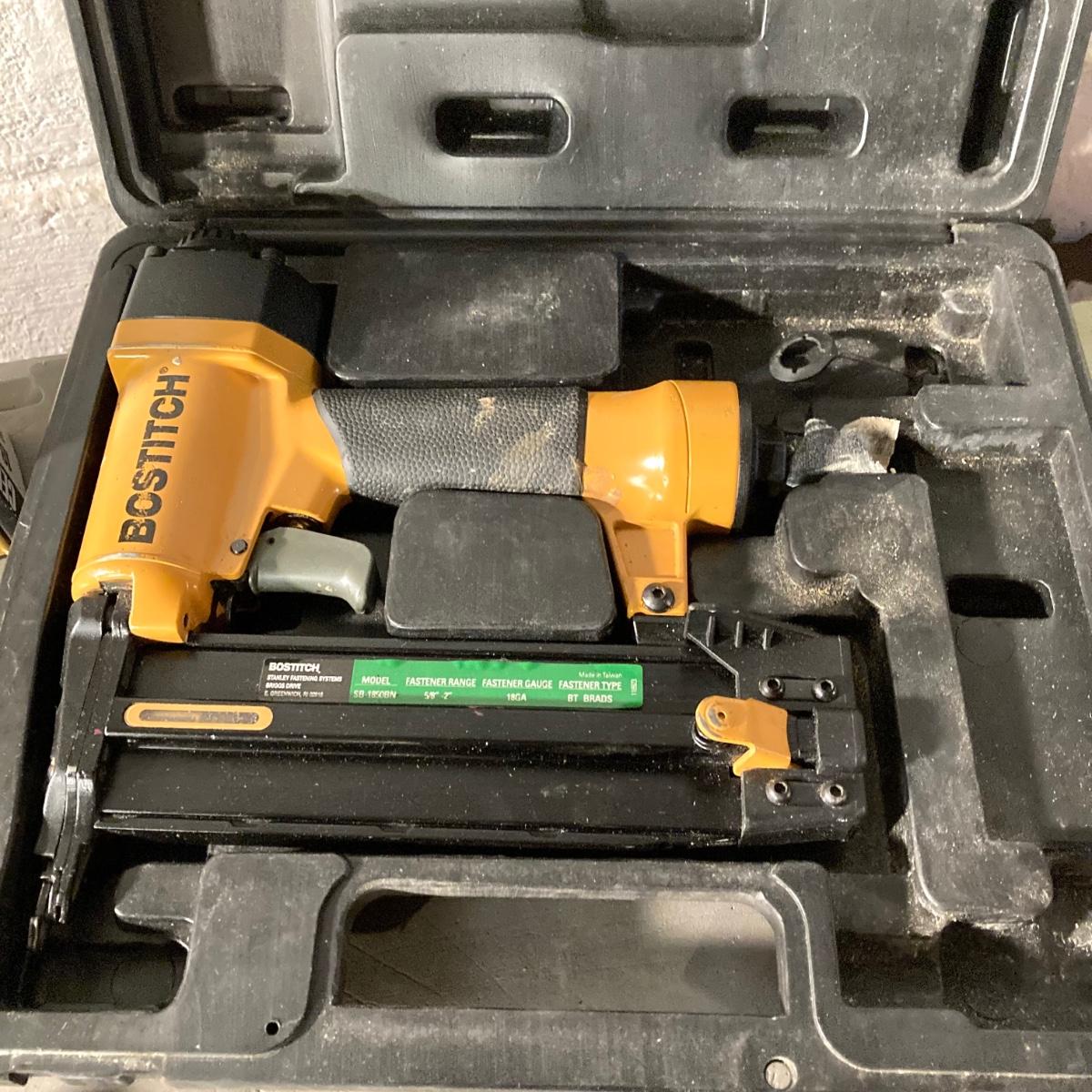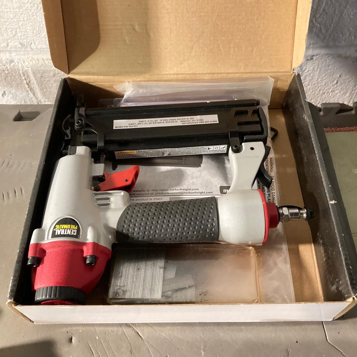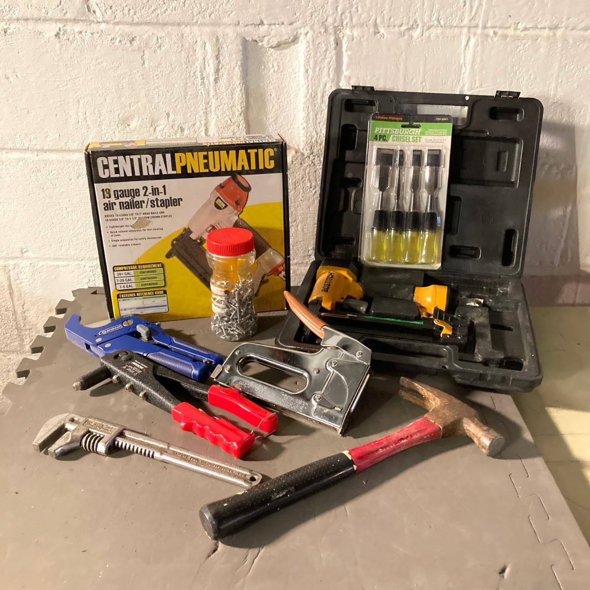 LOT 72: Bostitch Nail Gun in Storage Case, Central Pneumatic Air Nailer / Stapler, Arrow Rivet Gun Model RH200, Chisel Set and More