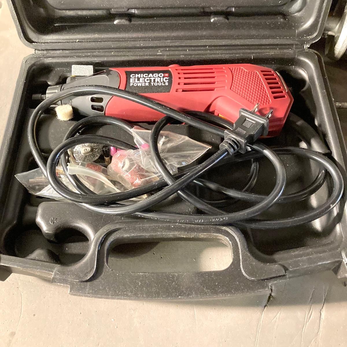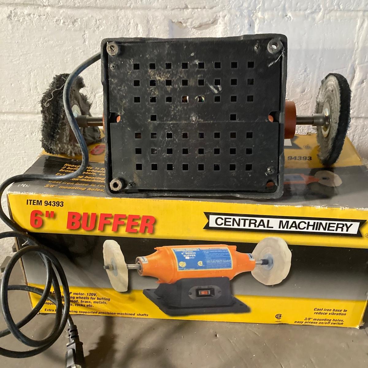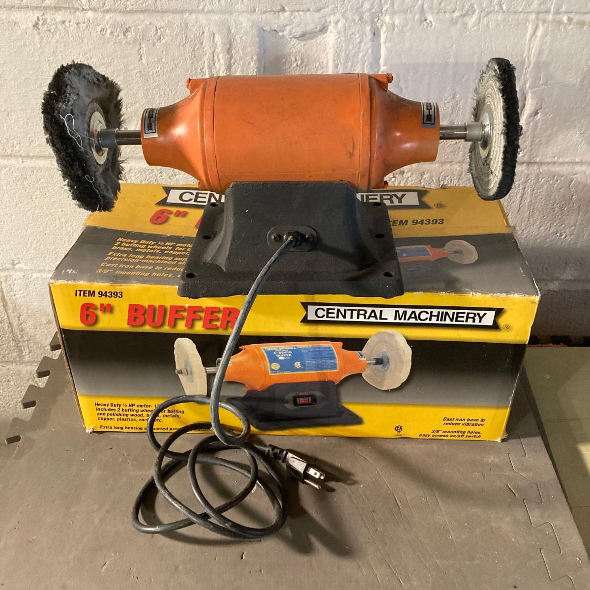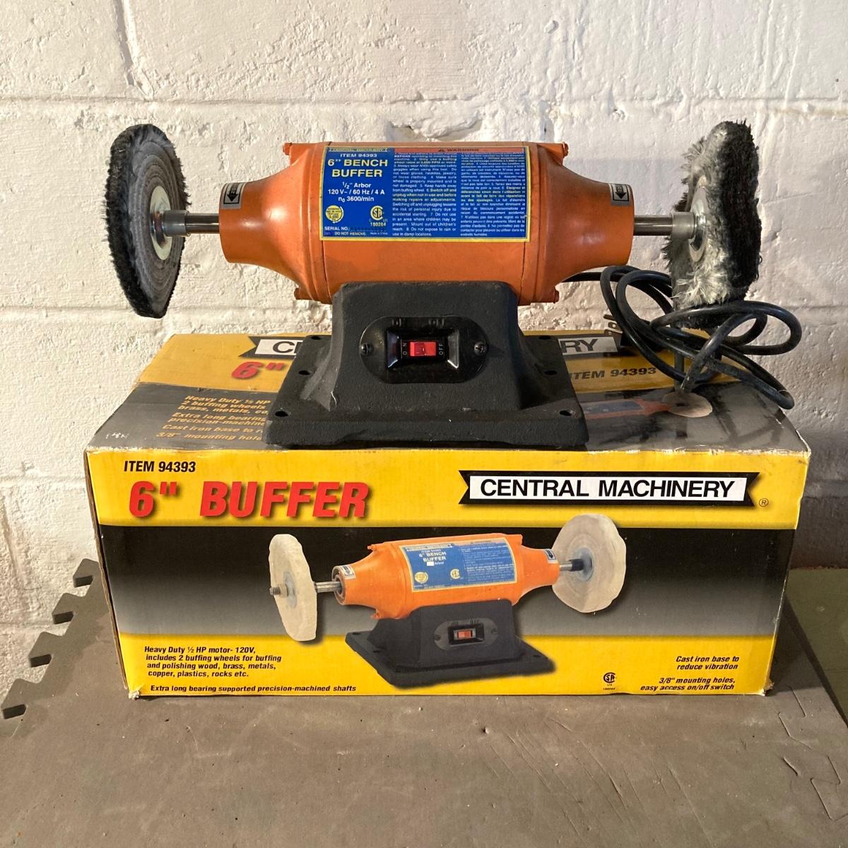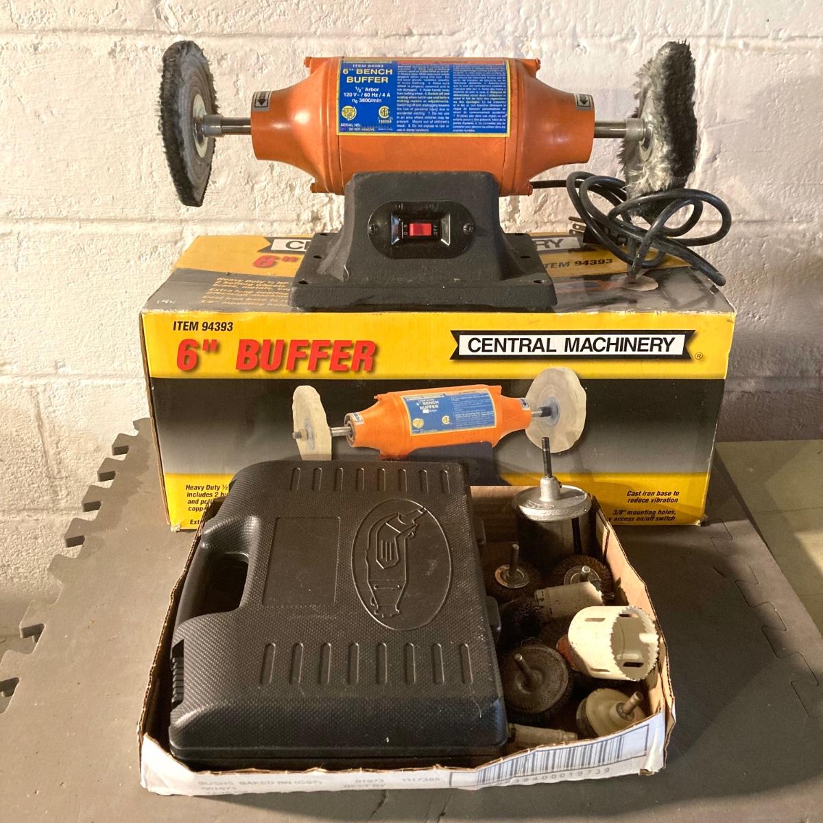 LOT 73: Central Machinery 6" Bench Buffer in Original Box, Chicago Electric Power Tools Rotary Tool in Storage with Accessories