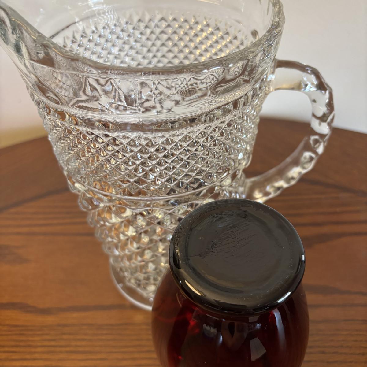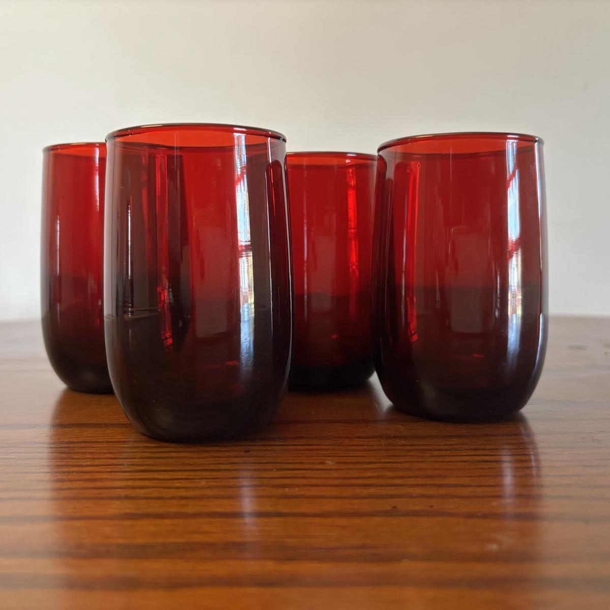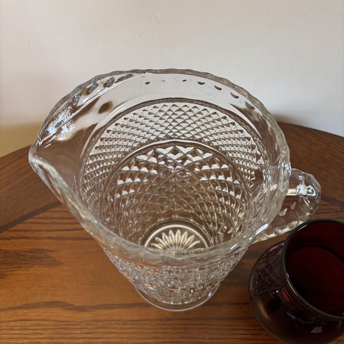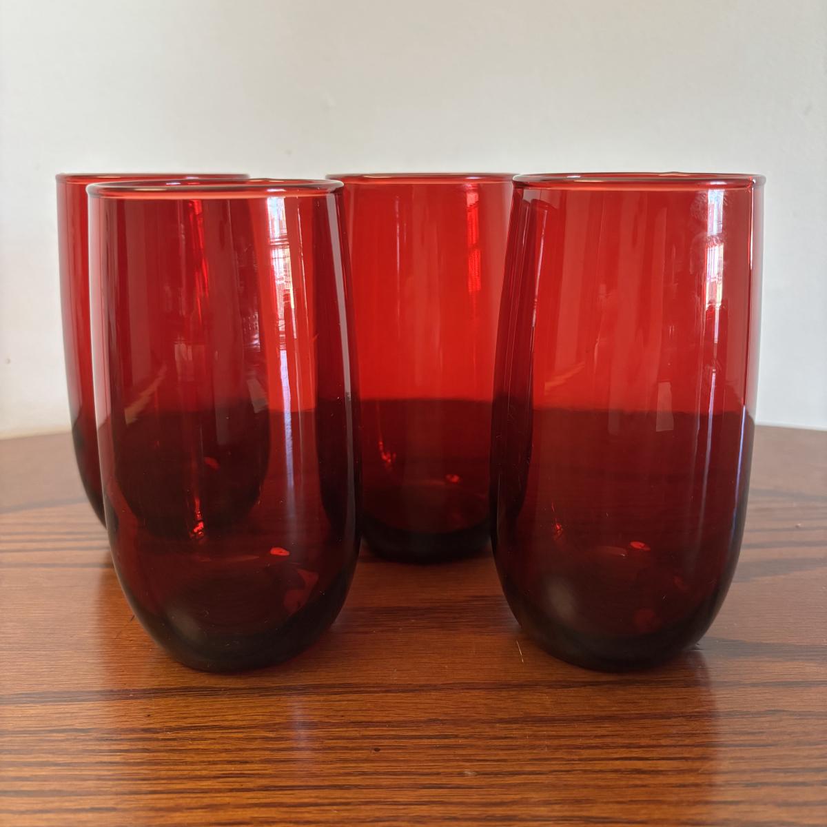 LOT 86: Vintage Anchor Hocking Ruby Red Beverage Glasses, 3-Different Sizes 4 each, Achor Hocking Wexford Pattern Pitcher and a Ruby Red Vase