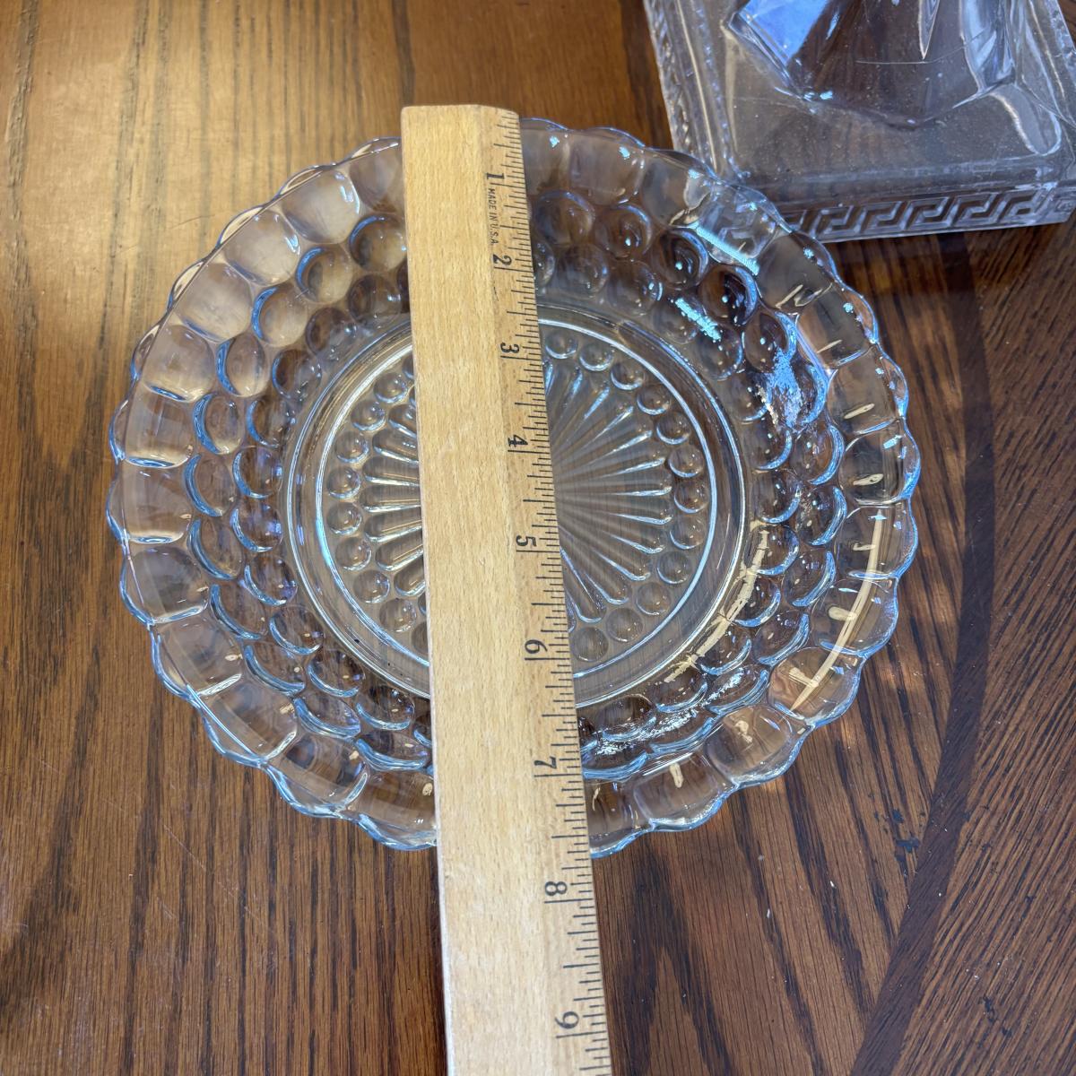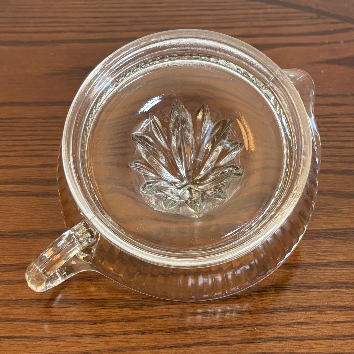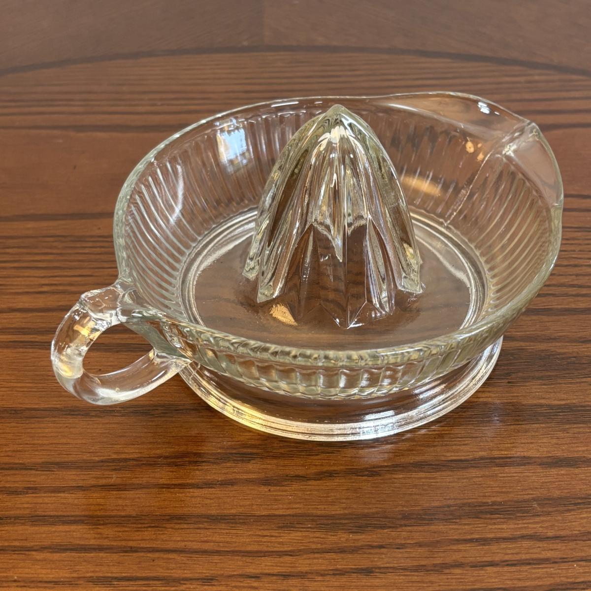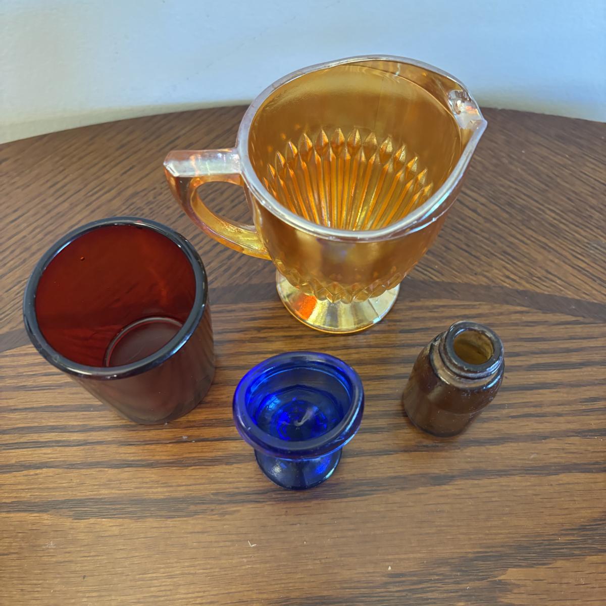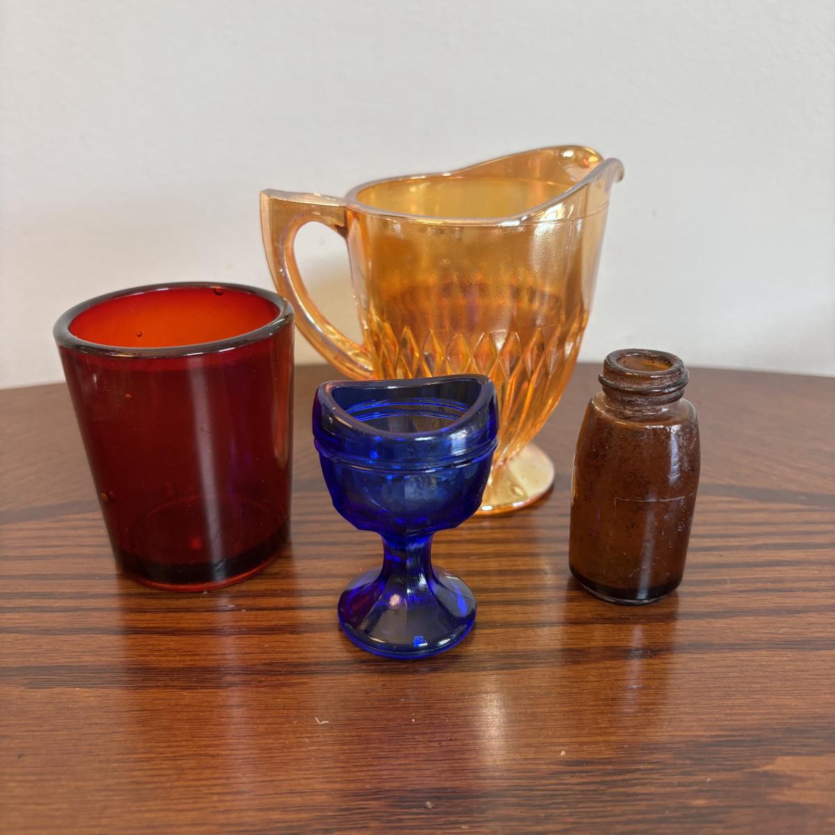 LOT 91: Vintage Hazel-Atlas Juicer, Spry Measuring Glass, Abbots Milk Bottle, Cobalt Blue Eye Cup, Carnival Glass Creamer, Hurricane Lamp & More