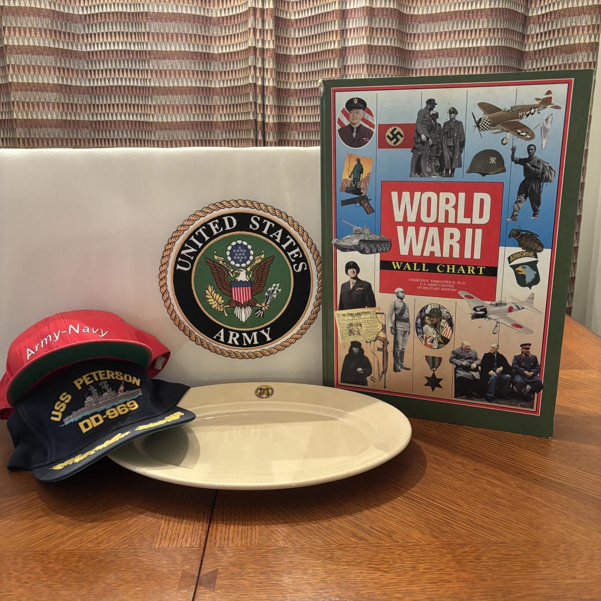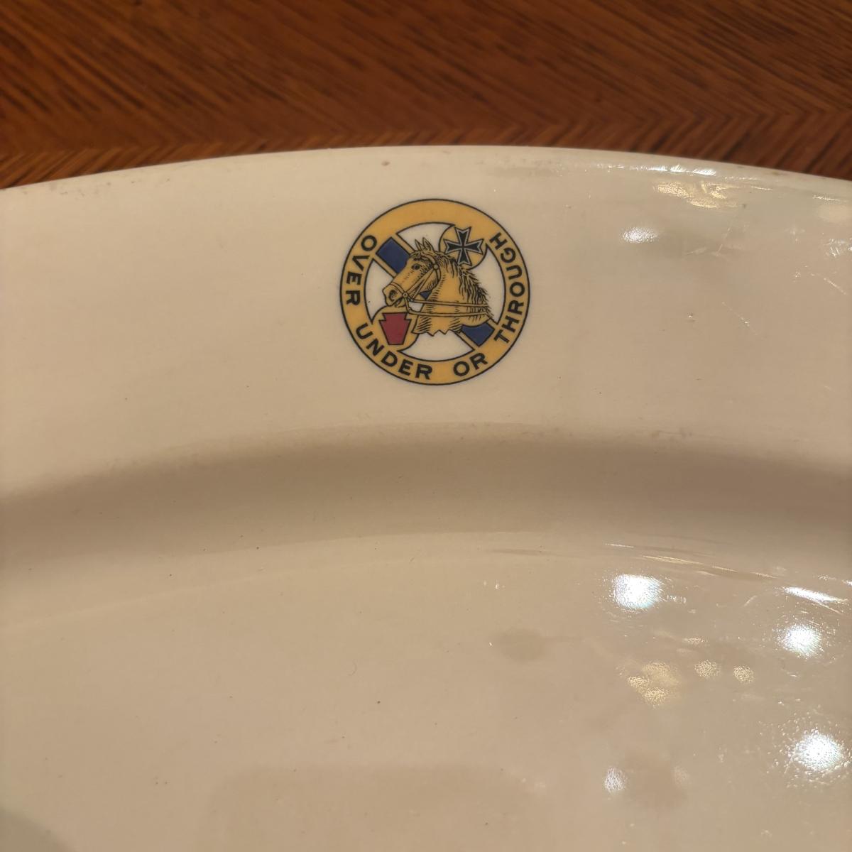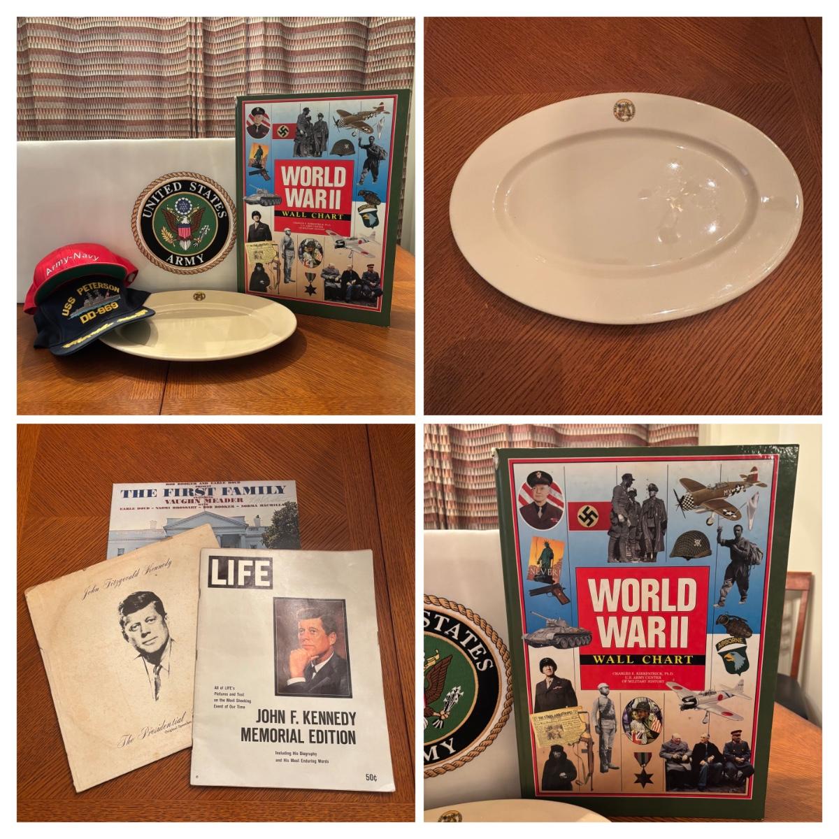 LOT 104: Vintage WWII 104th Calvery Regiment Mess Hall Dinnerware Serving Platter, WWLL Wall Chart, US Army Casket Panel along with JFK Memorabilia