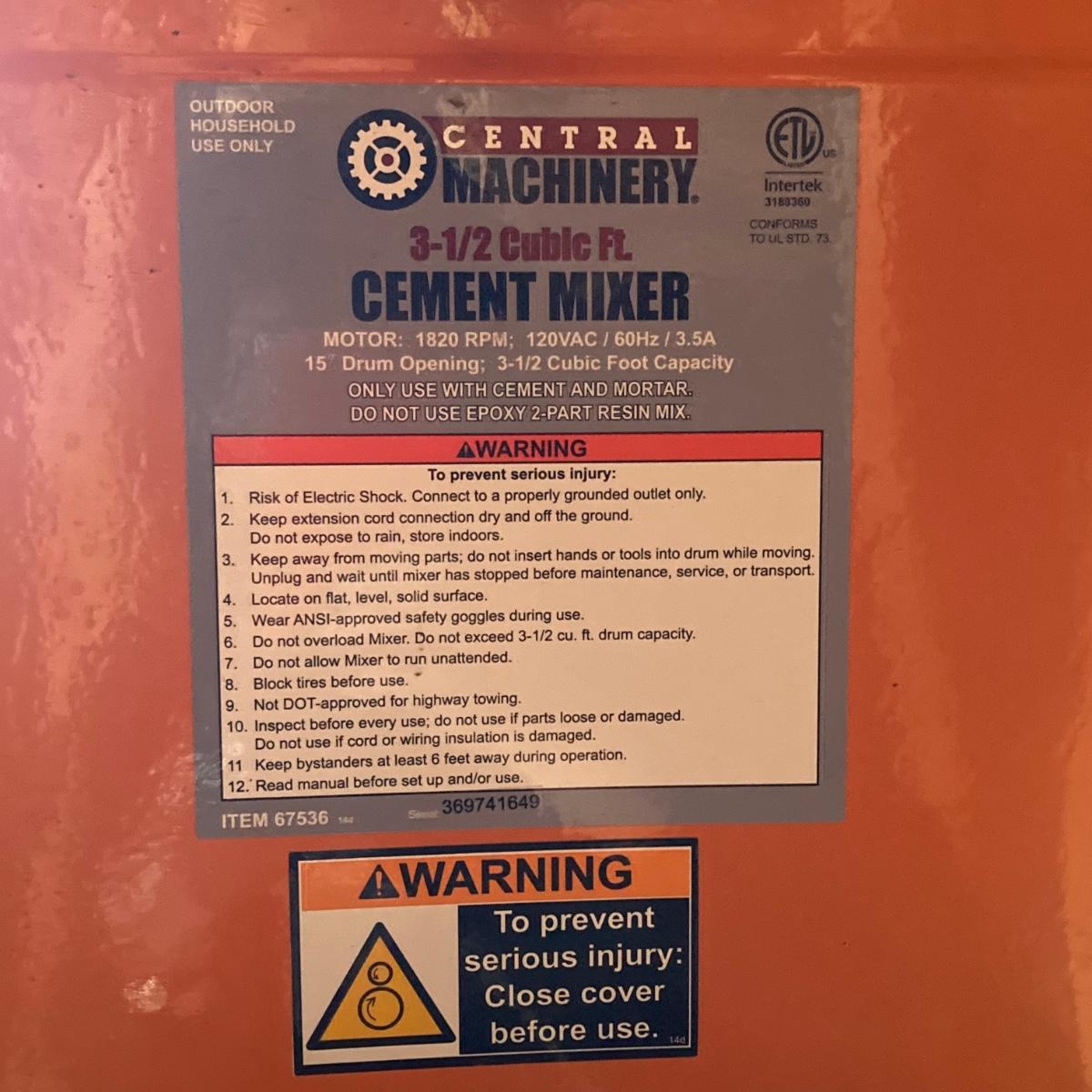LOT 110: Central Machinery 3-1/2 Cubic Ft Rolling Cement Mixer