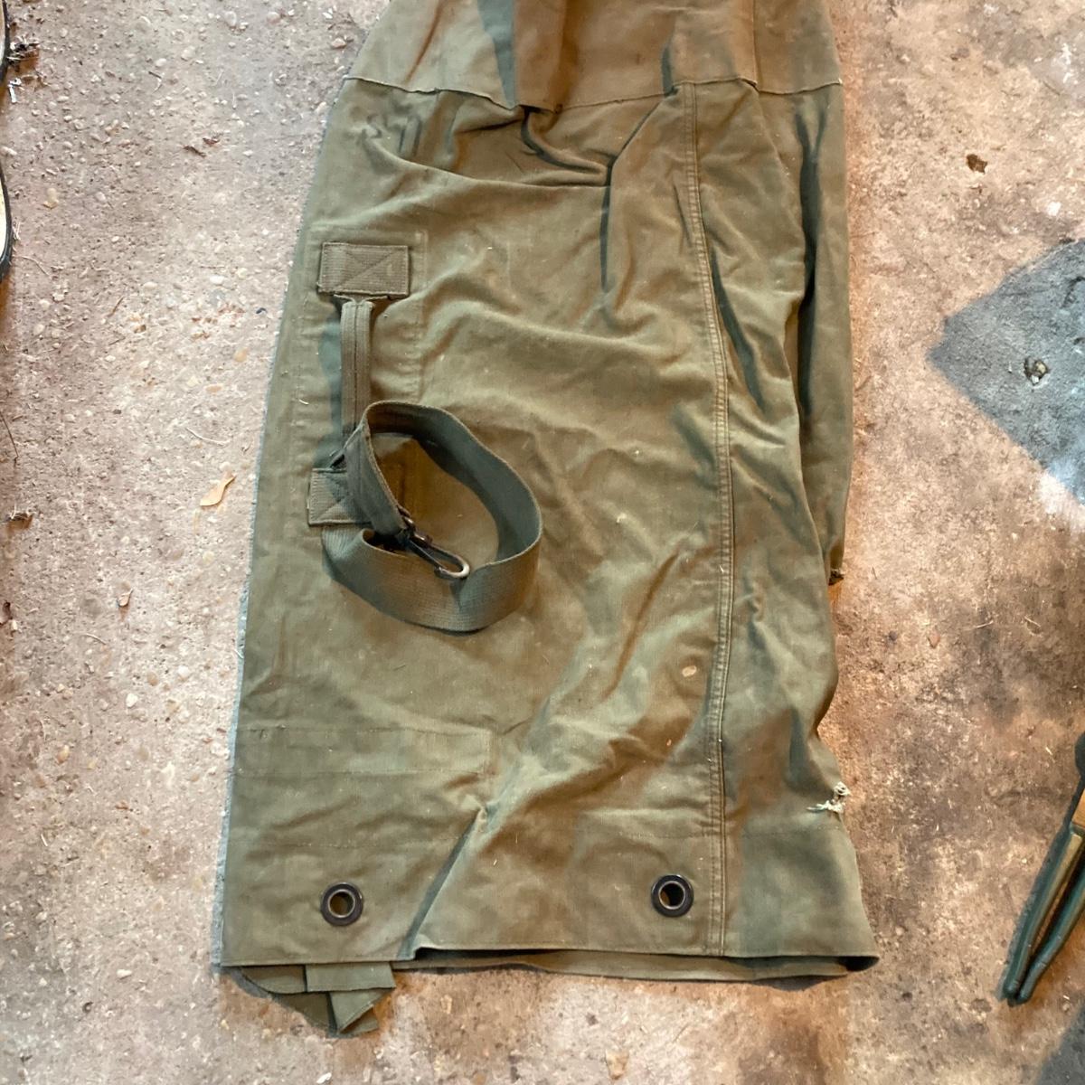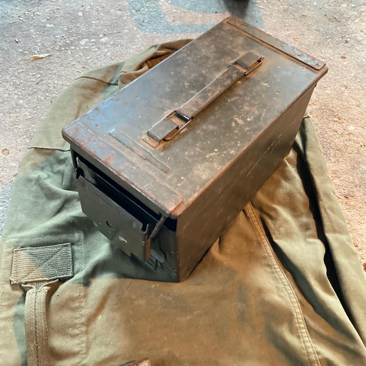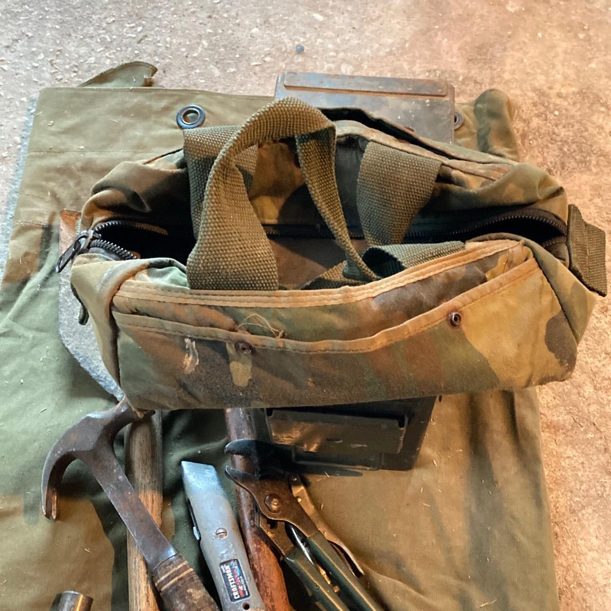 LOT 127: Military Collection - Olive Drab Green Bag, Ammo Box, Shovel, Camouflage Bag and Assorted Tools