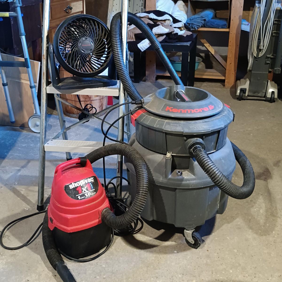 LOT 143: Kenmore Heavy Duty Wet Dry Vac, ShopVac 1 Gallon Wet Dry Vac, Honeywell Fan & Folding Step Ladder