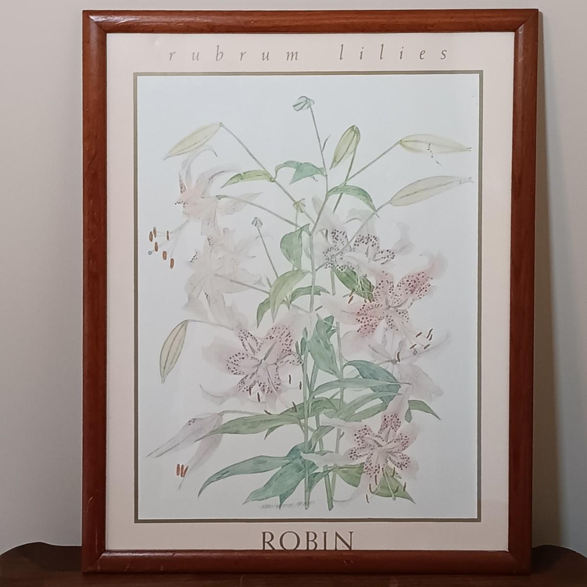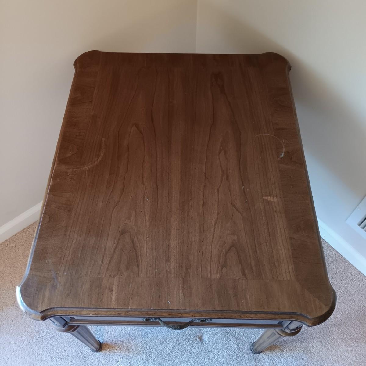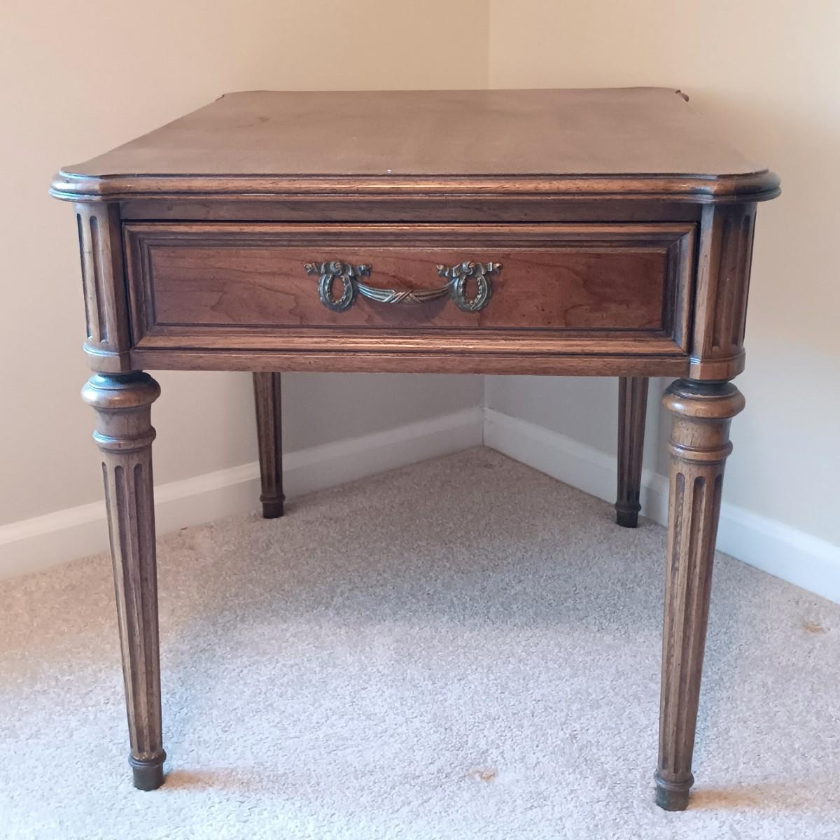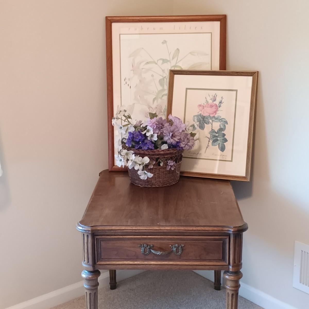 LOT 4: Henredon End Table with Framed Art Prints & Basket