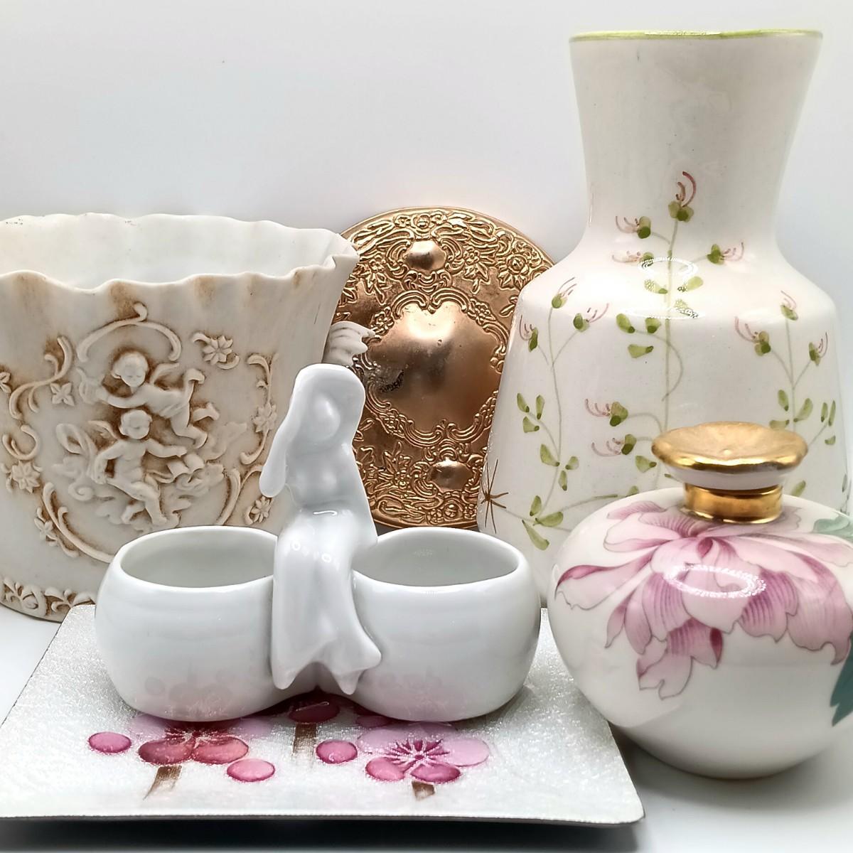 LOT 18: Lefton-Style Porcelain Cherub Vase, Lenox Perfume Bottle, Vintage Enamel Trinket Dish & More