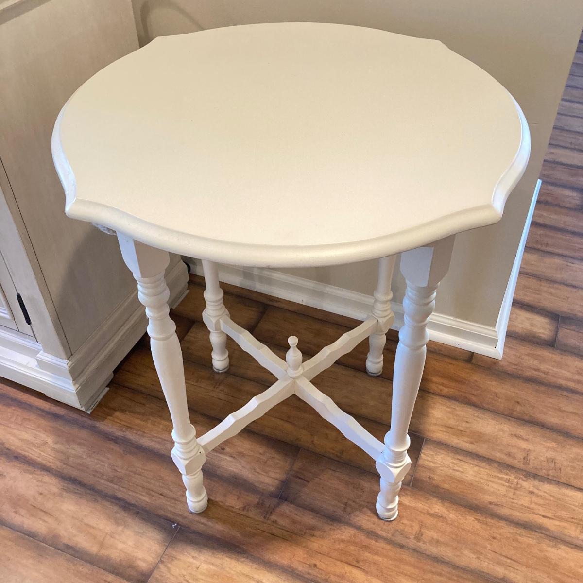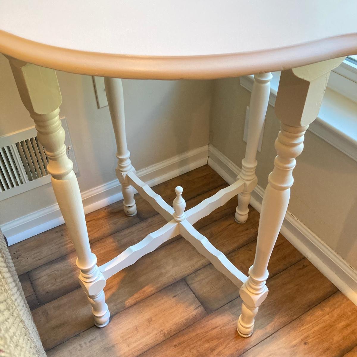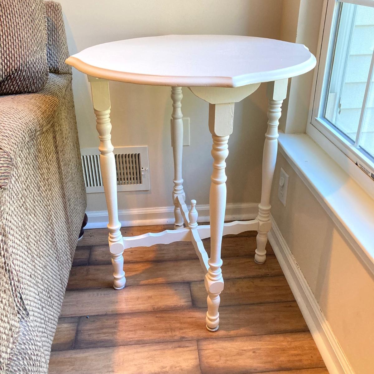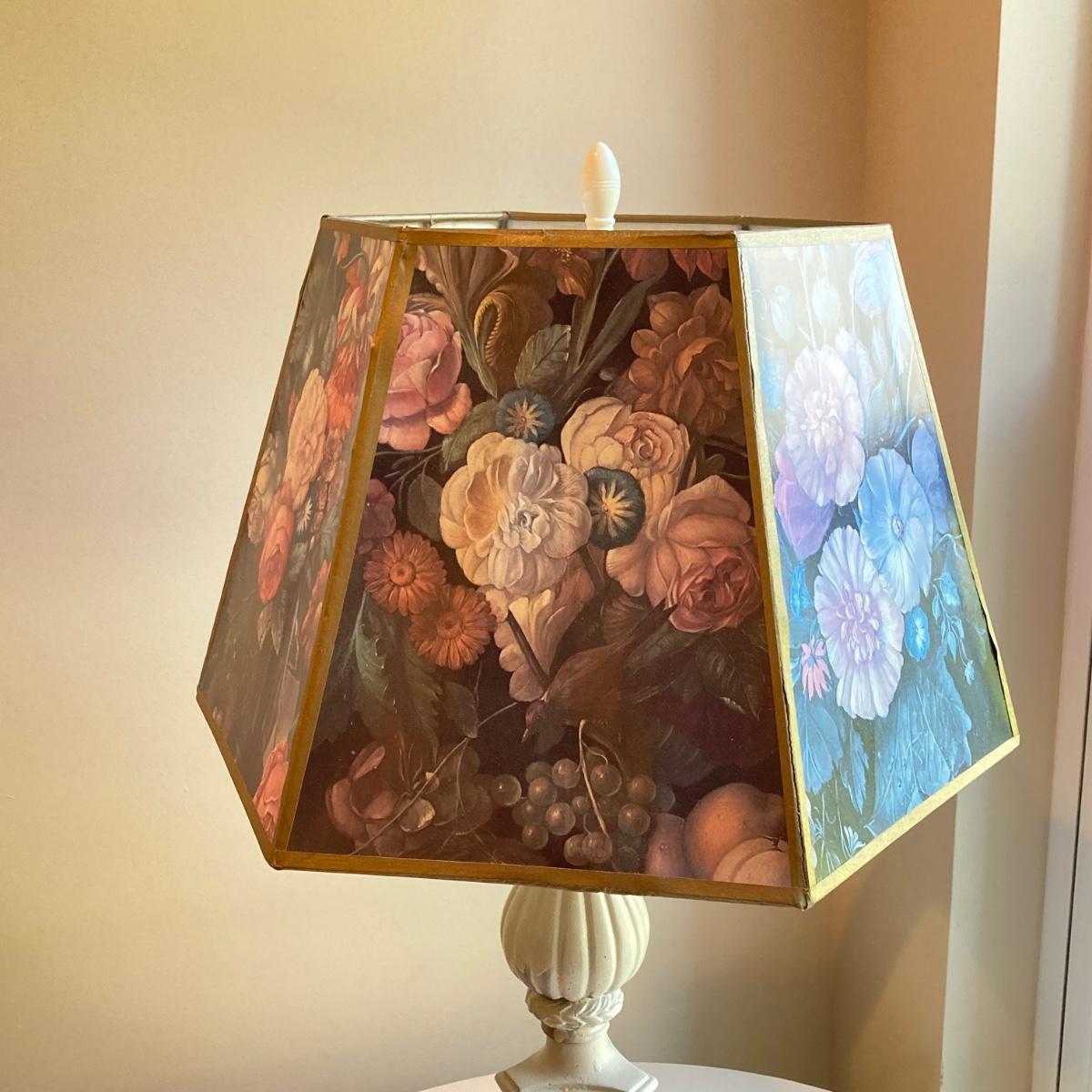 LOT 41: Metal Table Lamp with Hexagon Floral Lamp Shade with Painted White Wooden Table