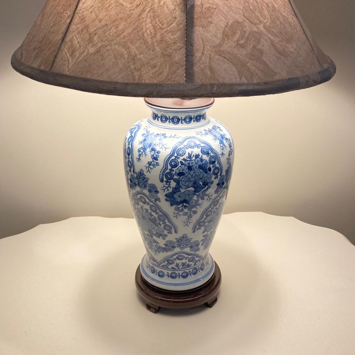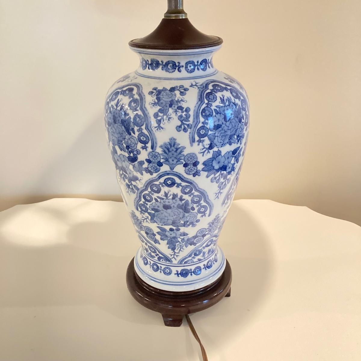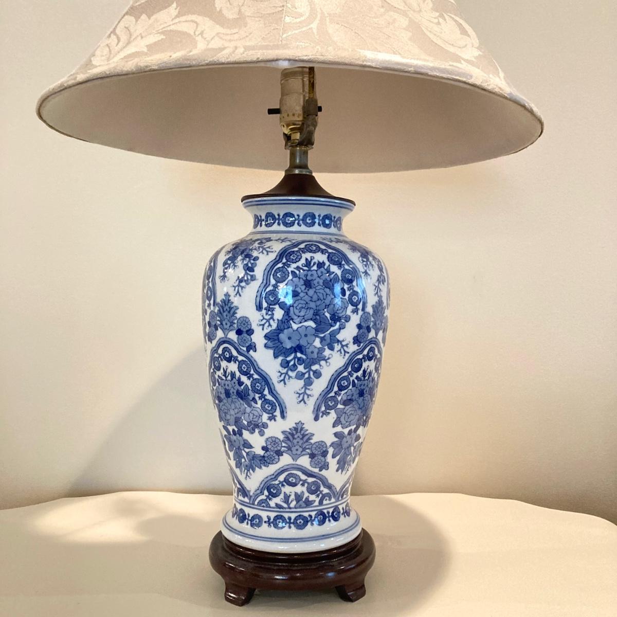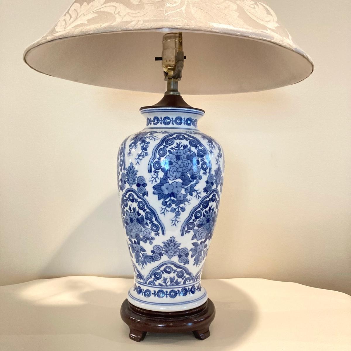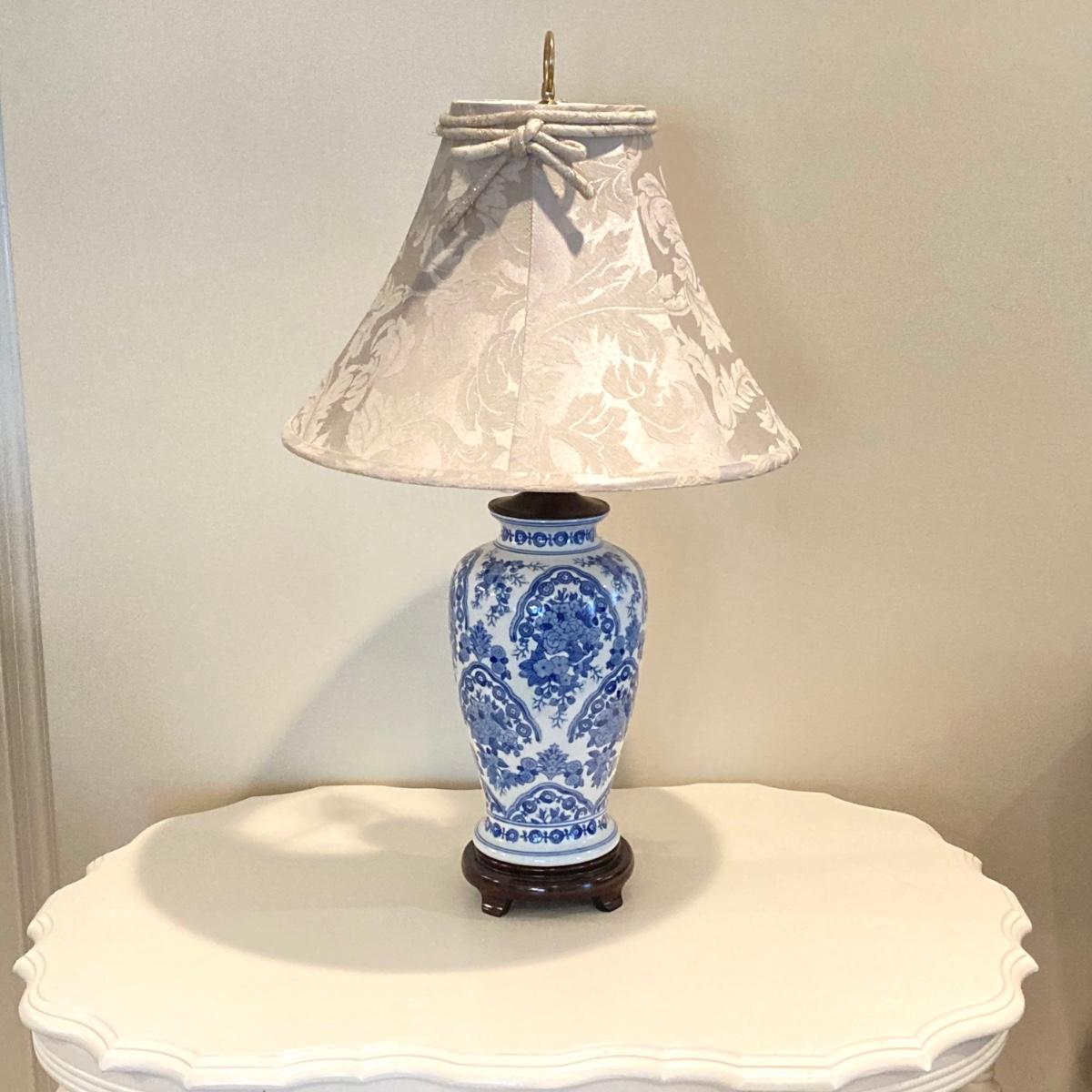 LOT 78: Classic Blue and White Delft Style Table Lamp with Painted White Wooden Table