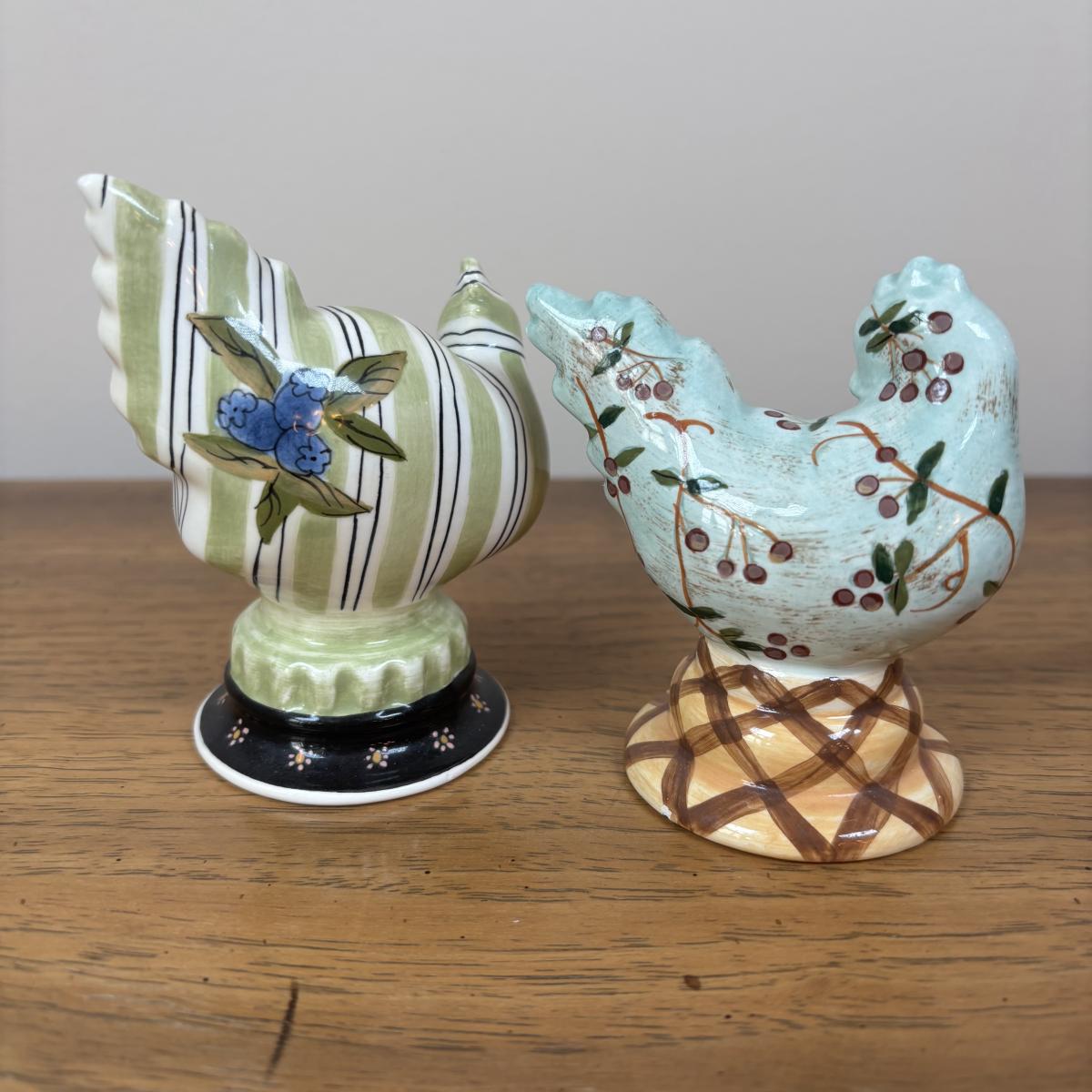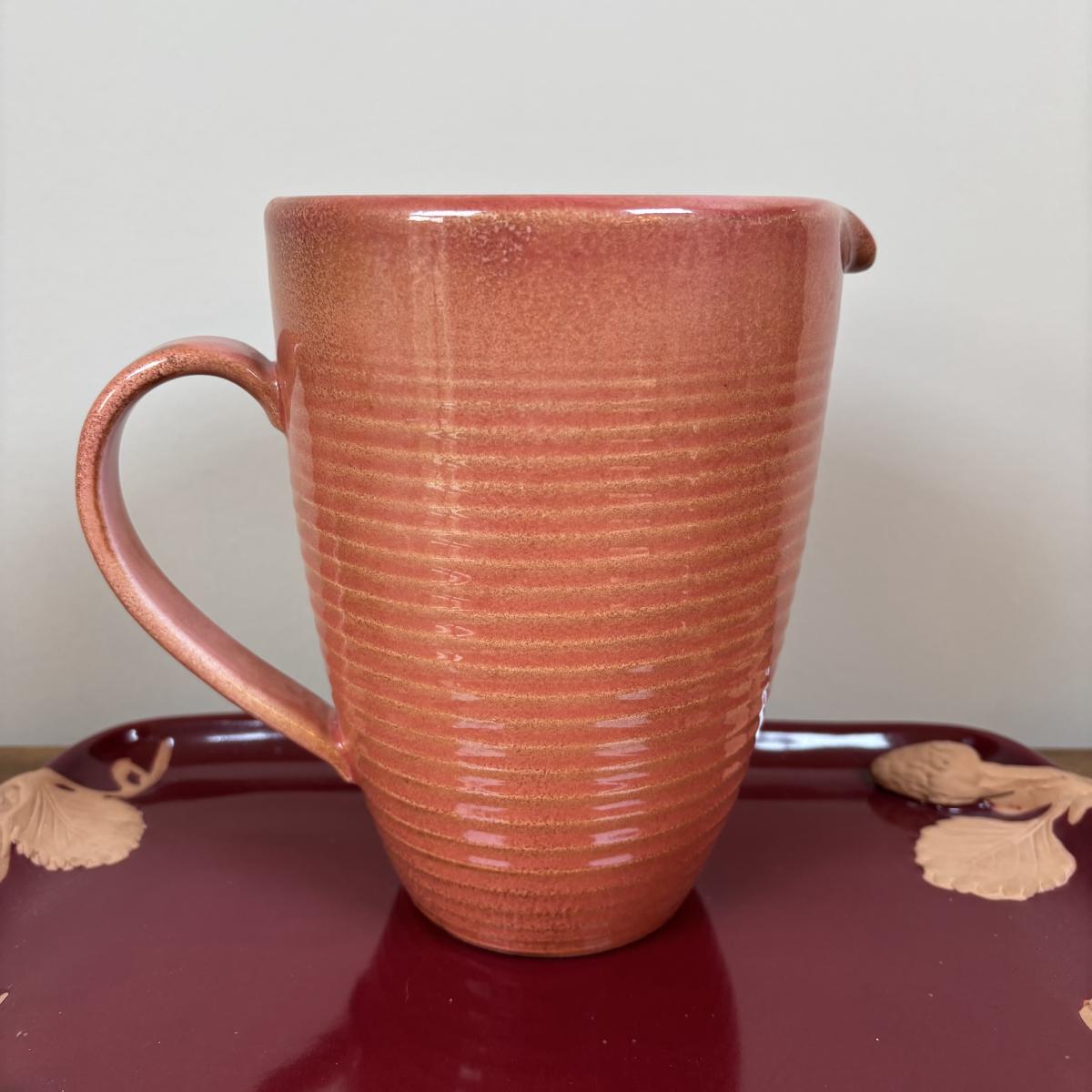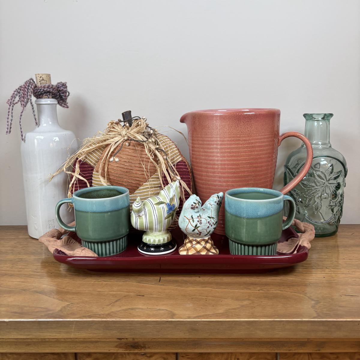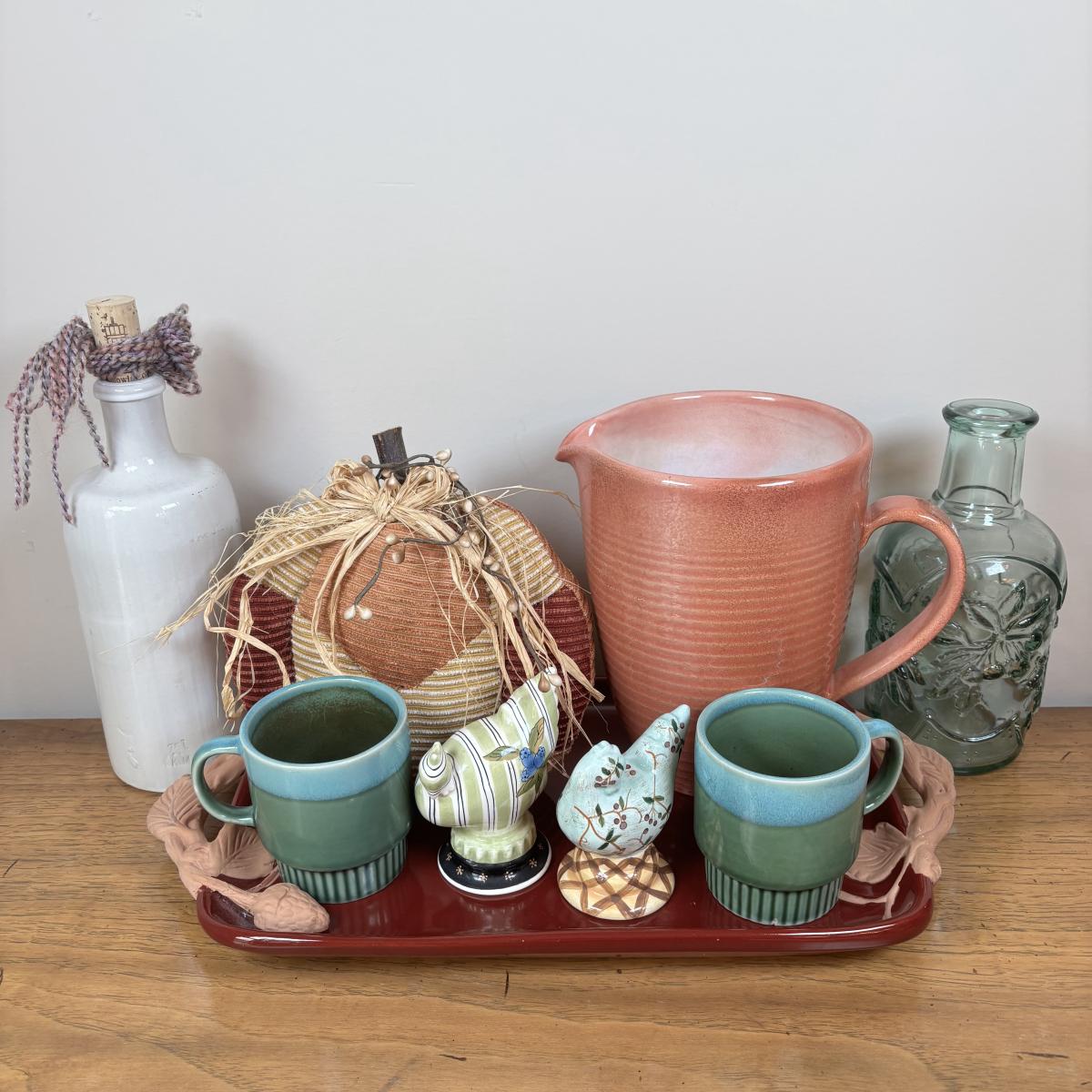 LOT 83: Kitchen Decor & More: Tracy Porter Chicken Figures, Green Drip Glaze Mugs, MKM Pottery Bottle, Stoneware Pitcher, Reddish/Brown Serving Platter w/Terra Cotta Handles