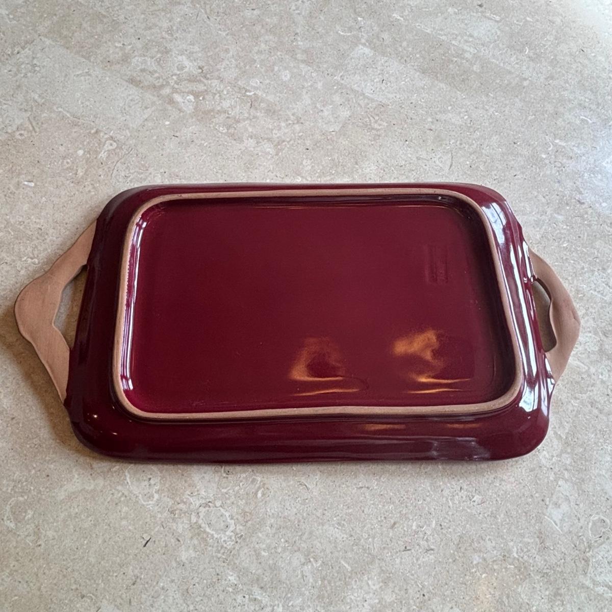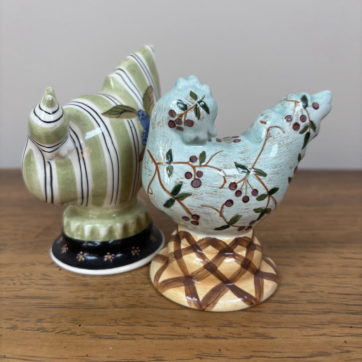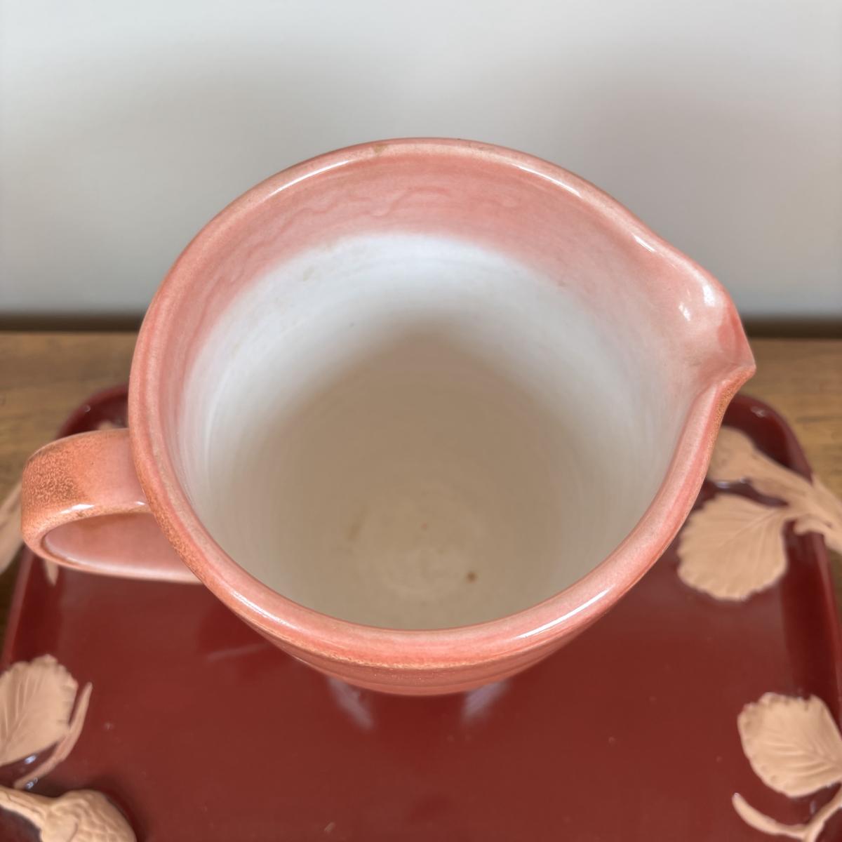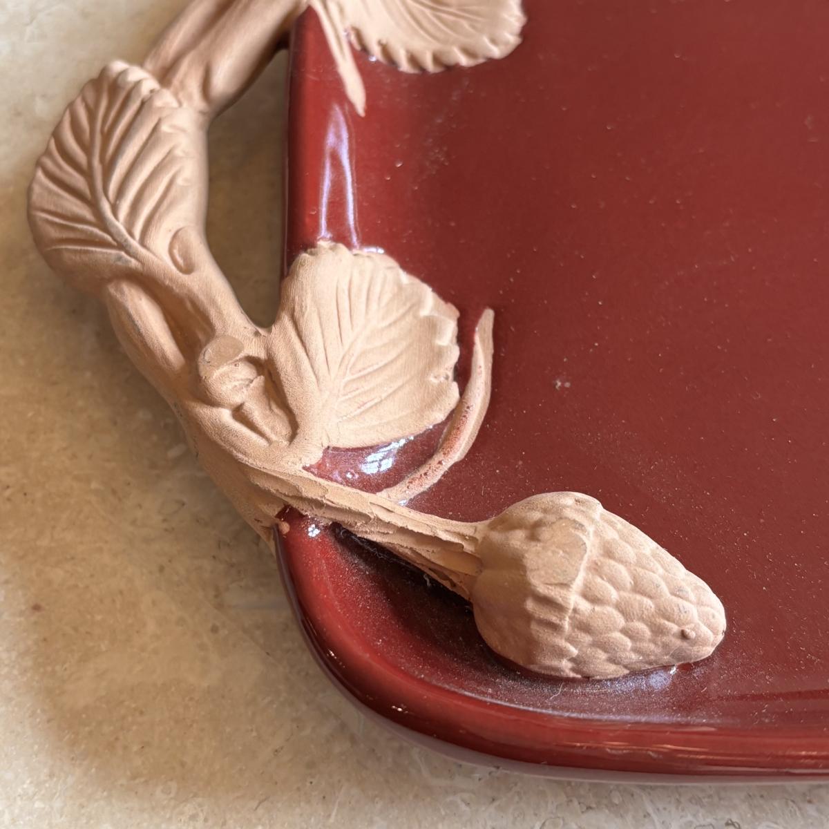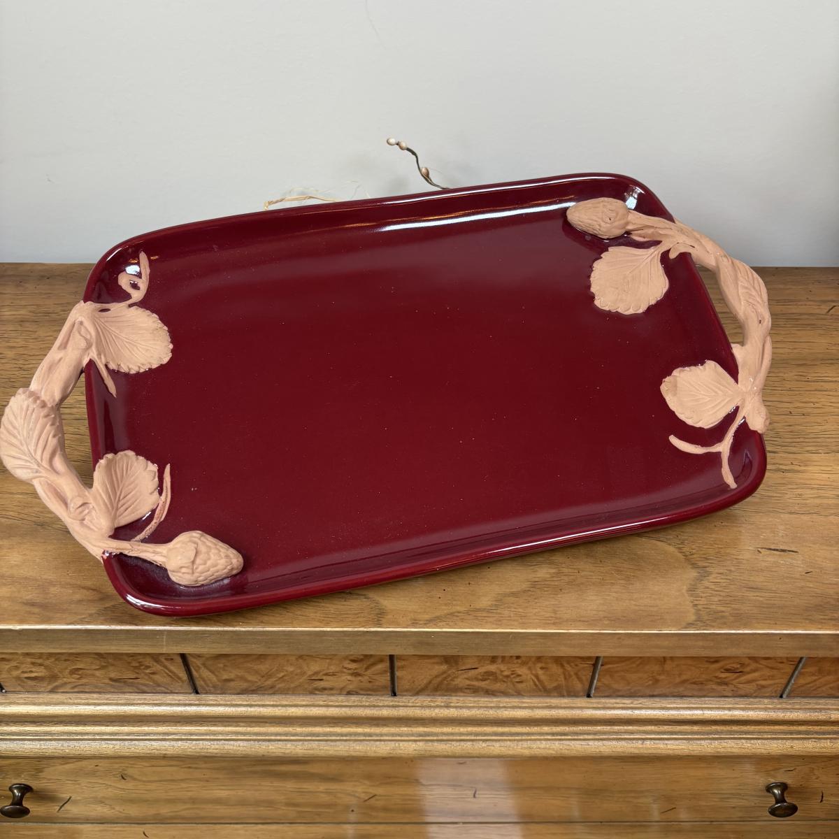 LOT 83: Kitchen Decor & More: Tracy Porter Chicken Figures, Green Drip Glaze Mugs, MKM Pottery Bottle, Stoneware Pitcher, Reddish/Brown Serving Platter w/Terra Cotta Handles