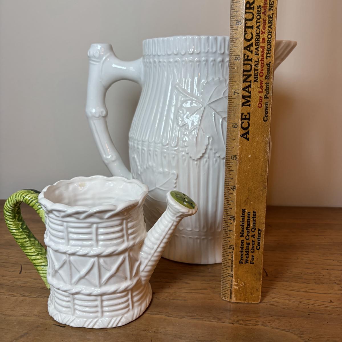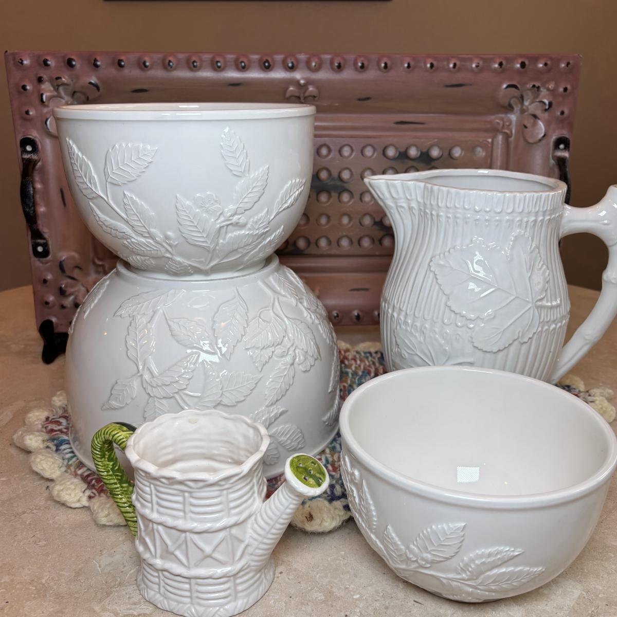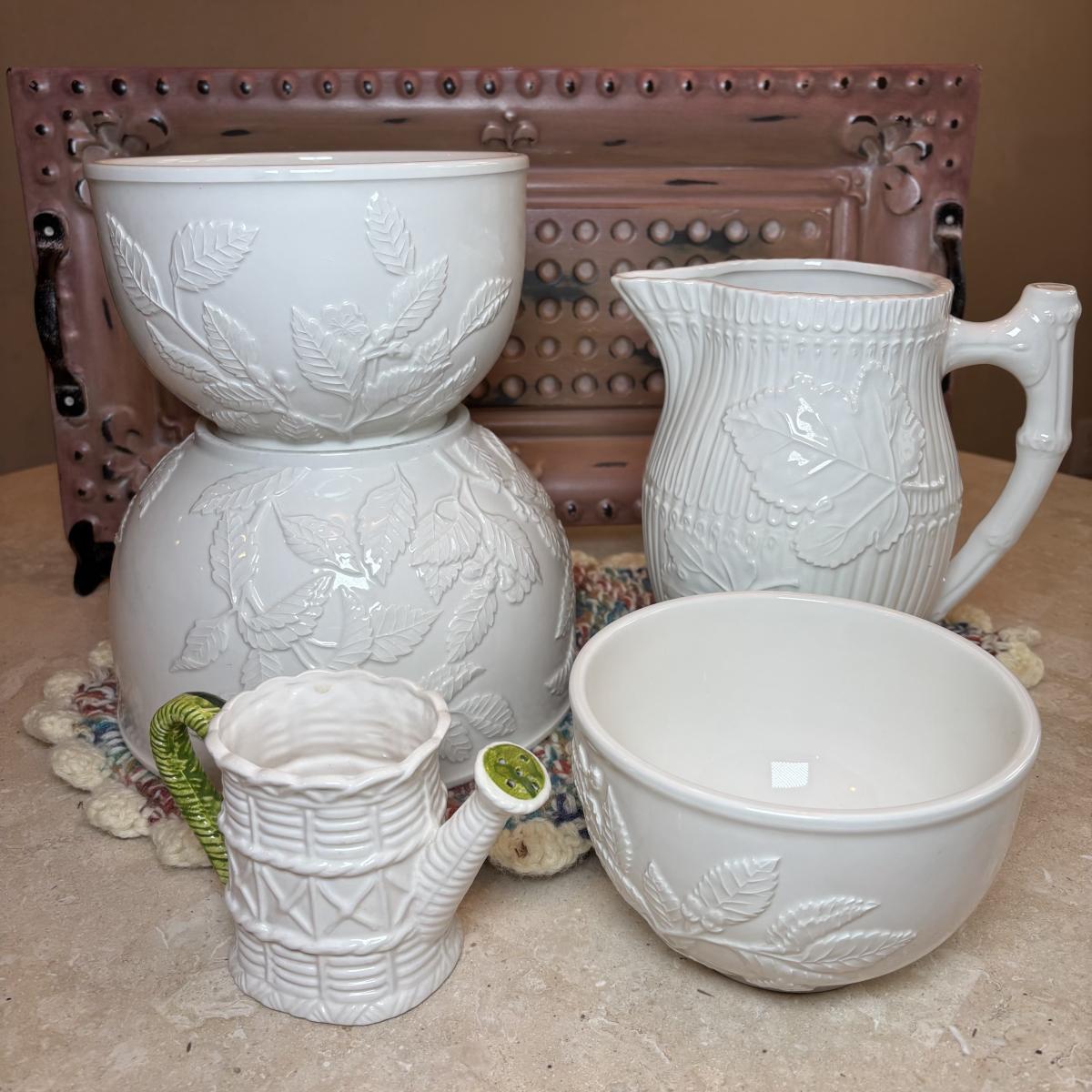 LOT 93: Charter Club Nesting Bowls, Metal Serving Tray, White Ceramic, Water Pitcher & Watering Can Vase