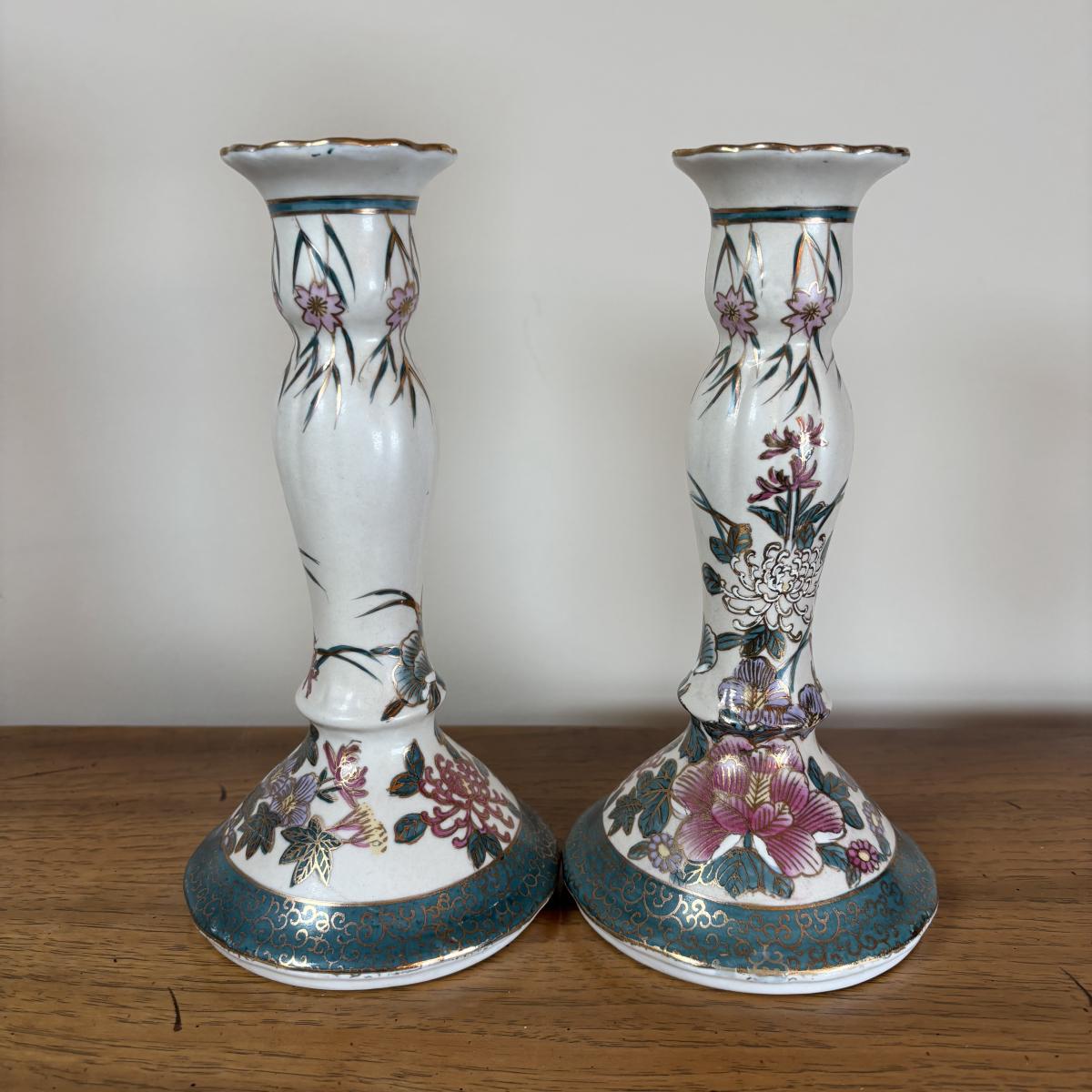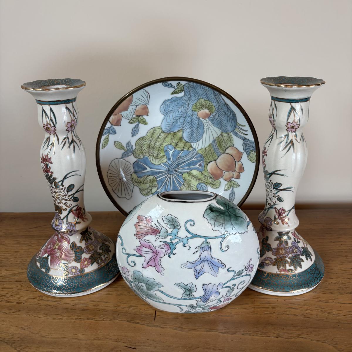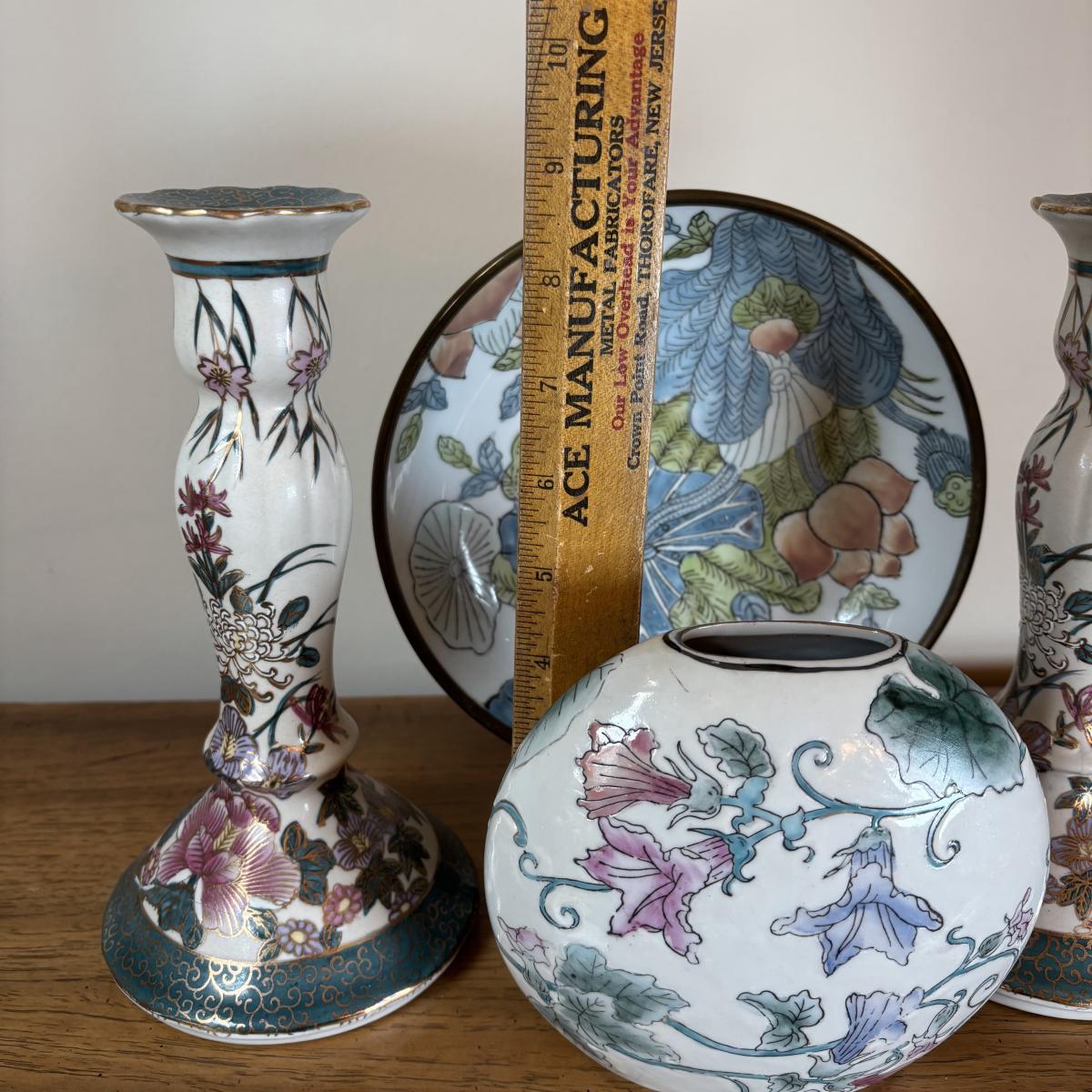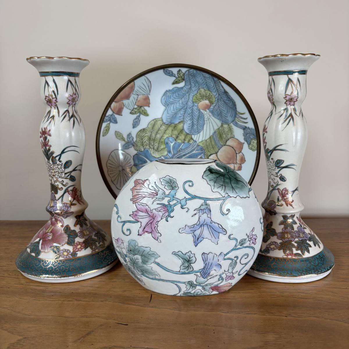 LOT 95: Floral Porcelain & Brass Bowl, G.A. Hong Kong Vase & Hand Painted Candlesticks