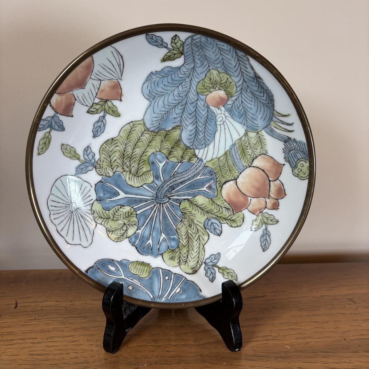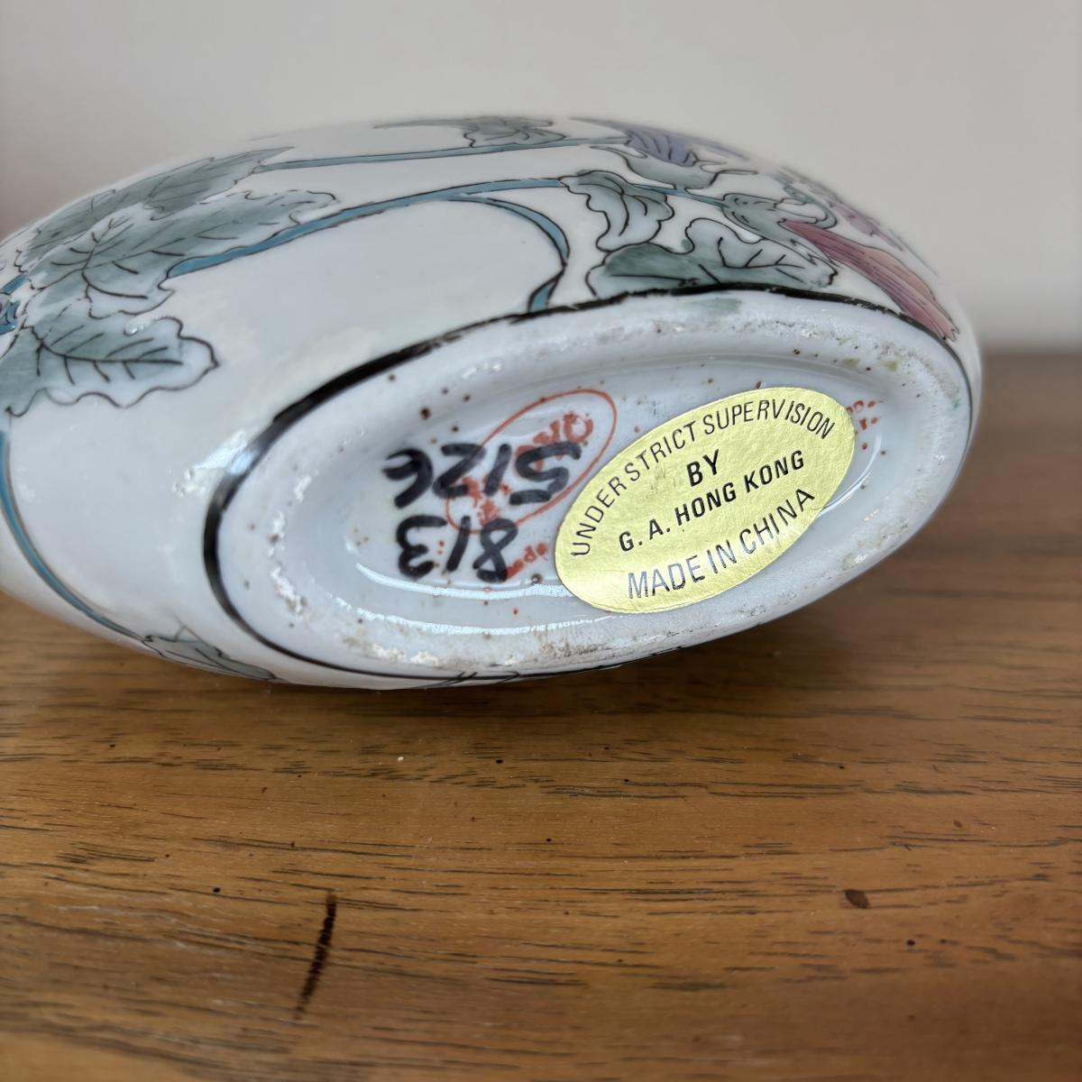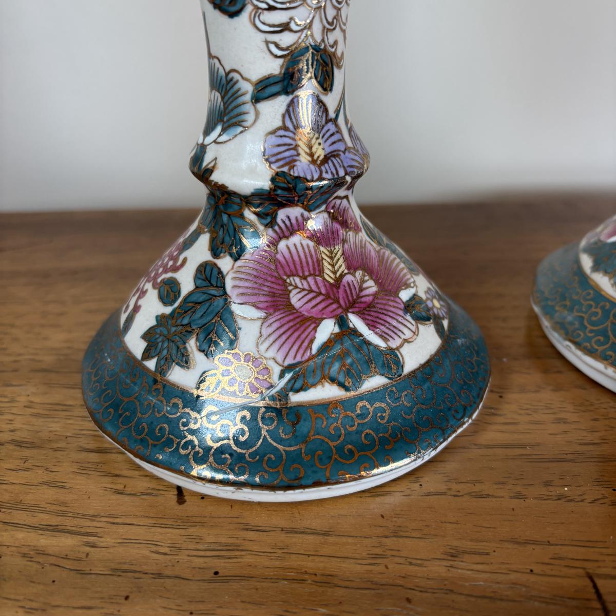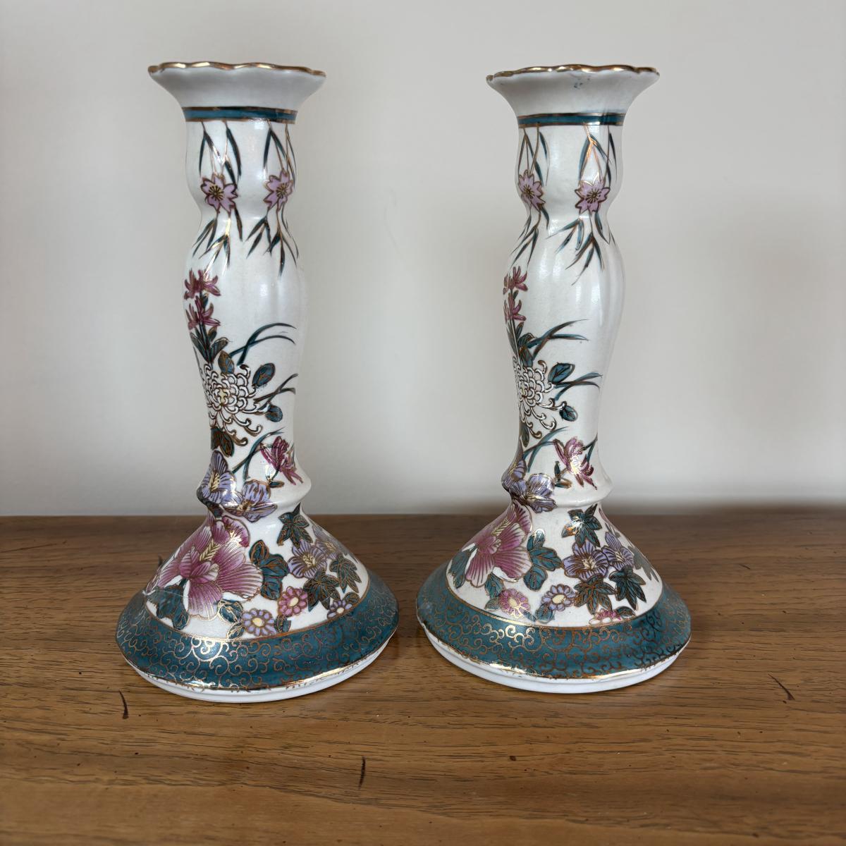 LOT 95: Floral Porcelain & Brass Bowl, G.A. Hong Kong Vase & Hand Painted Candlesticks