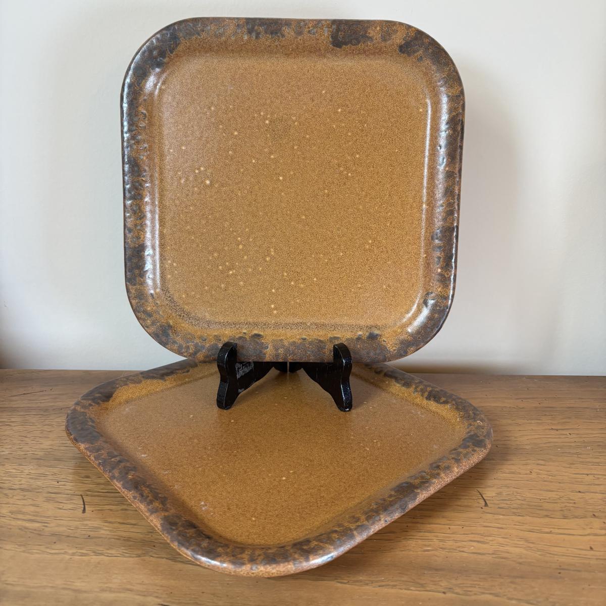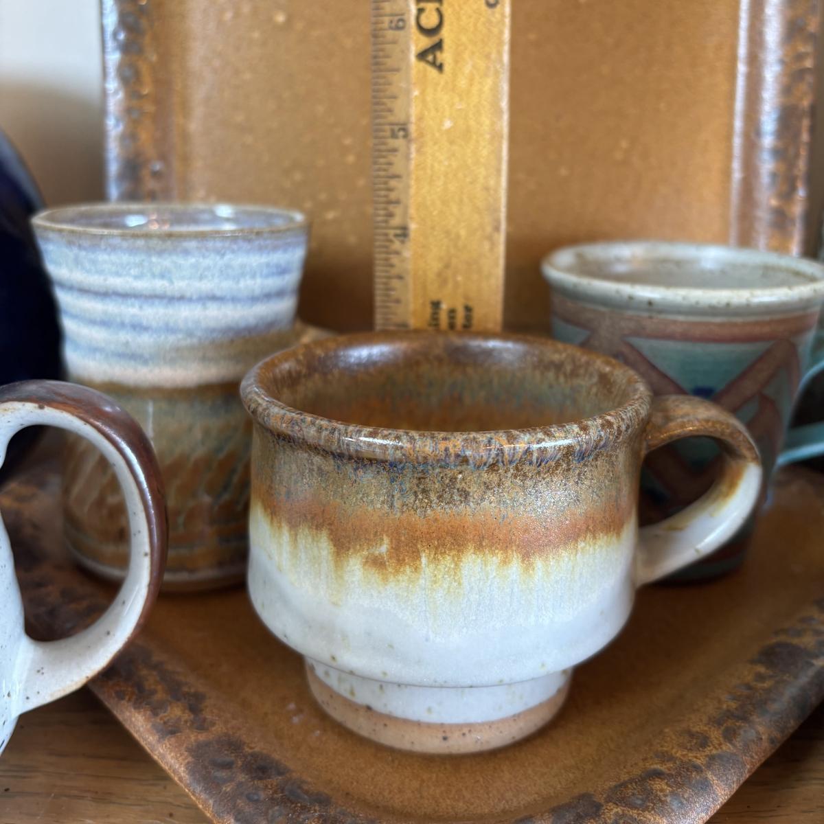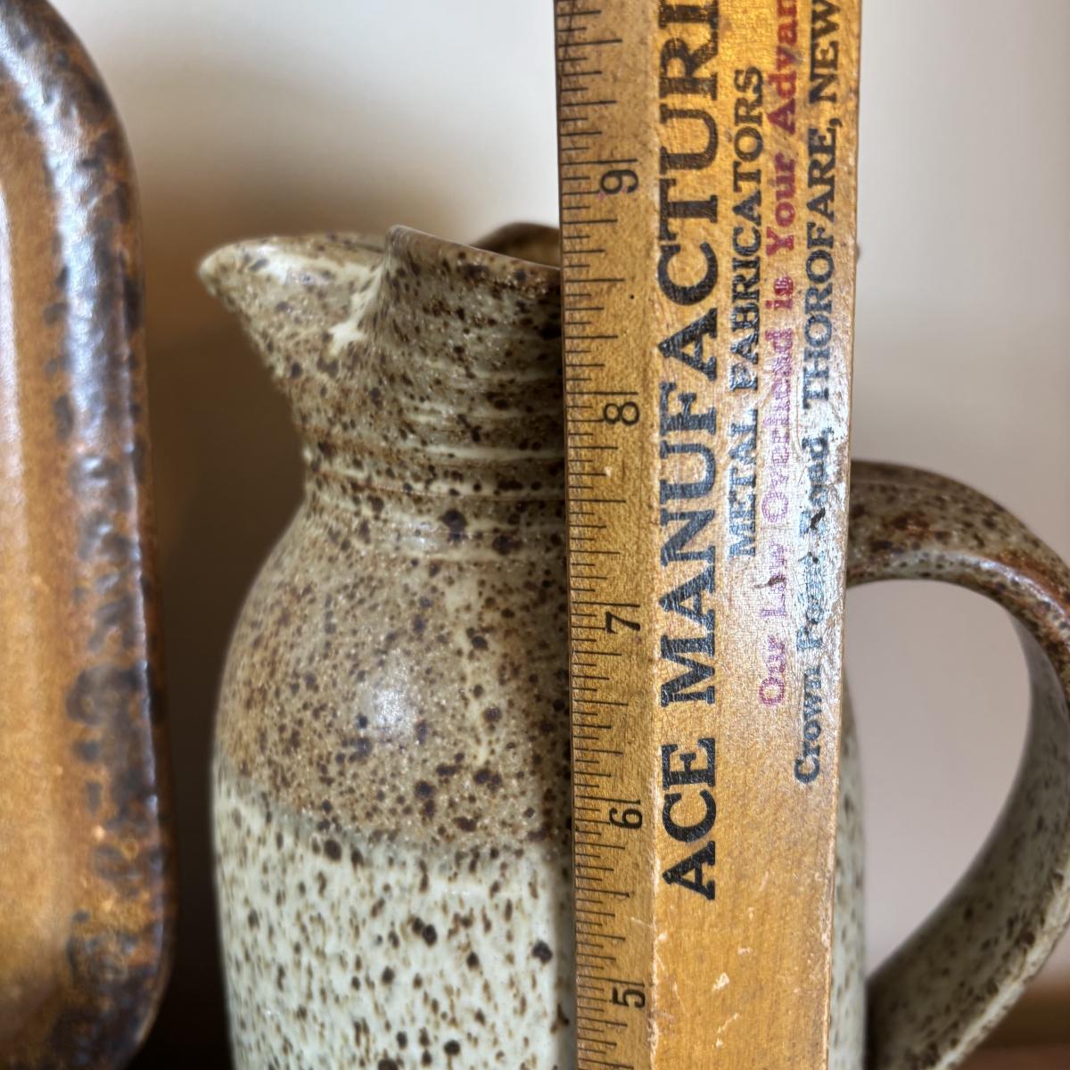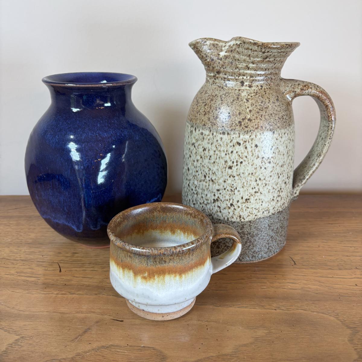 LOT 96: Pottery Collection: Blue Glaze Vase, Brown/Tan Speckled Pitcher, Square Plates & Mugs
