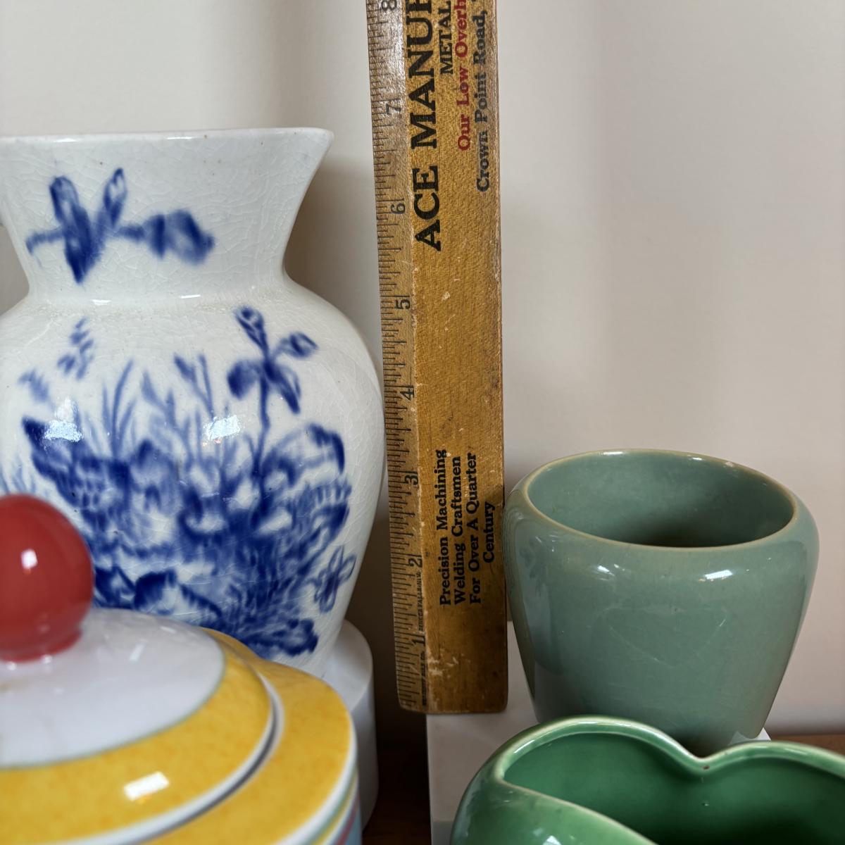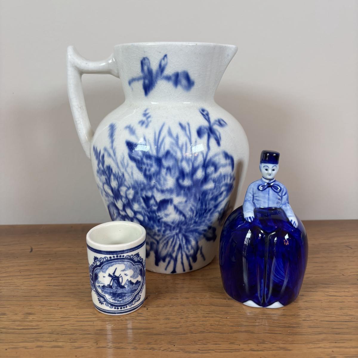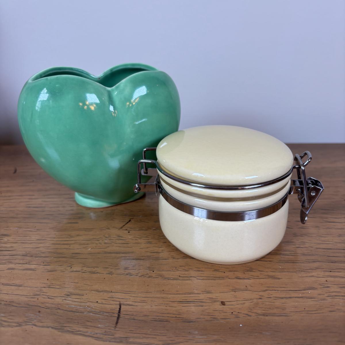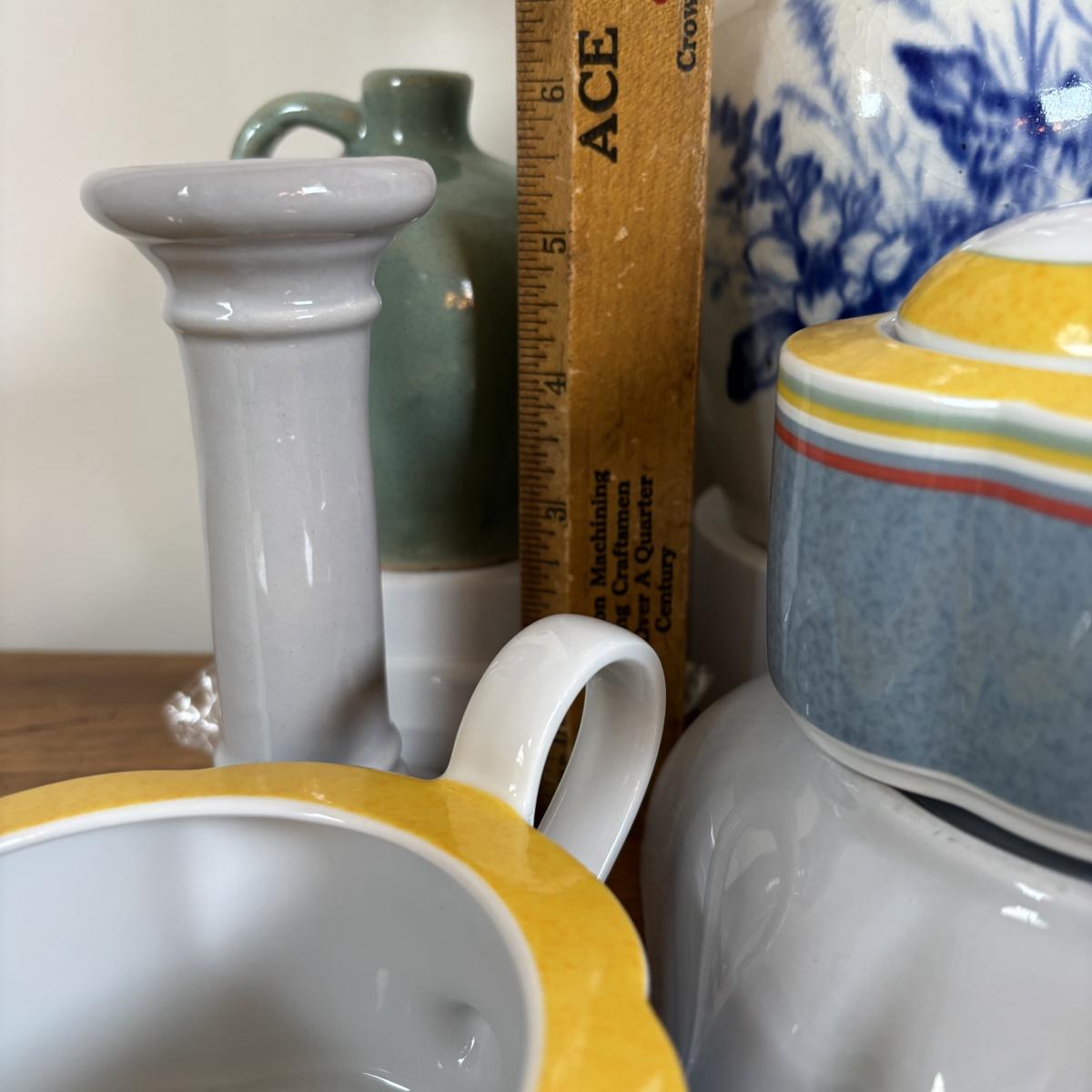 LOT 98: Delft Blue Dutch Boy & Toothpick Holder, OGGI Mini Yellow Canister, Villeroy & Boch Switch 1 (Ava, Caru, & Beala) Creamer & Sugar Bowl, Made in USA Green Vase & More