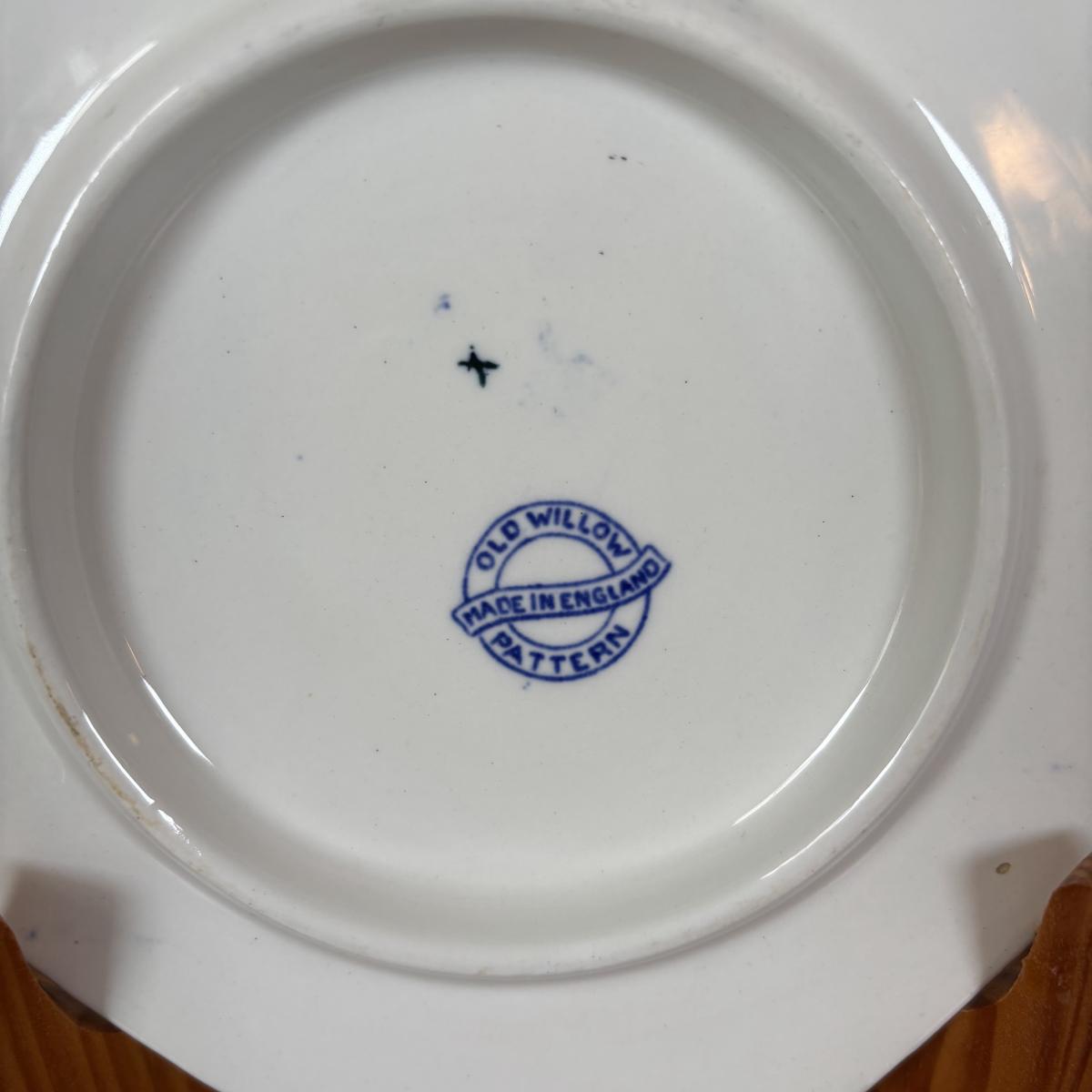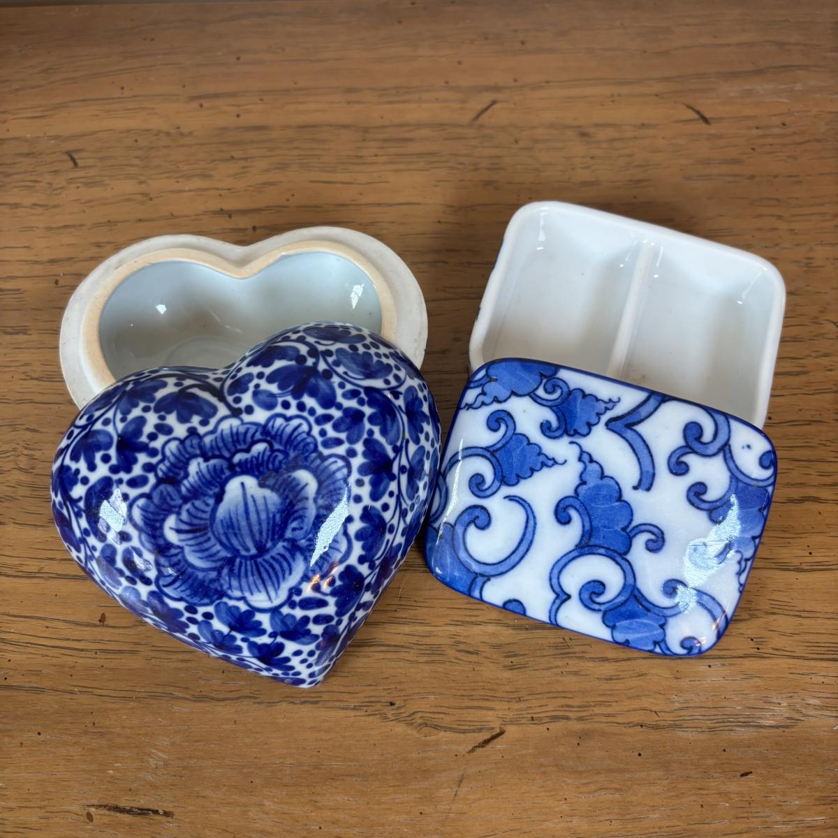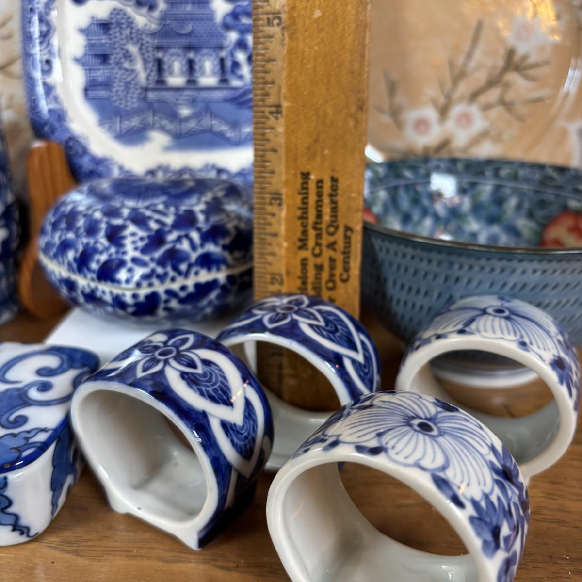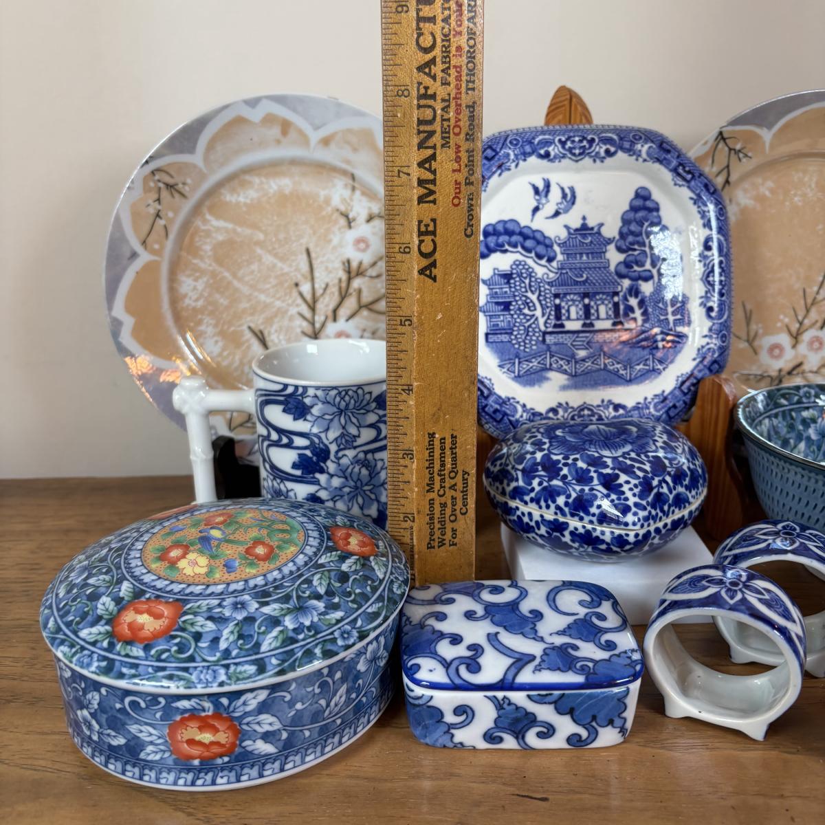 LOT 100: Vintage Old Willow Plate, England, 2-Hand Painted Lusterware Plates, Toyo Hand Painted Dresser Box &Bowl, Porcelain Trinket Boxes, Blue & White Porcelain Napkin Rings and a Vandor Mug