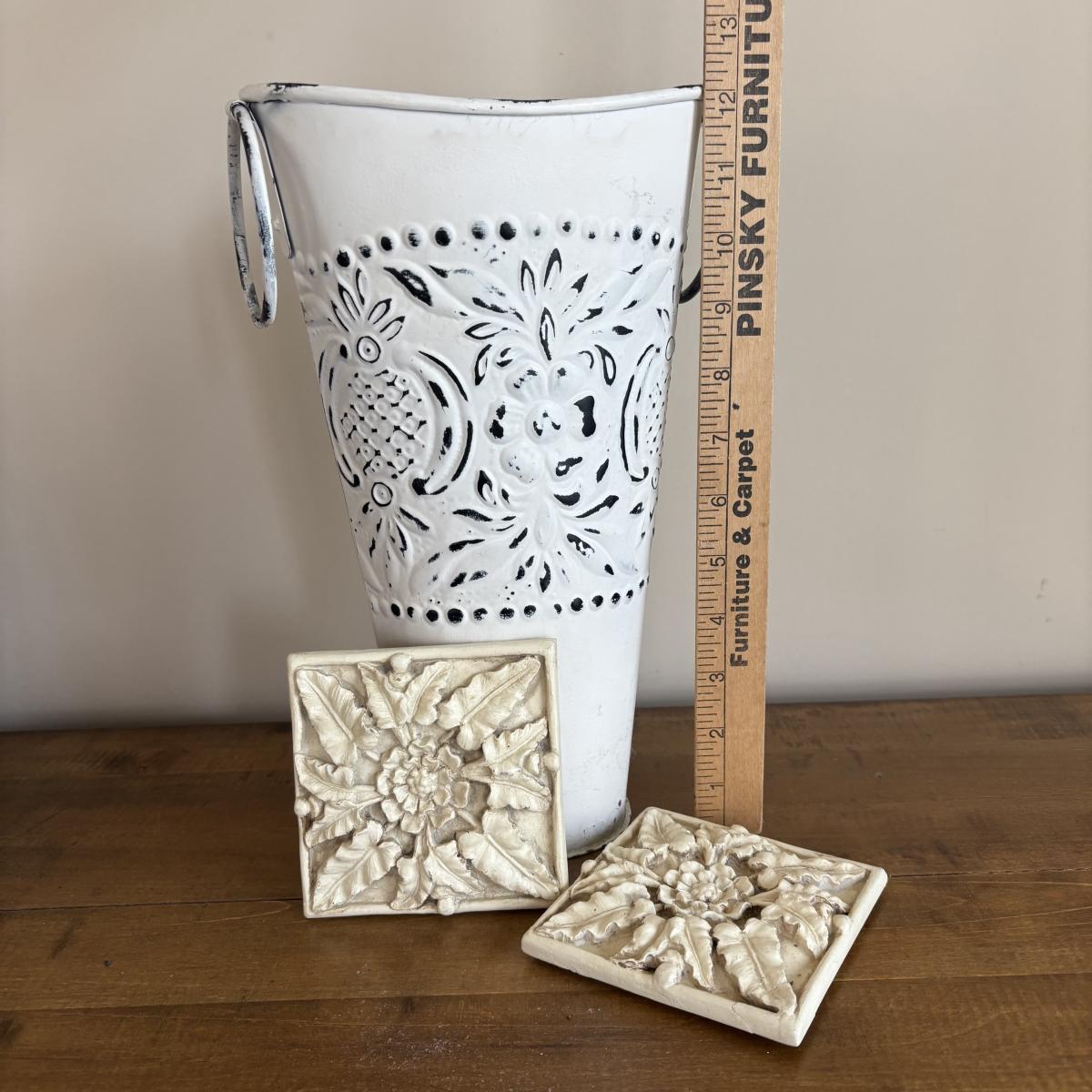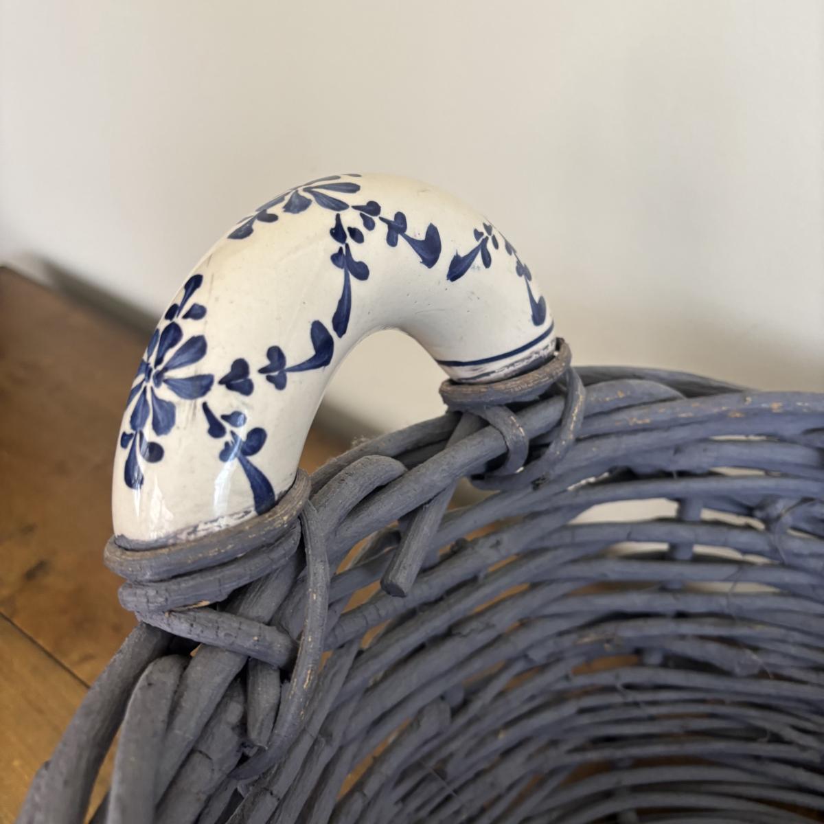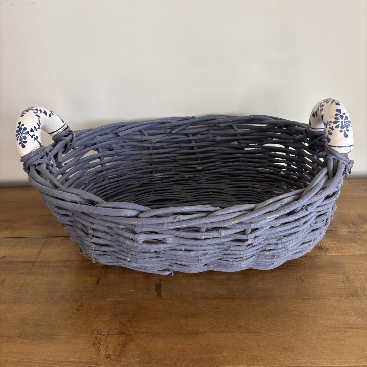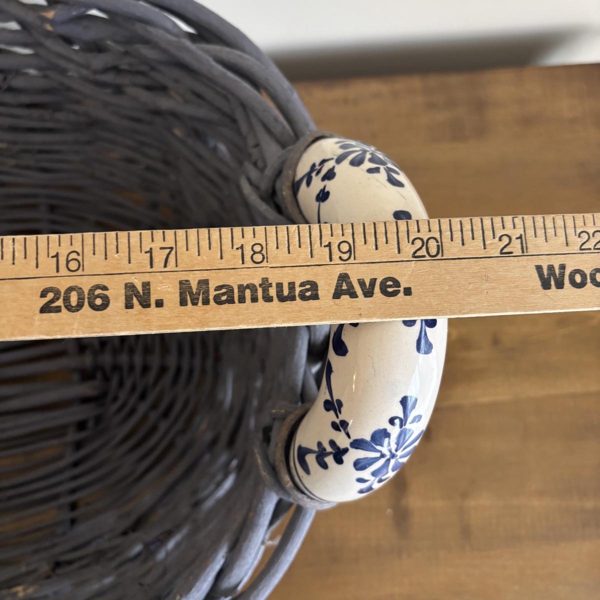 LOT 104: Large Blue Wicker Basket w/Ceramic Handles, LBK Berry Design Pitcher, Blue/White Candlesticks, Metal Flower Vase, Blue Glaze Planters