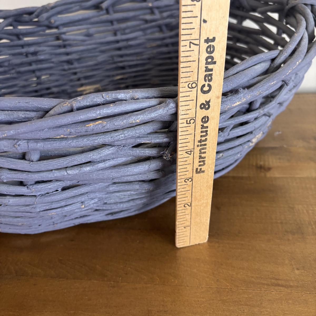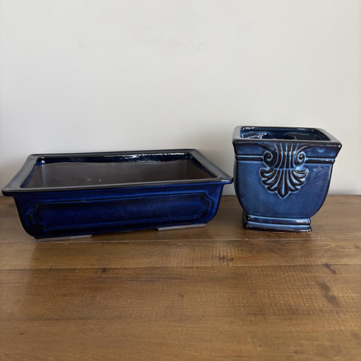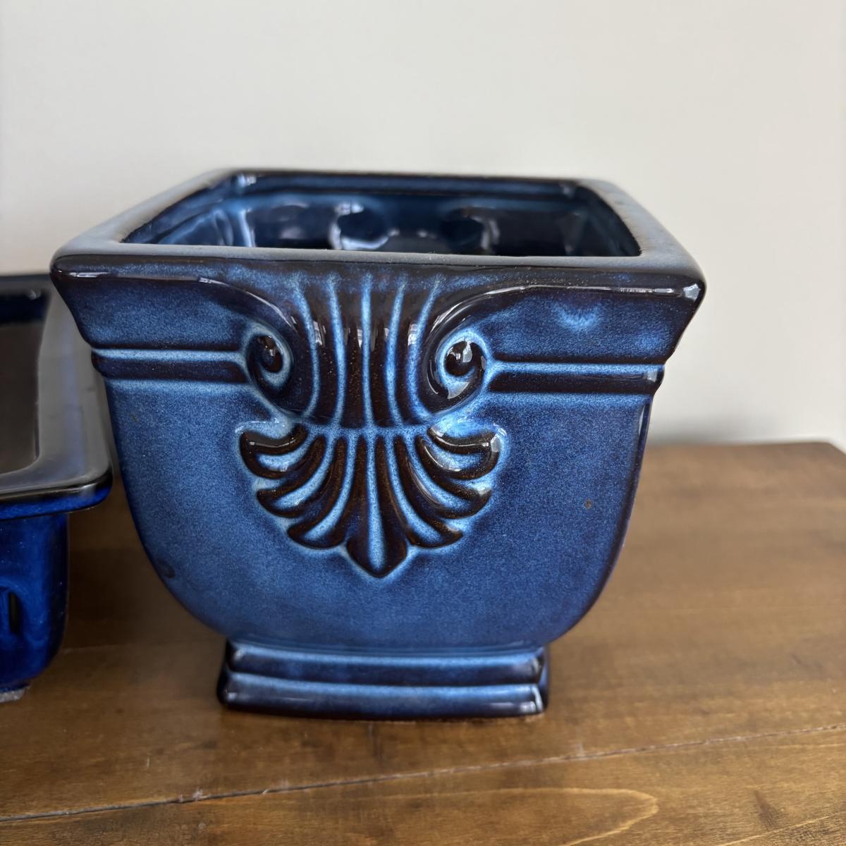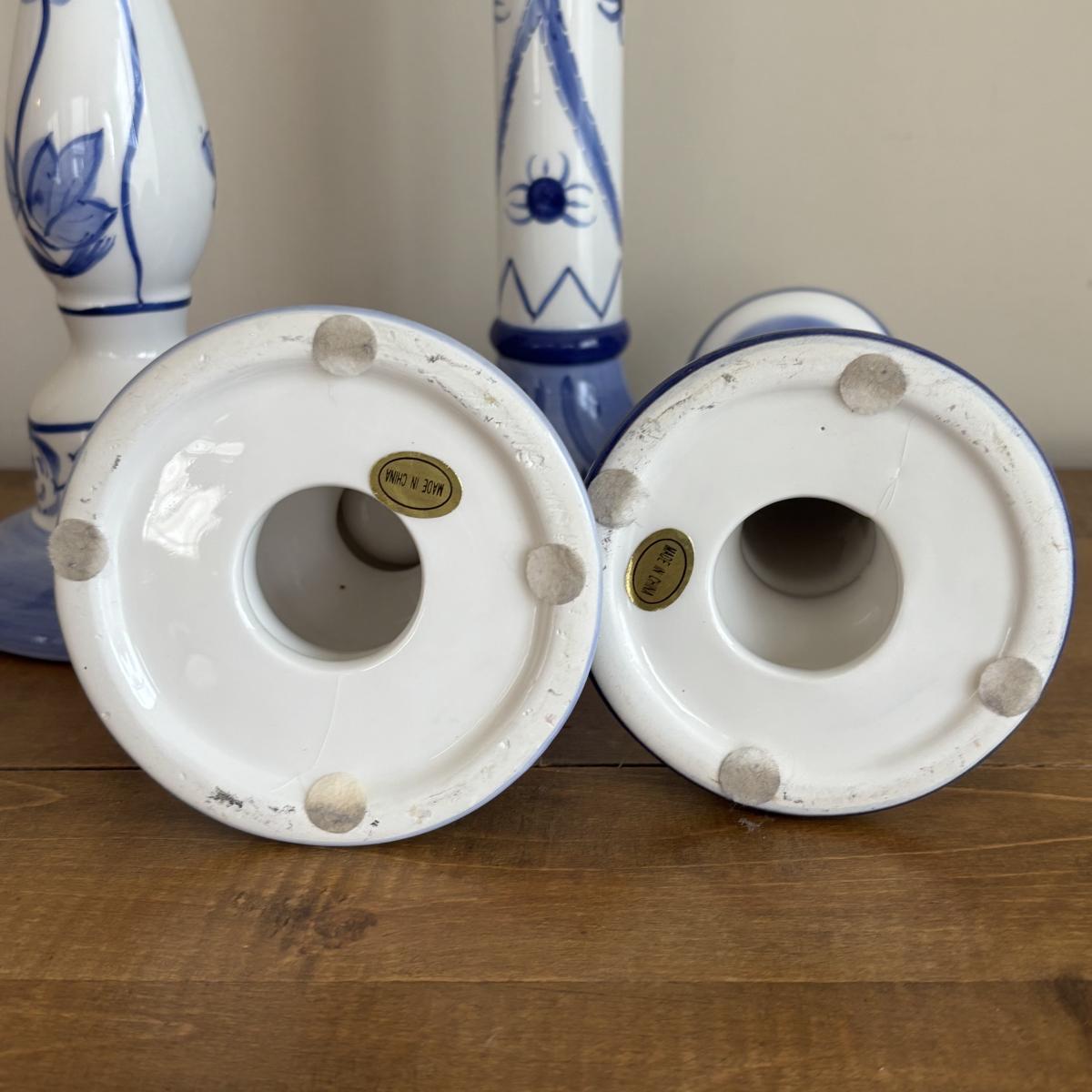 LOT 104: Large Blue Wicker Basket w/Ceramic Handles, LBK Berry Design Pitcher, Blue/White Candlesticks, Metal Flower Vase, Blue Glaze Planters