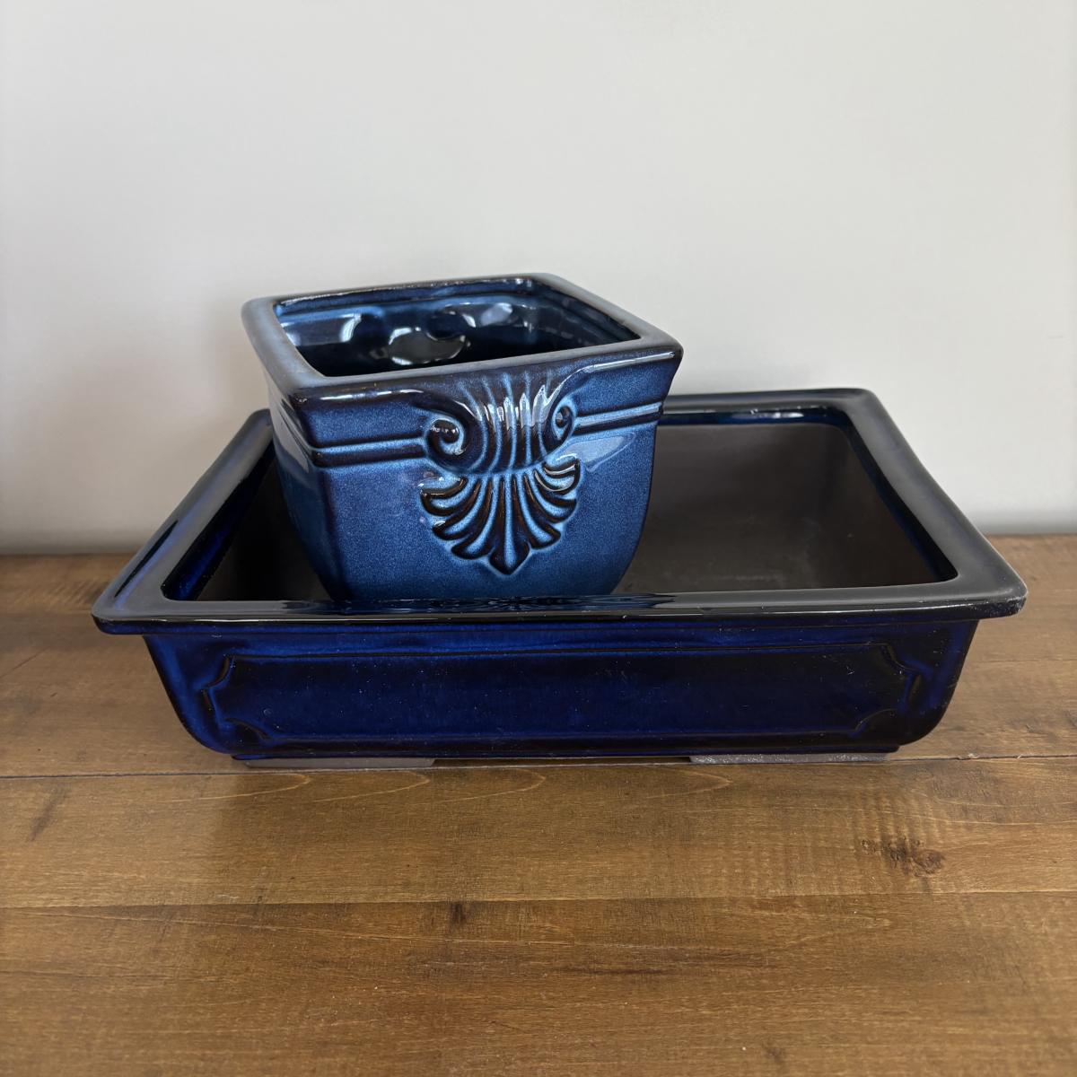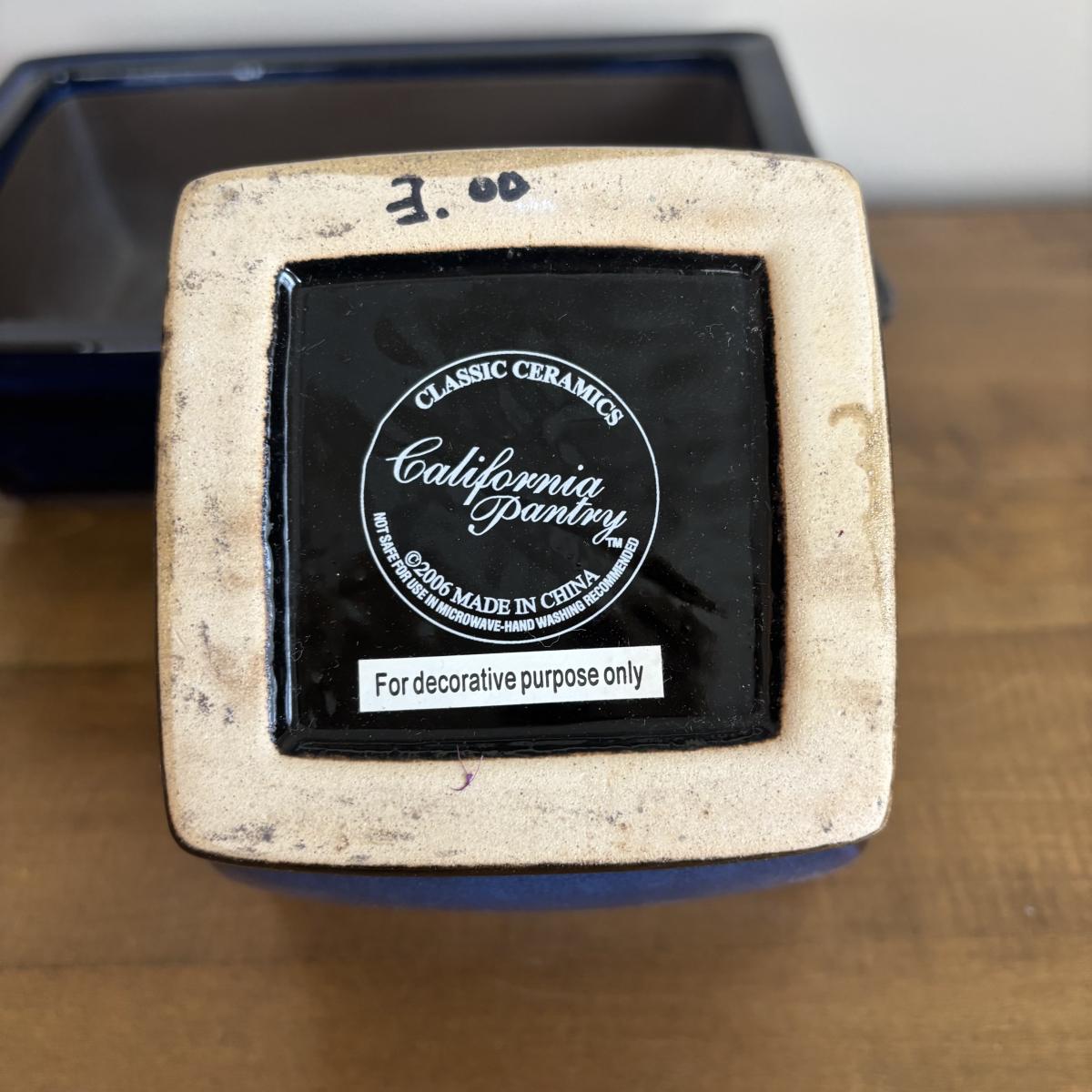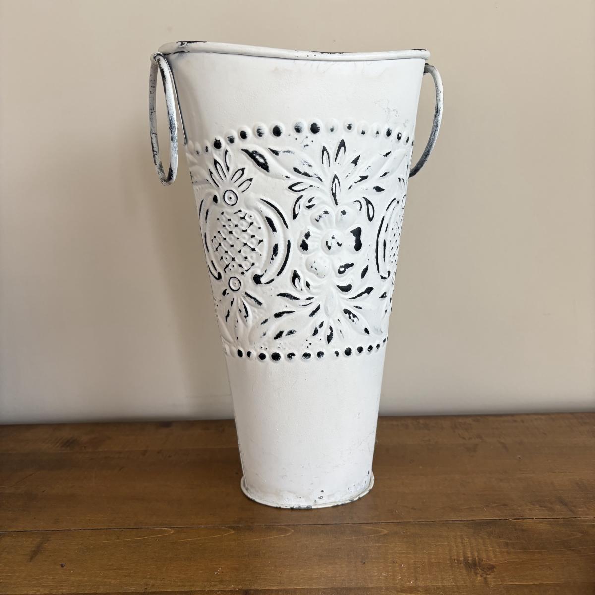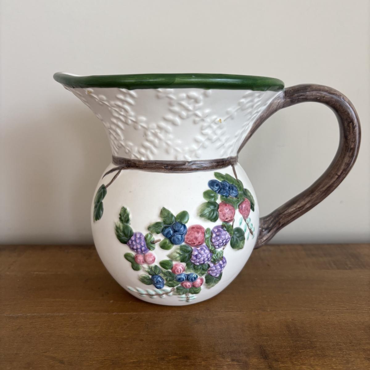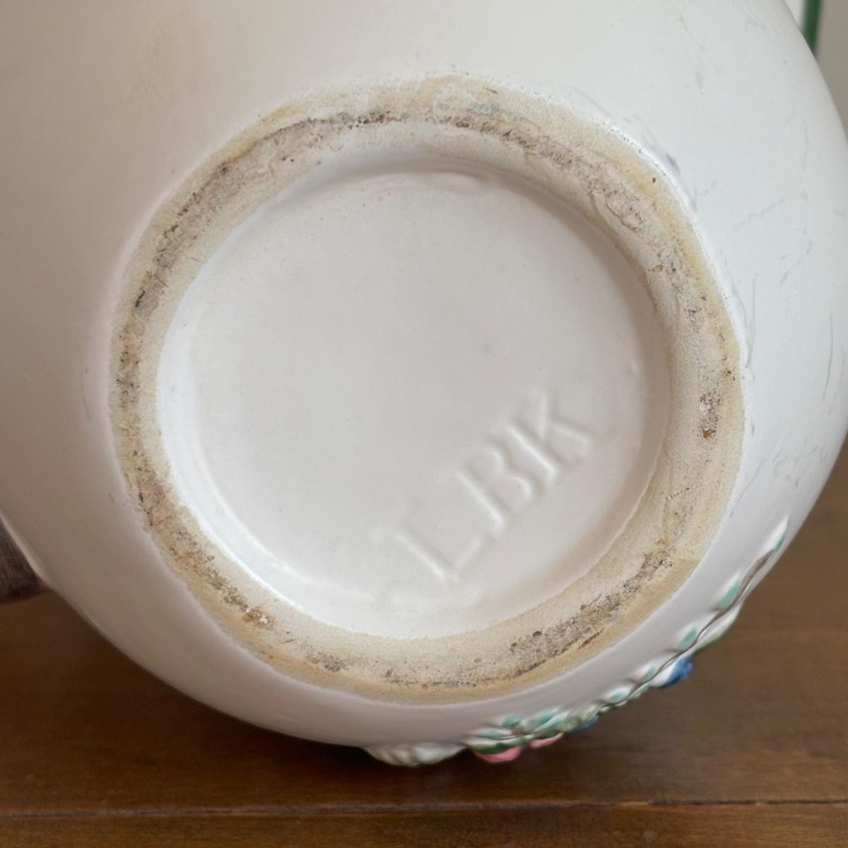 LOT 104: Large Blue Wicker Basket w/Ceramic Handles, LBK Berry Design Pitcher, Blue/White Candlesticks, Metal Flower Vase, Blue Glaze Planters
