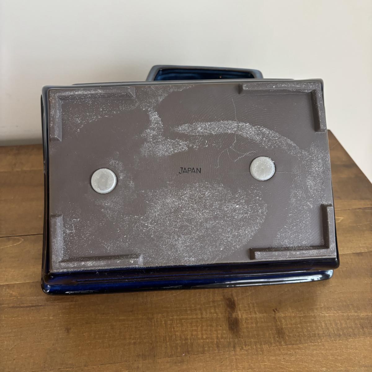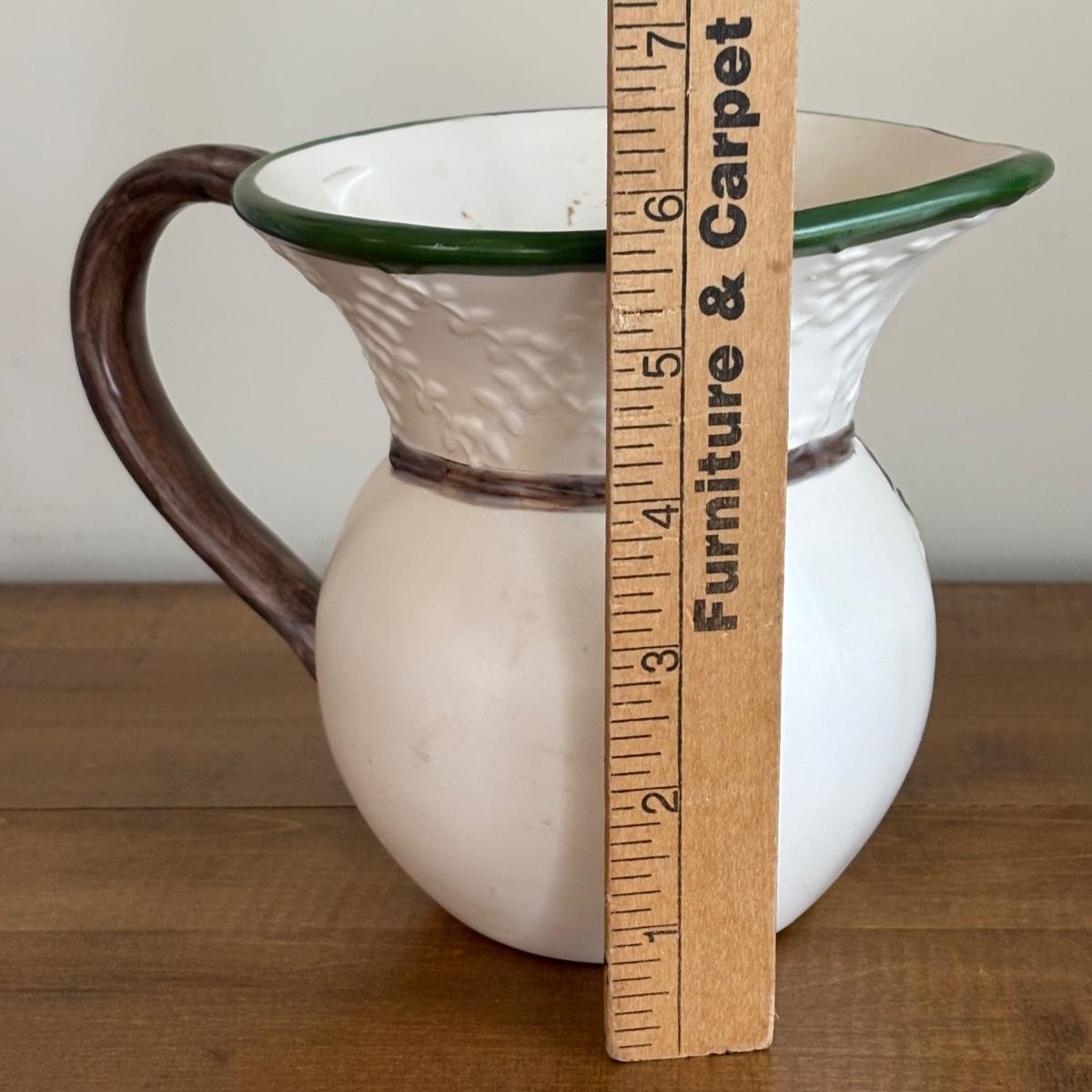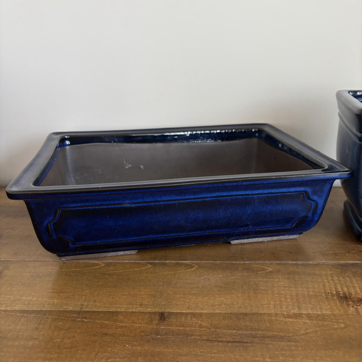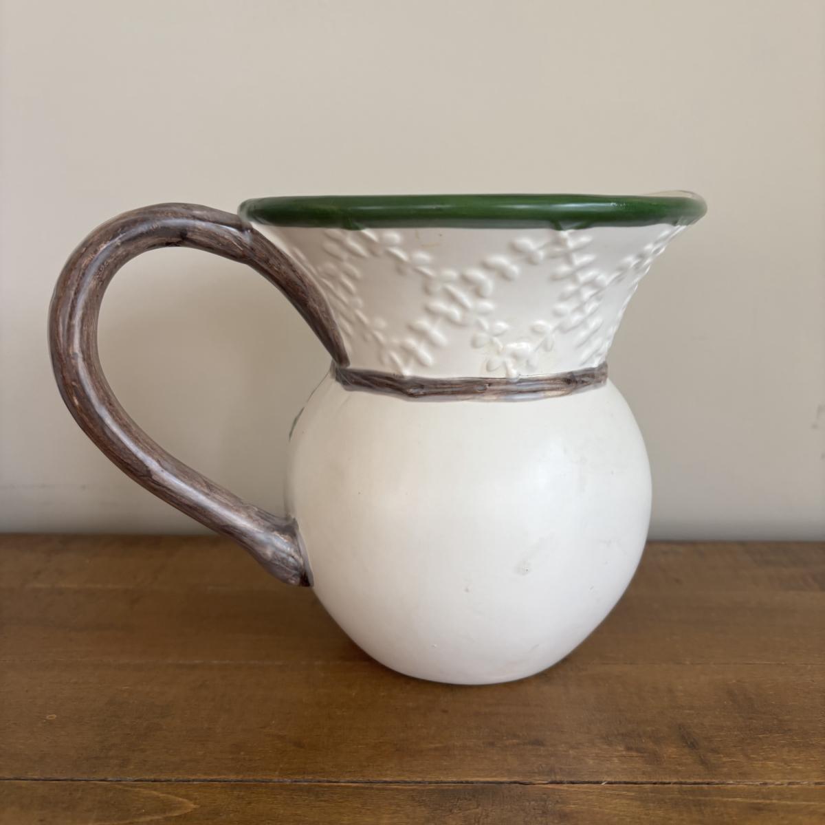 LOT 104: Large Blue Wicker Basket w/Ceramic Handles, LBK Berry Design Pitcher, Blue/White Candlesticks, Metal Flower Vase, Blue Glaze Planters