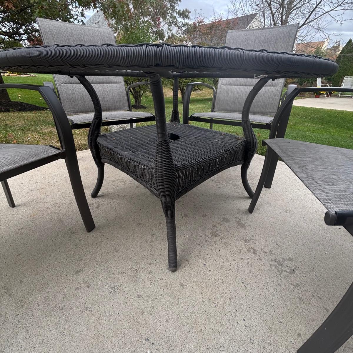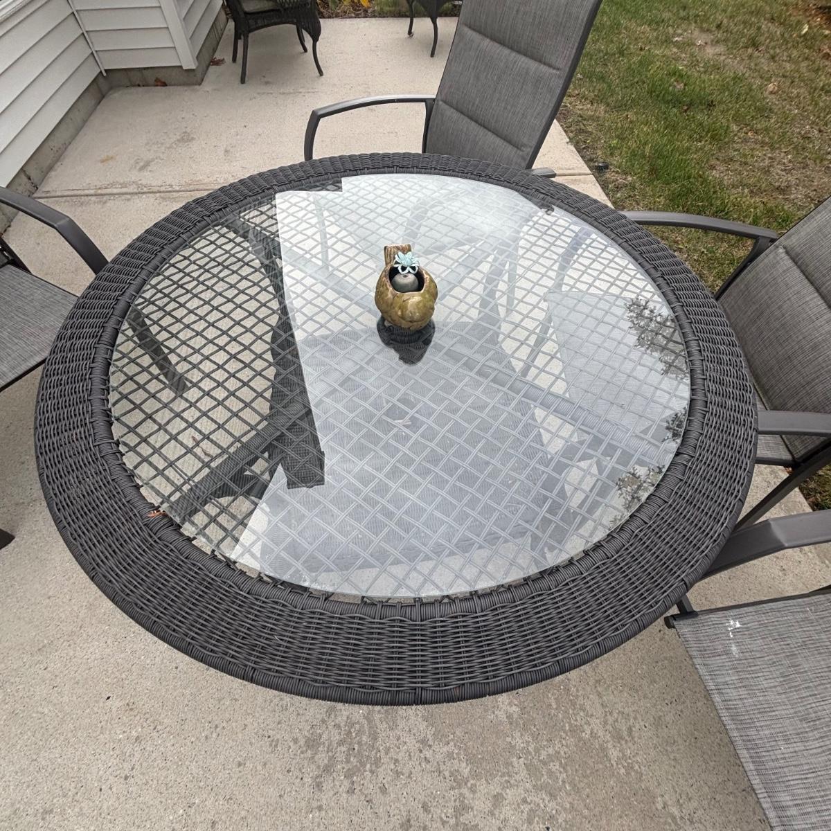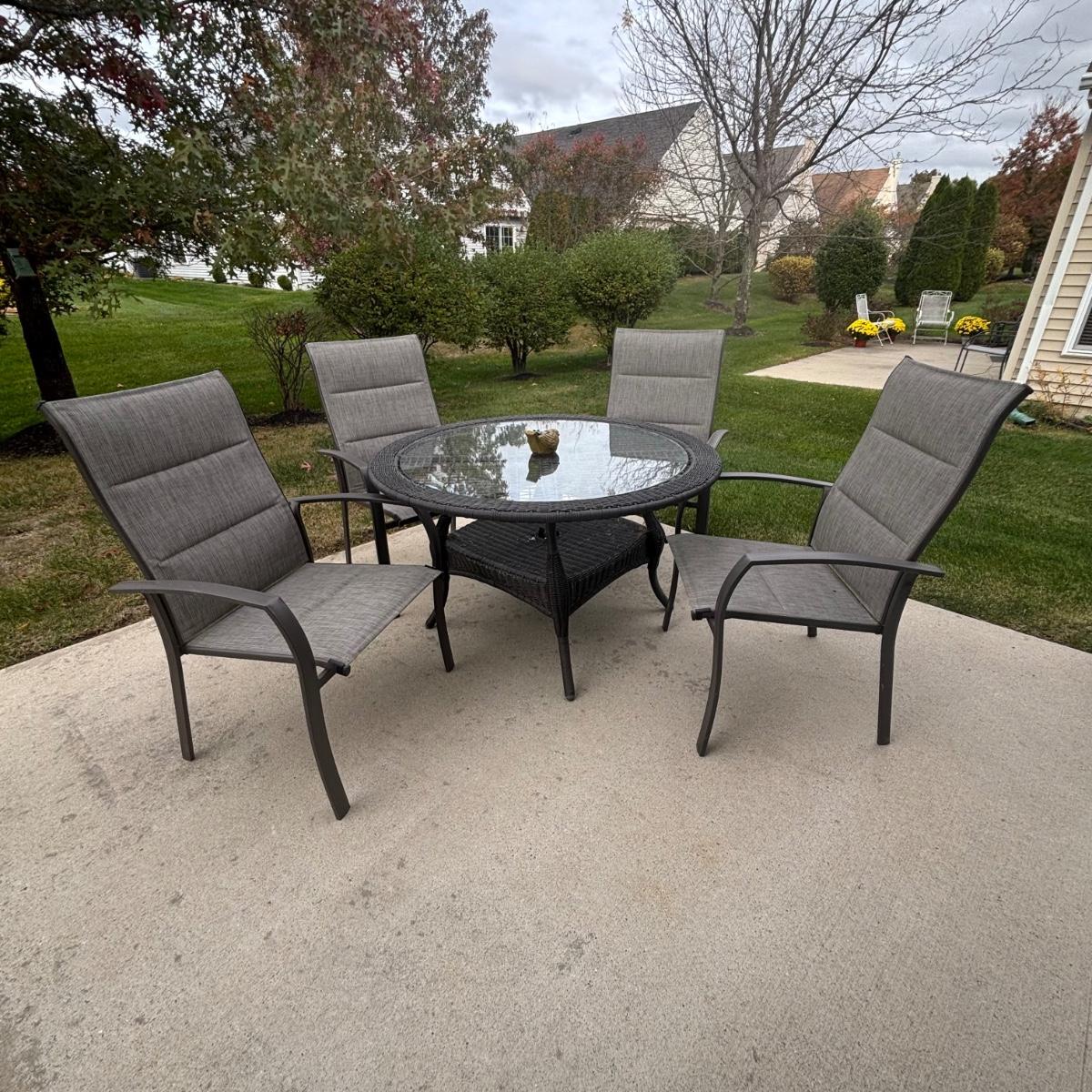 LOT 105: Stylewell Outdoor Patio Chairs along with a Round Wicker & Glass Patio Table