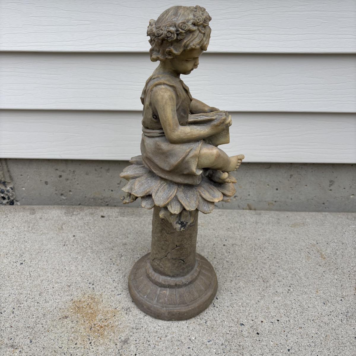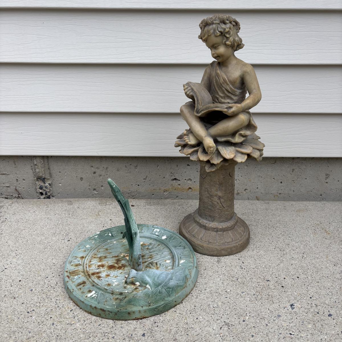 LOT 107: Cast Iron Sundial and Resin Cherub Reading a Book Garden Statue