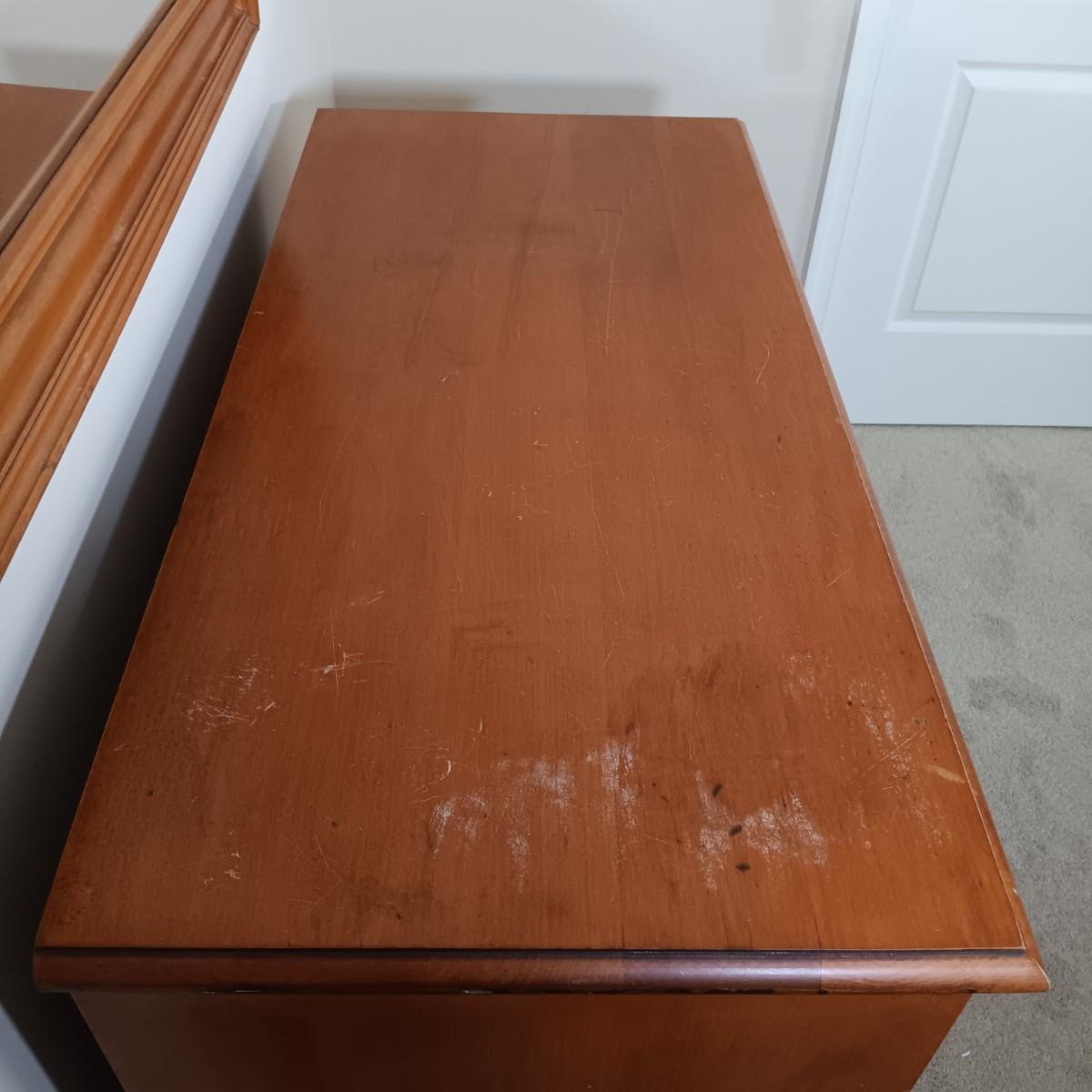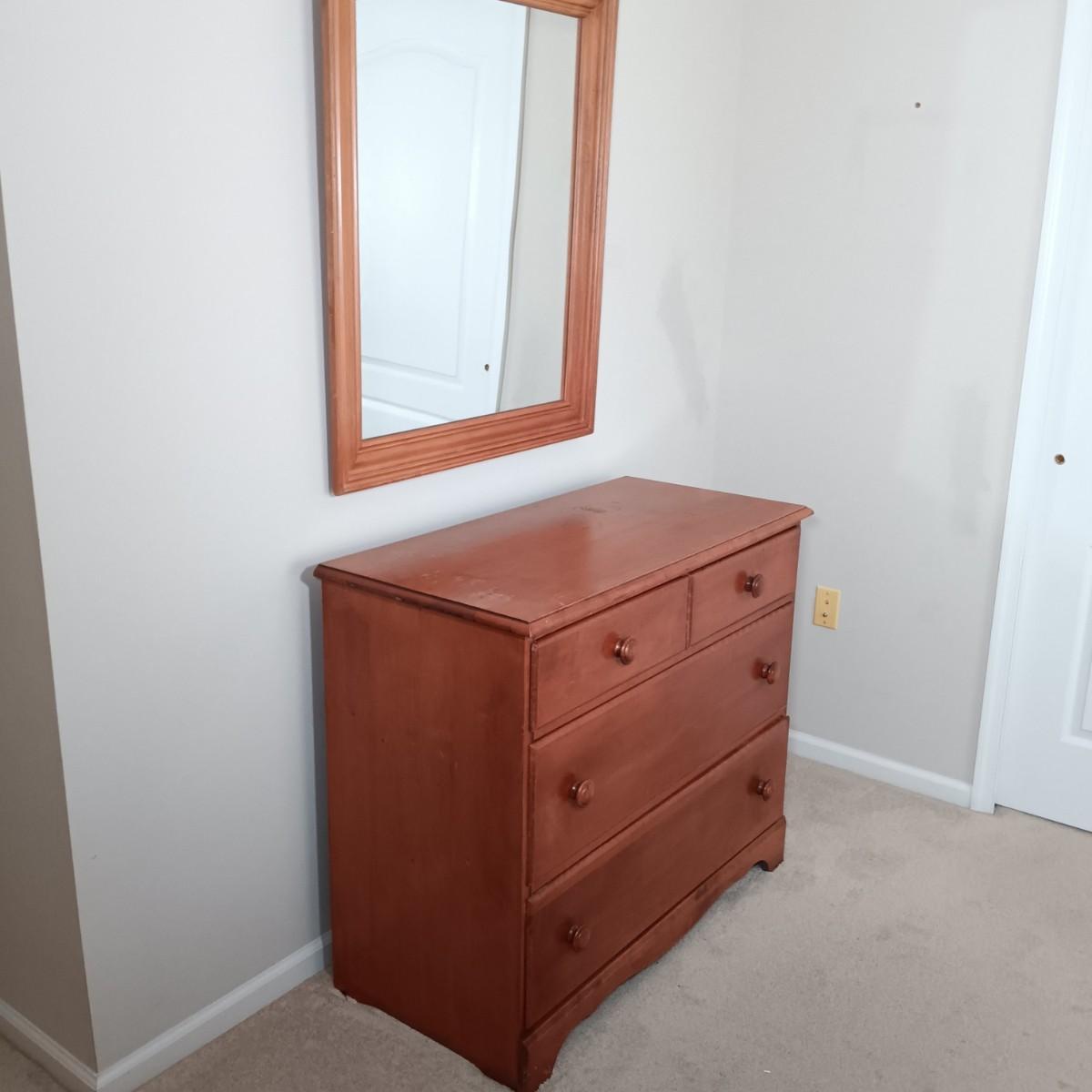 LOT 123: Wood Headboard, Framed Mirror and Dresser