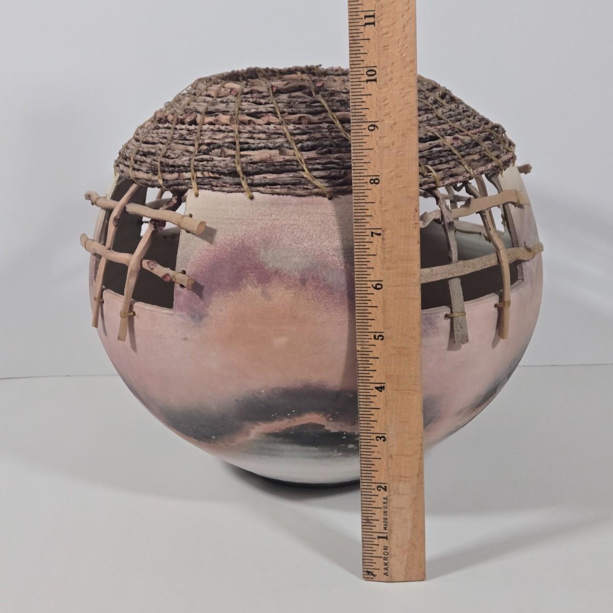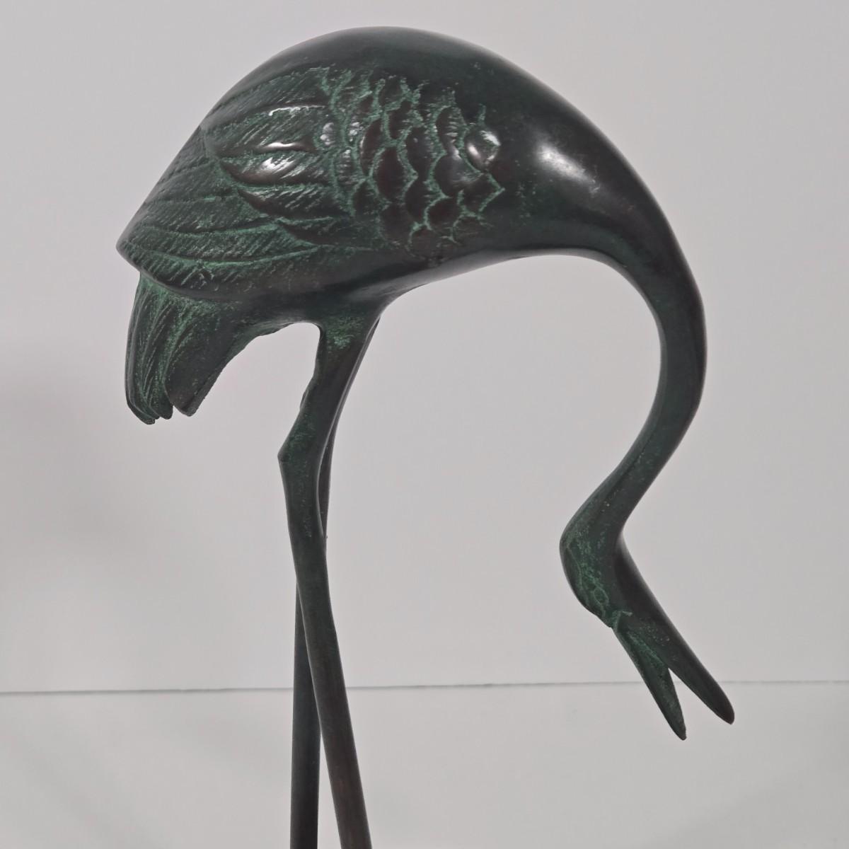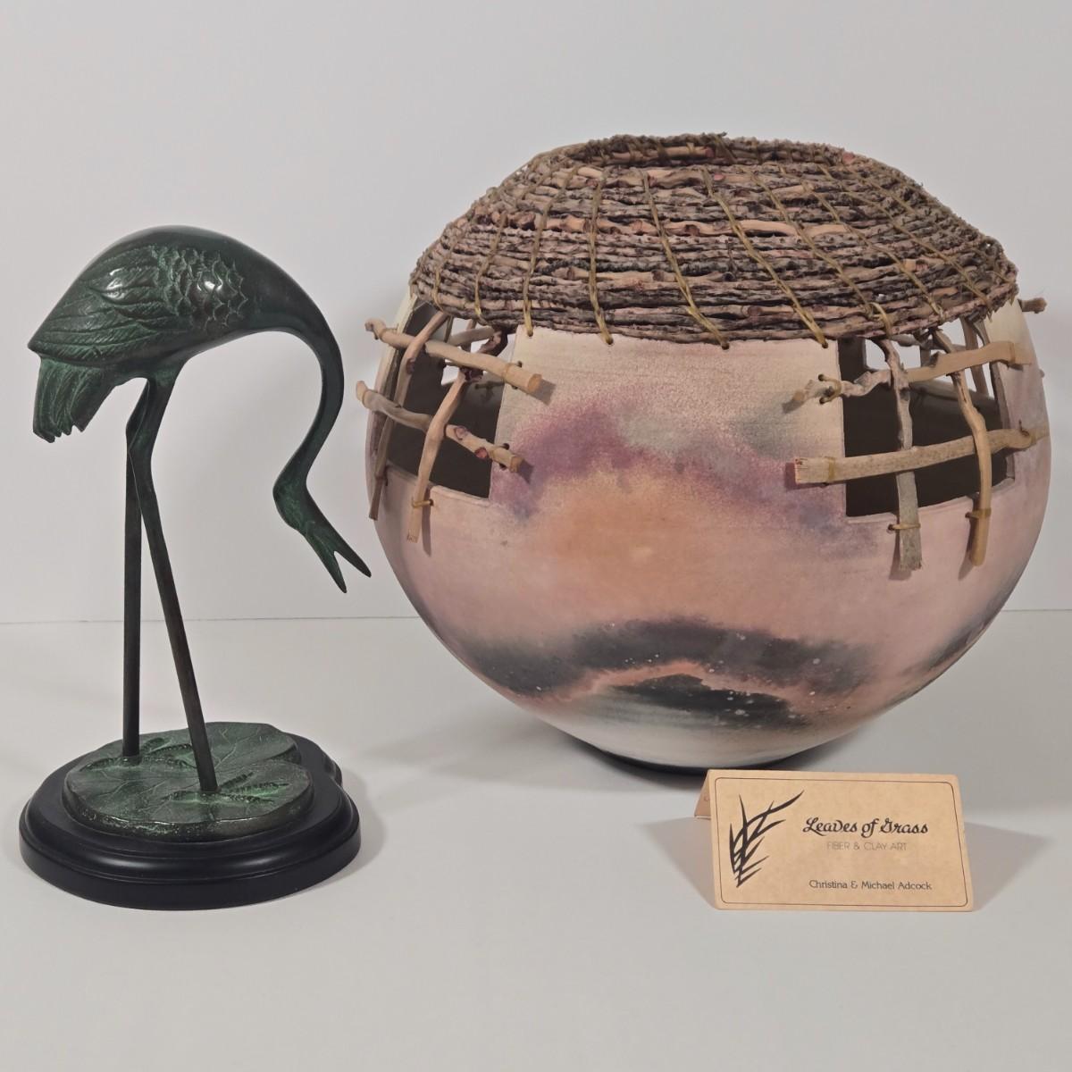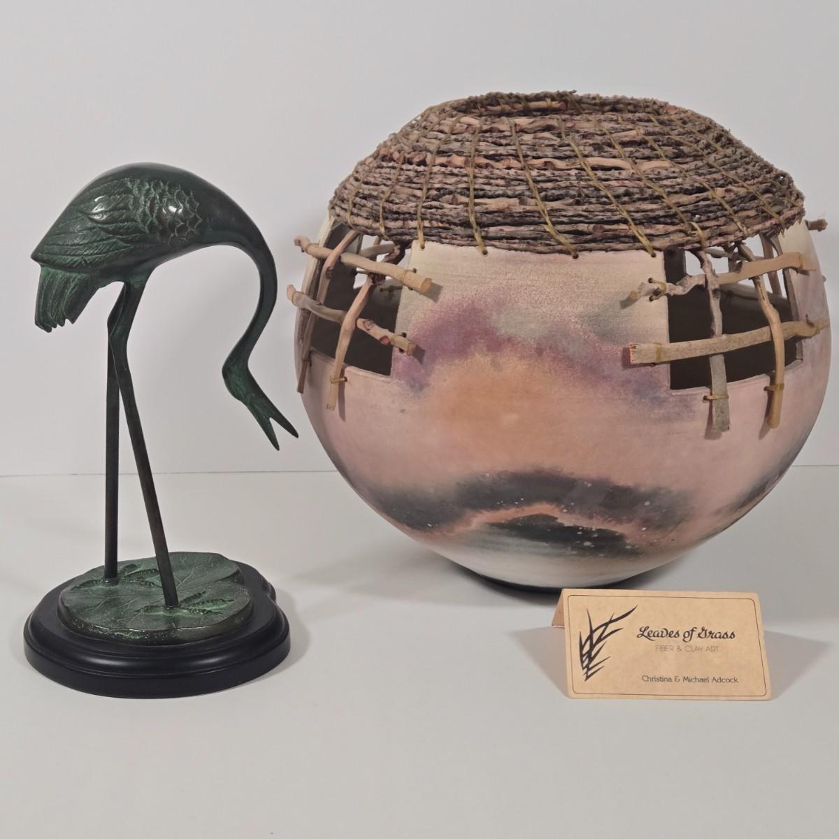 LOT 22Z: Leaves of Grass Signed Adcock Pottery Bowl and Bronze Crane Statue
