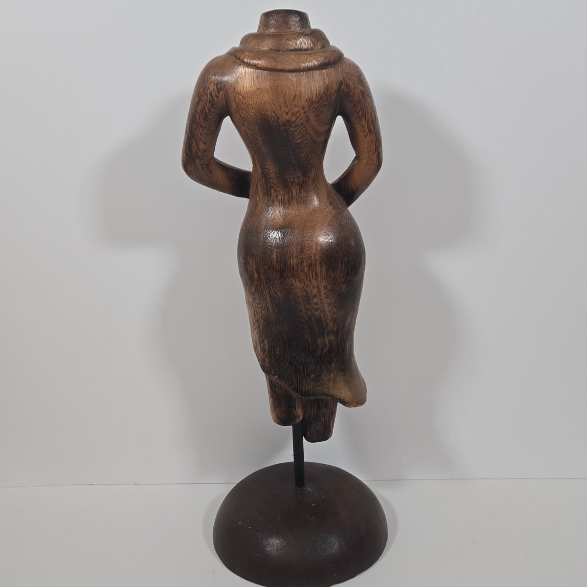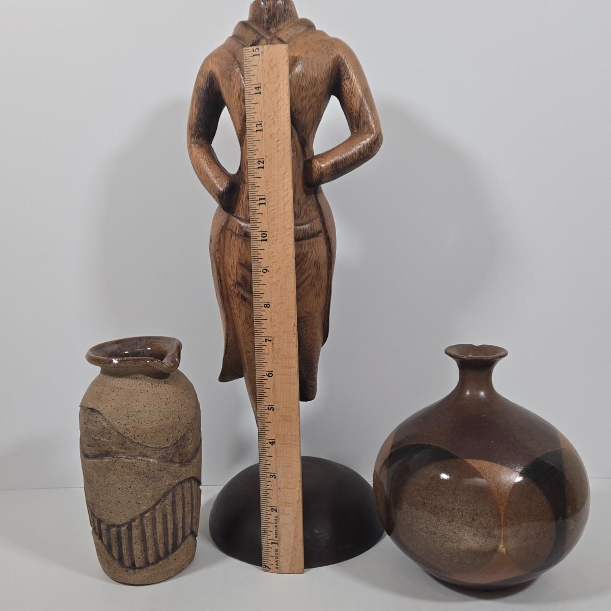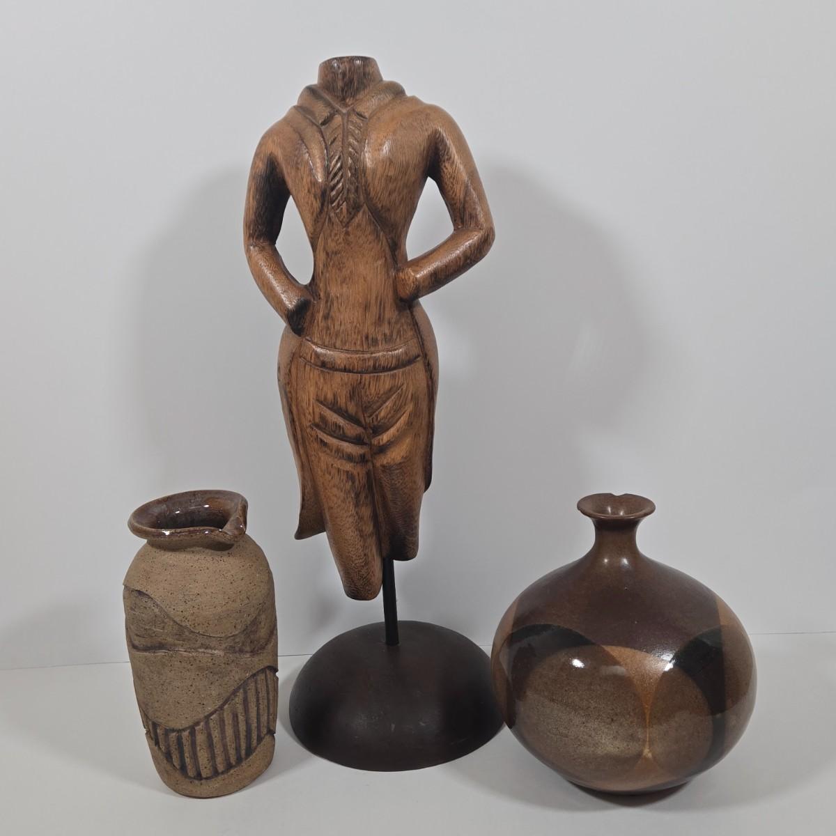 LOT 32Z: Wooden Torso Figurine, Pottery Jar with Spout, and Round Vase