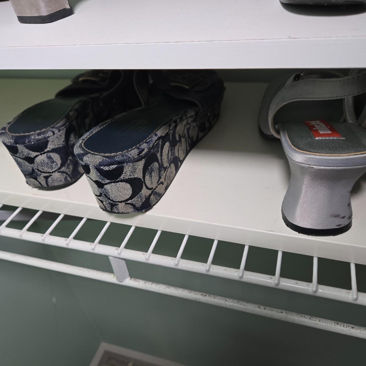 LOT 40X: Young Ladies Closet Lot Including Shoe Shelf, White Sweater Shelf, Shoes, Formal Dresses, Plastic Drawer Unit, Boots, and More