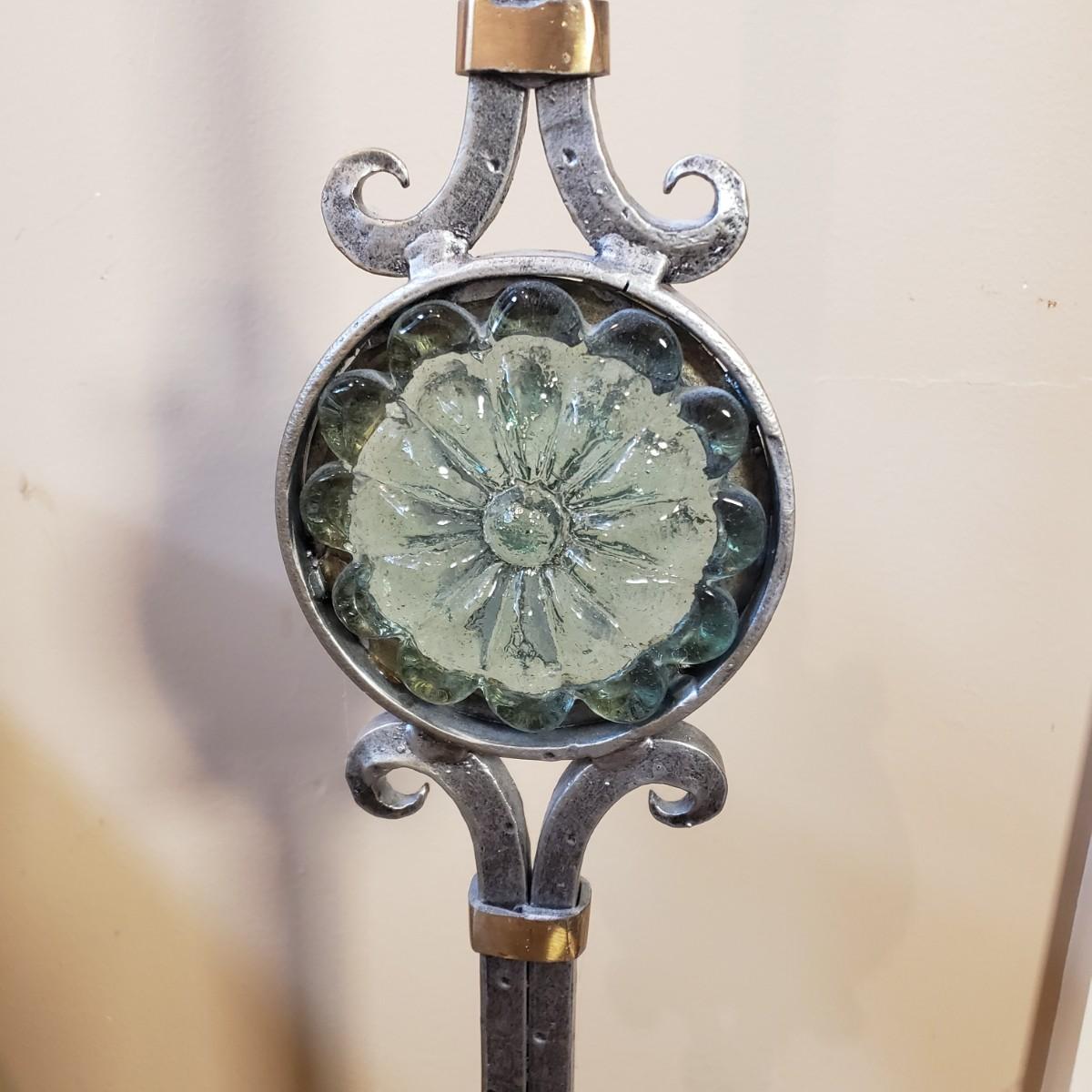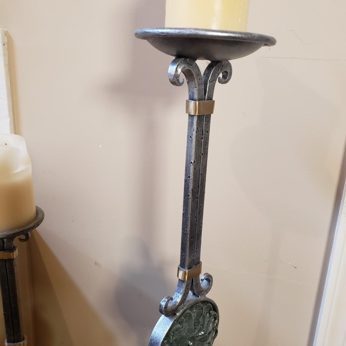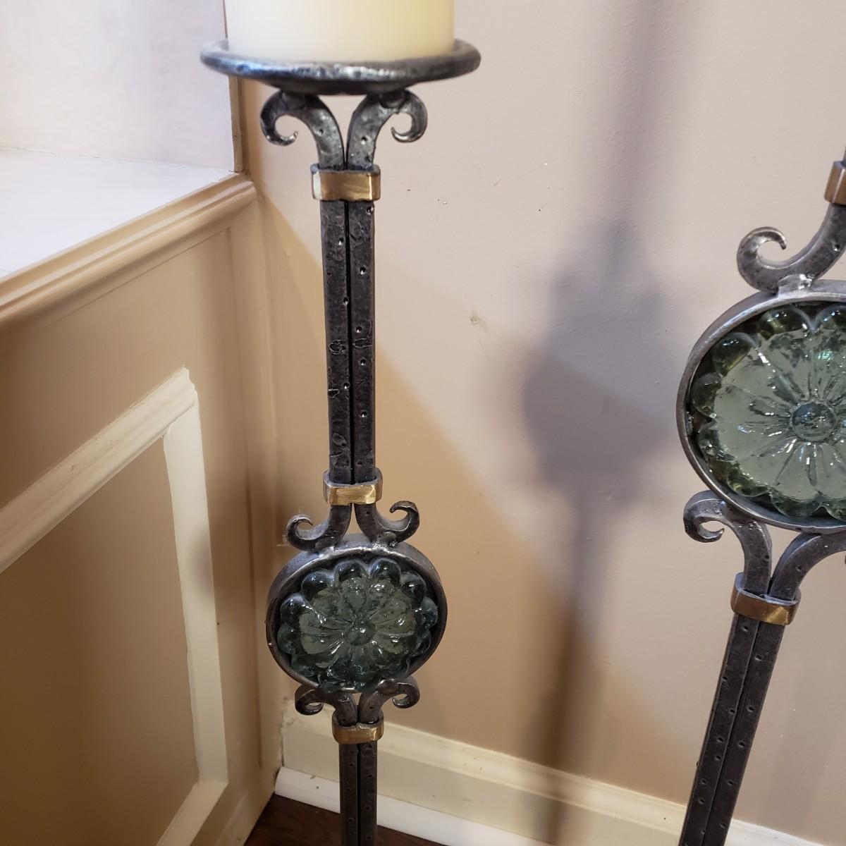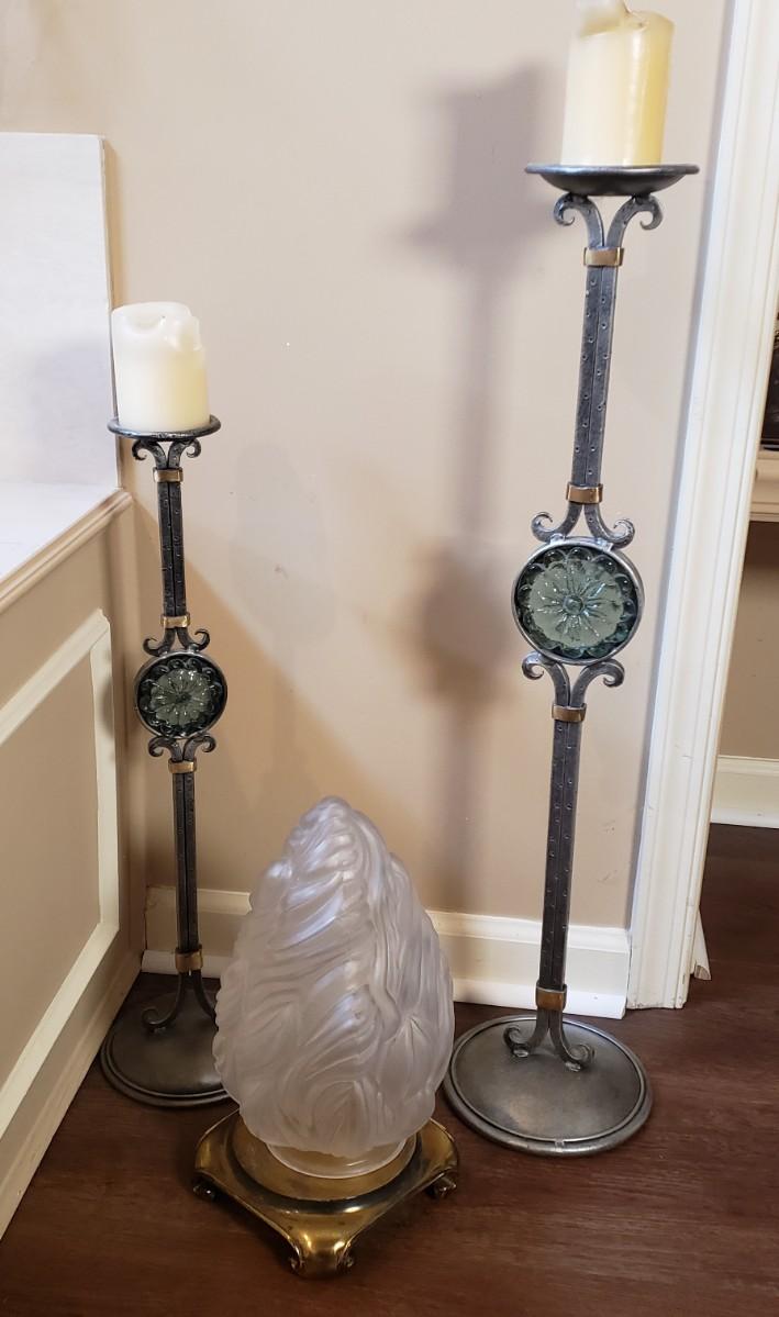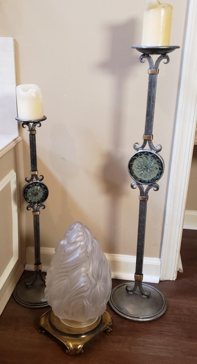 LOT 75MB: Vintage Frosted Glass Flame Lamp Shade on Brass Base & Pair of Wrought Iron Candle Holders with Glass Inserts