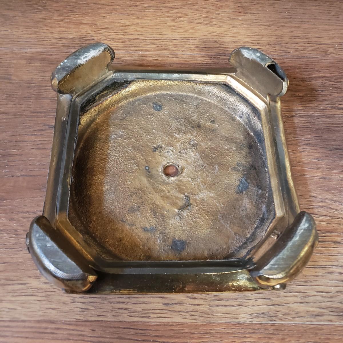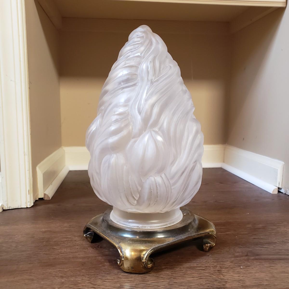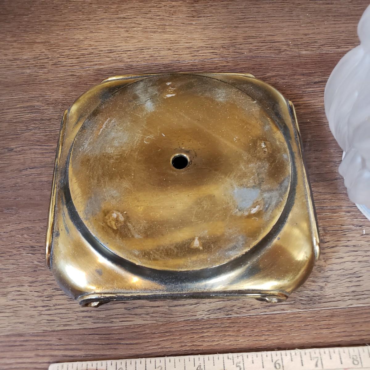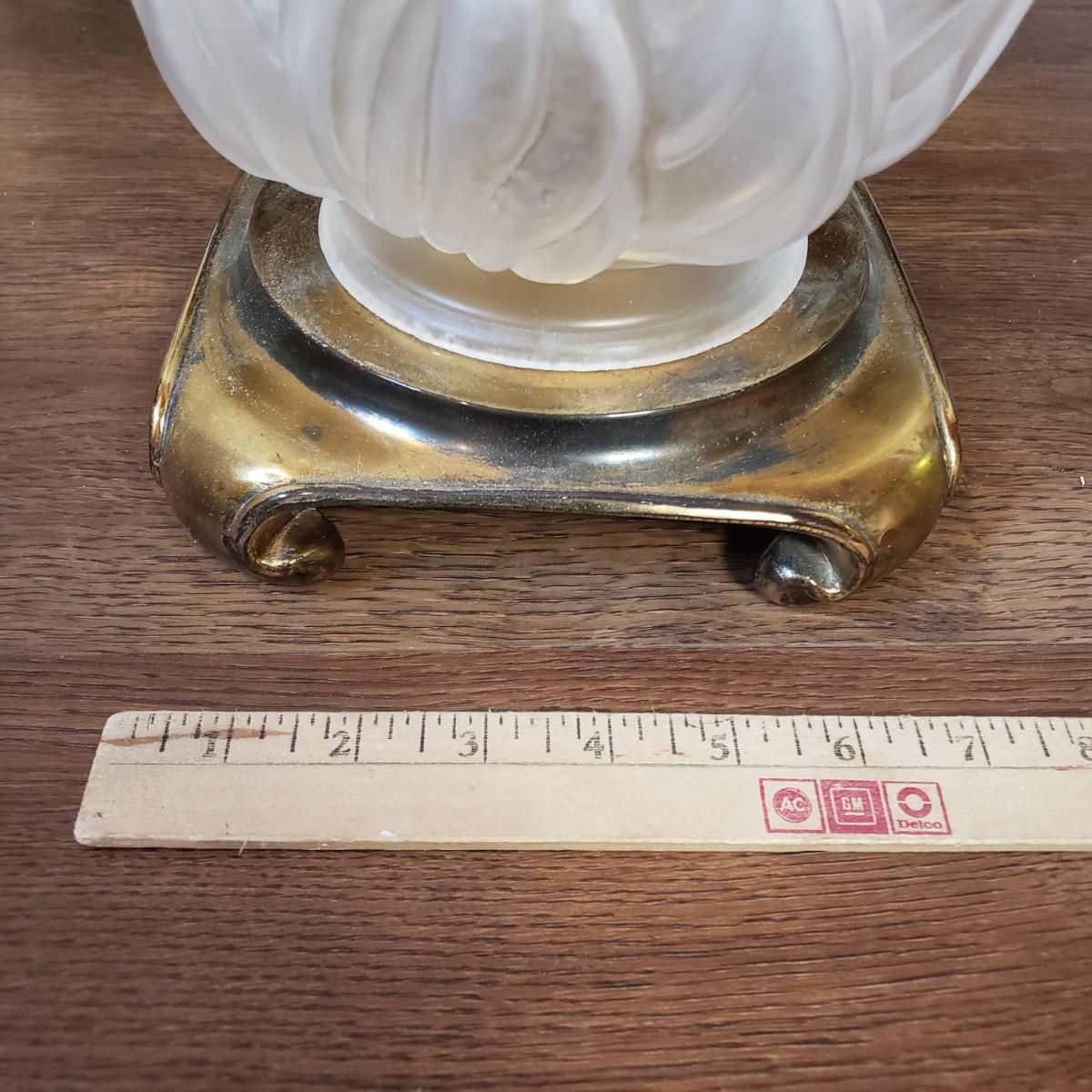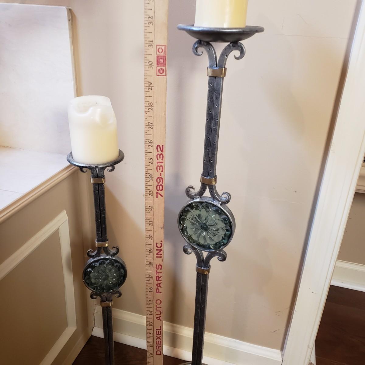 LOT 75MB: Vintage Frosted Glass Flame Lamp Shade on Brass Base & Pair of Wrought Iron Candle Holders with Glass Inserts