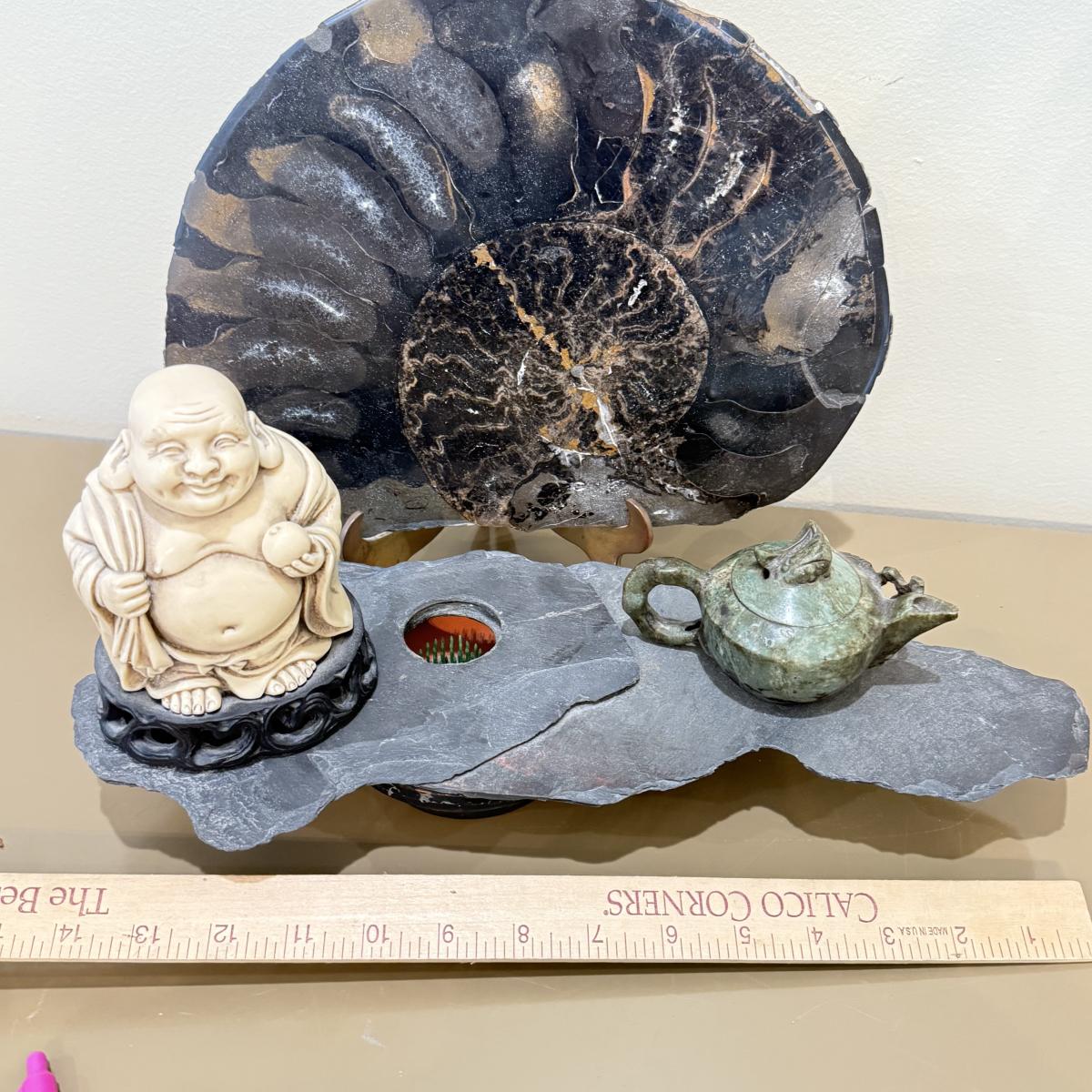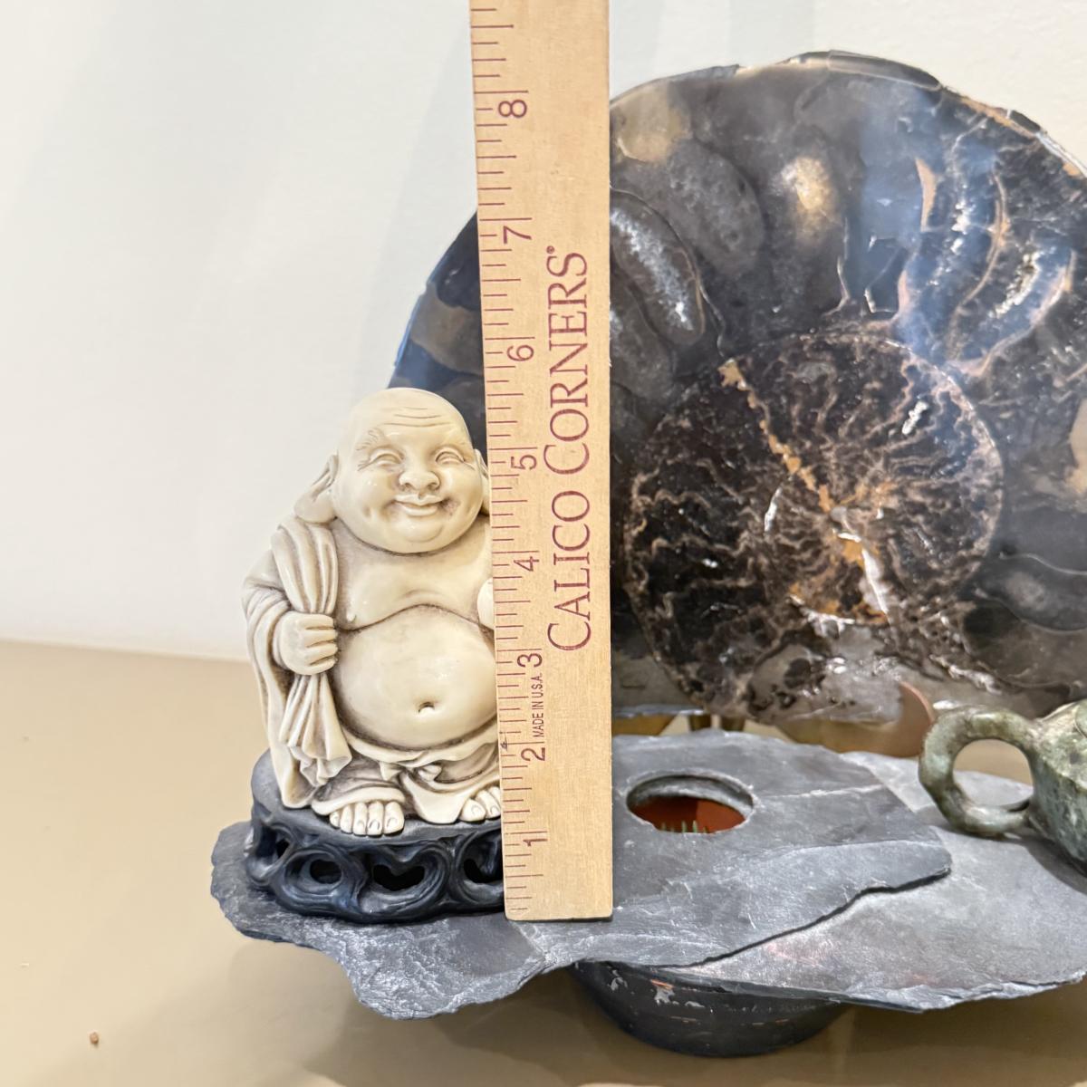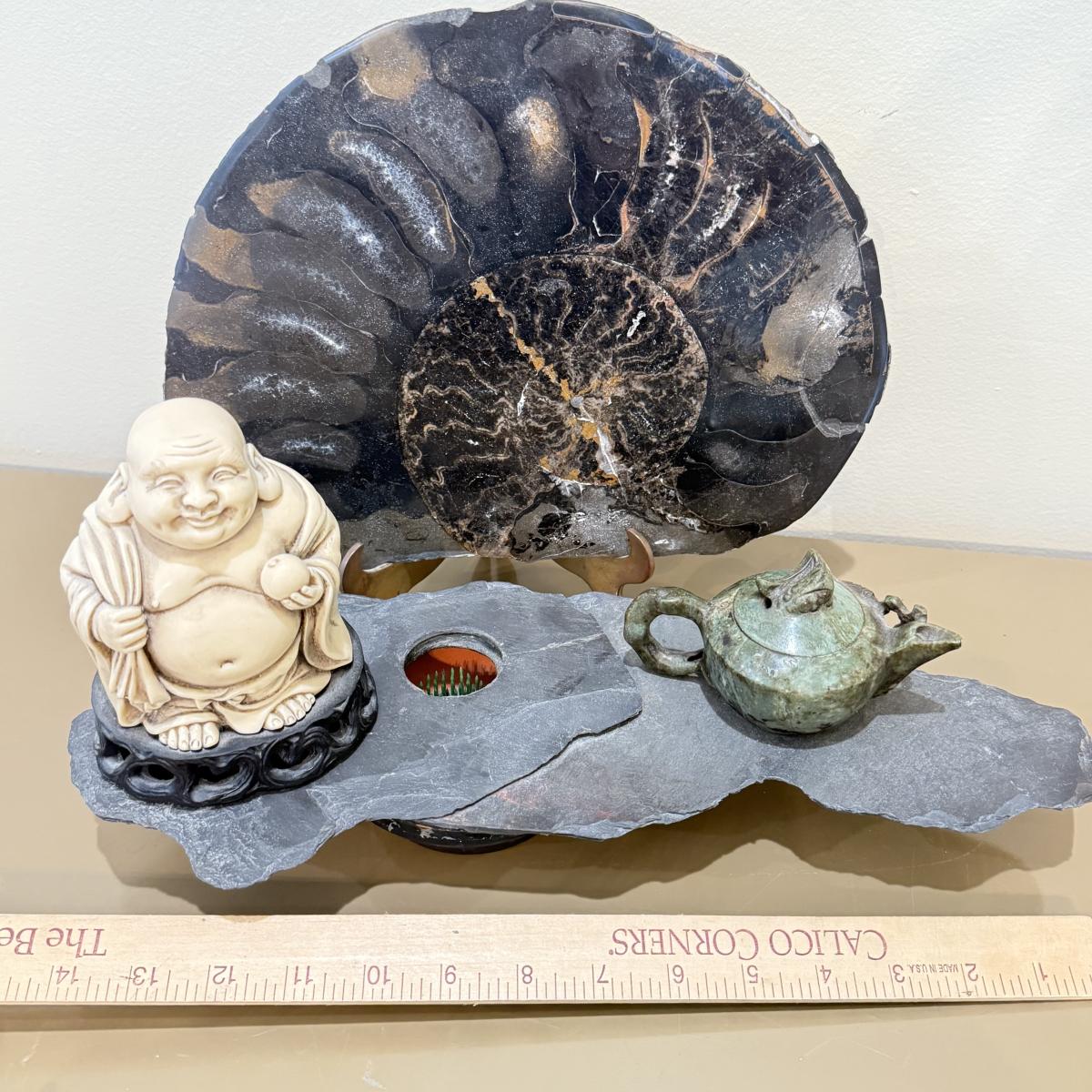 LOT 164F: Nautilus Type Cross Section Slate, Slate Top Flower Frog, Laughing Budda Figure & Stone Carved Mini Teapot