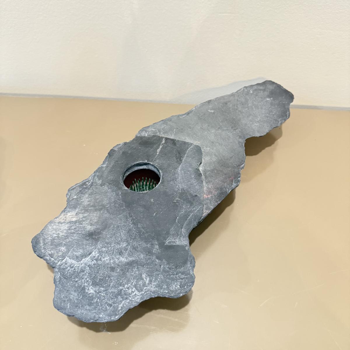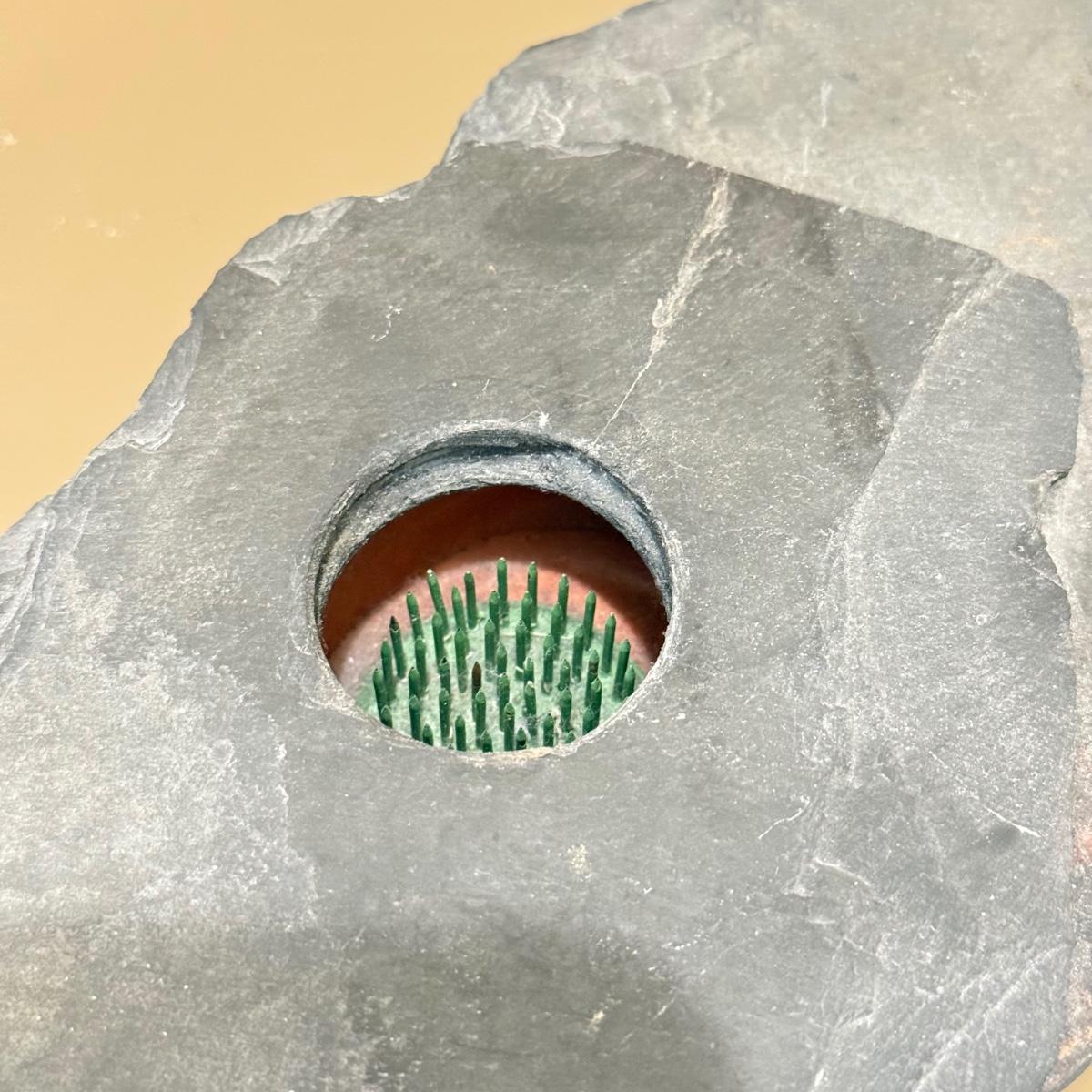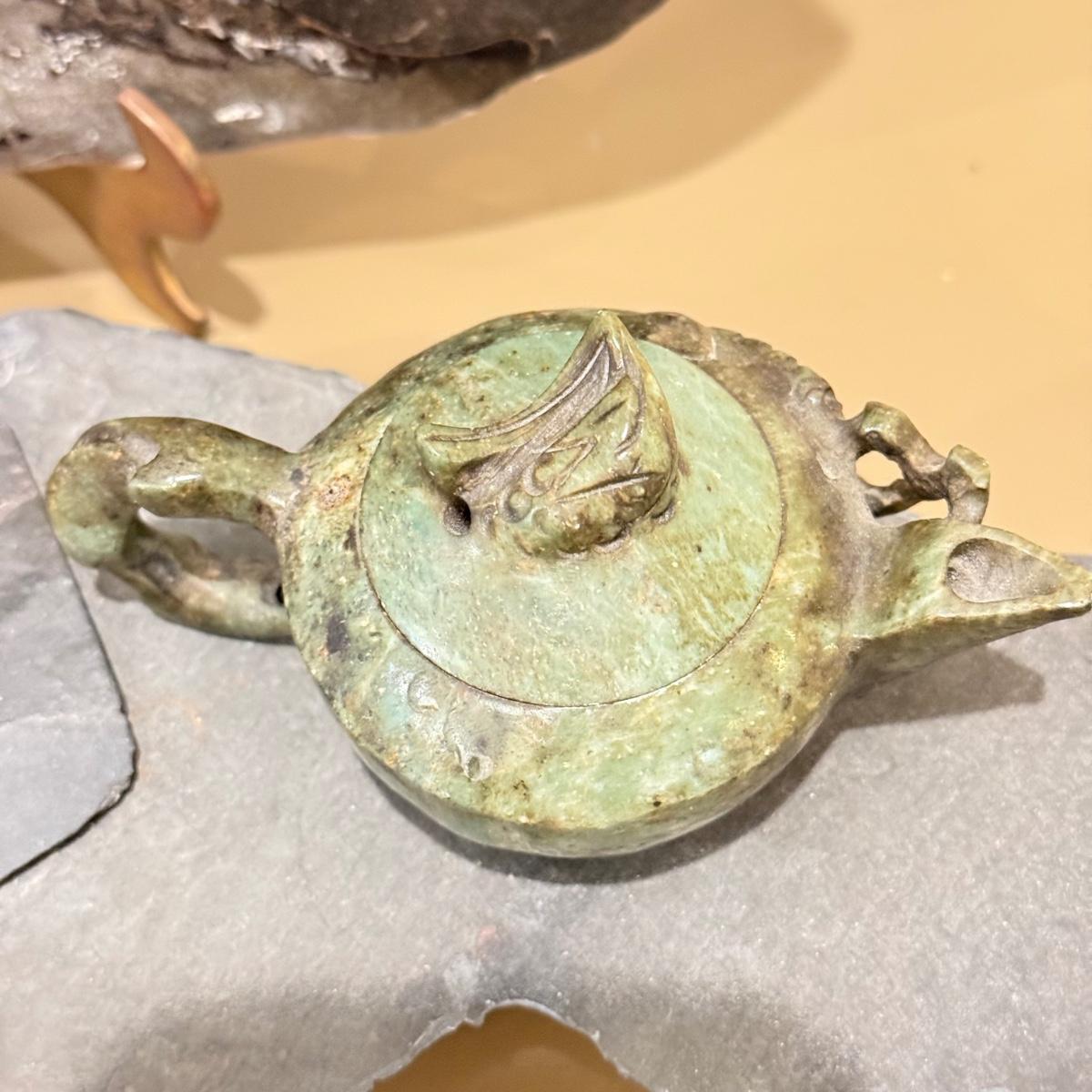 LOT 164F: Nautilus Type Cross Section Slate, Slate Top Flower Frog, Laughing Budda Figure & Stone Carved Mini Teapot