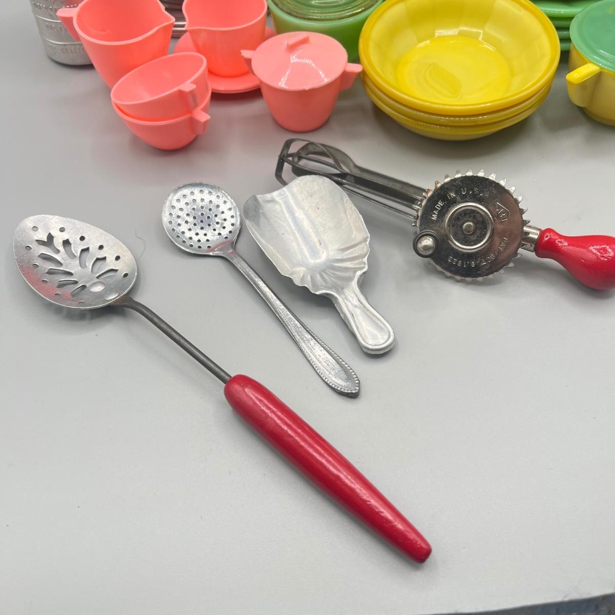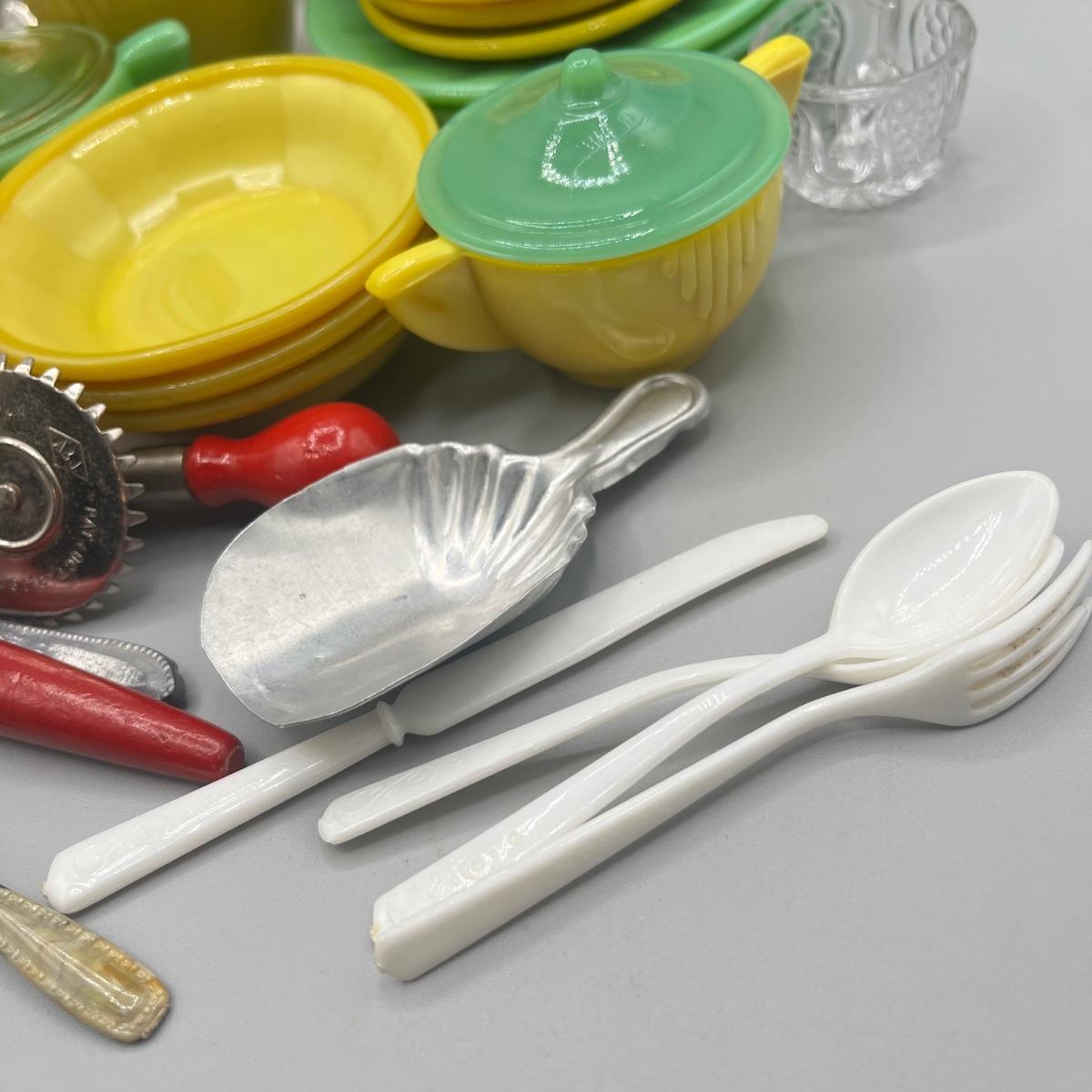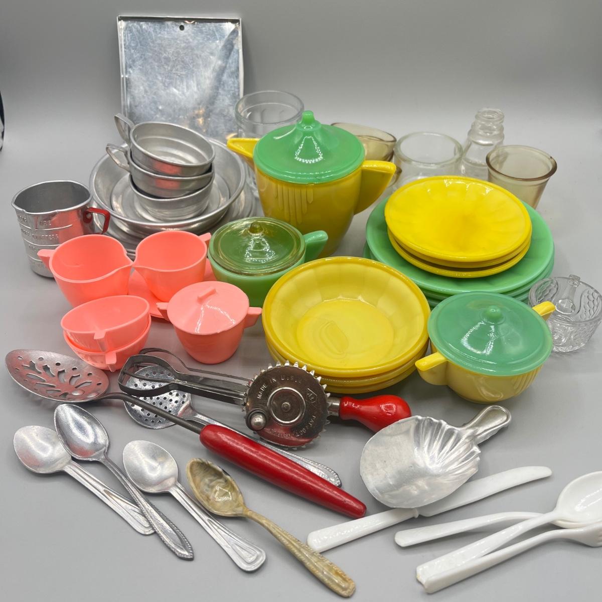 LOT 52: Children's Play Dishes and Utensils - Slag Glass Set Pieces and More