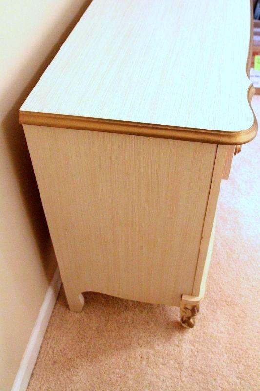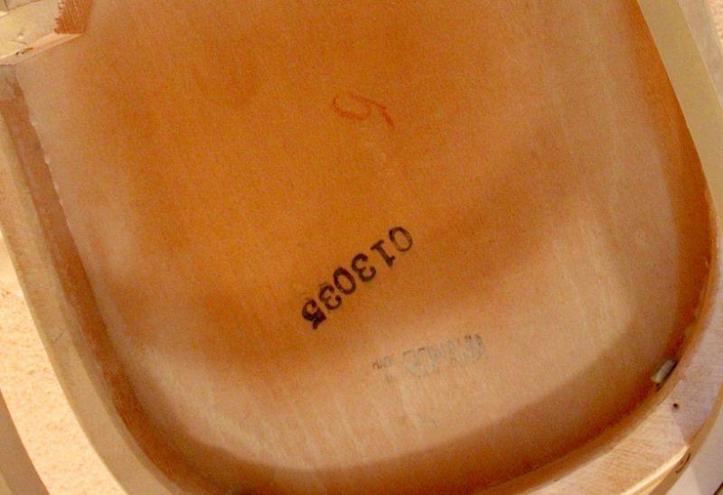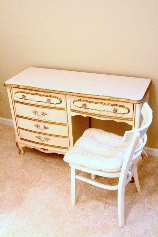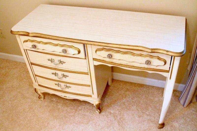 Stamped "Made in Romania". Looks like those made in the 60's. All wood construction. Painted white wood with gilded edges. Queen Anne cabriole foot. Nice padded chair not of french provencial style, but fits perfectly in opening of desk. No visible damage. Plywood back. Solid.