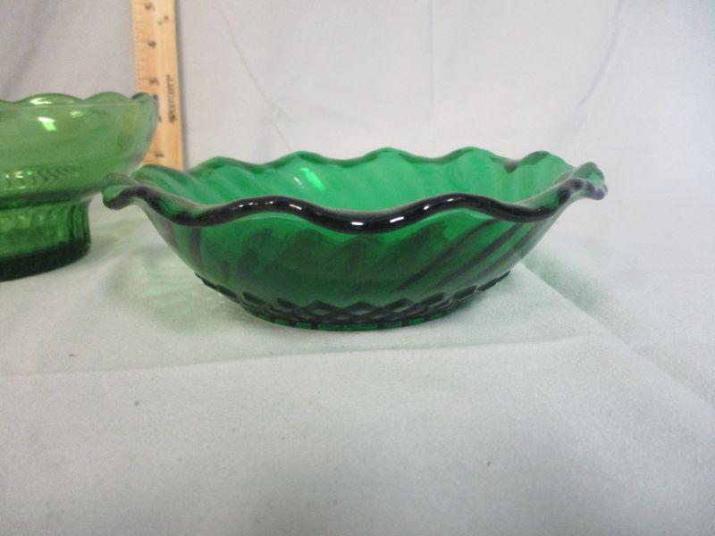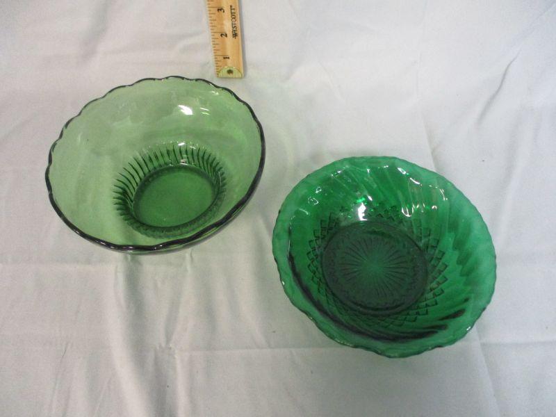 The one bowl is an avocado green (E.O. Brody) and the other bowl is more of a kelly green. Both are in excellent condition.