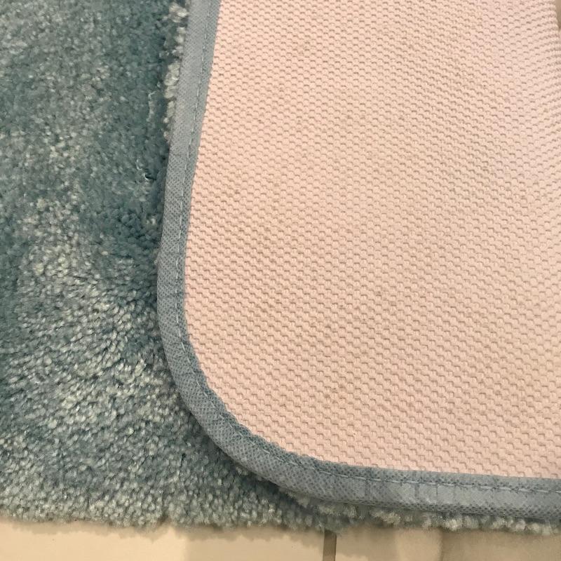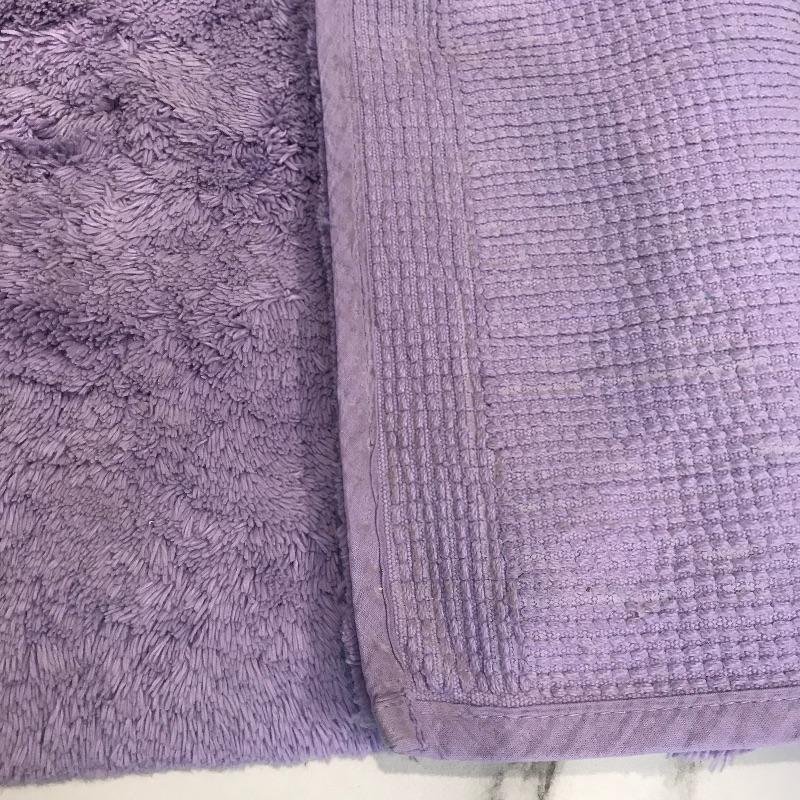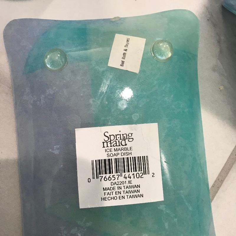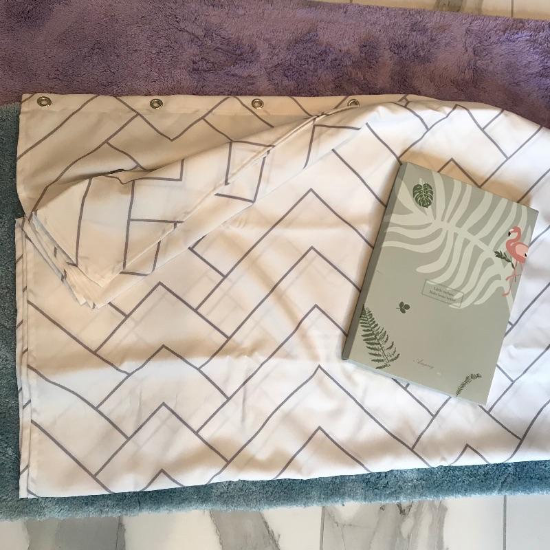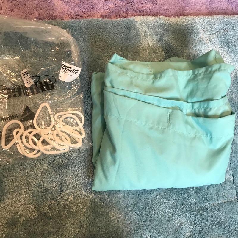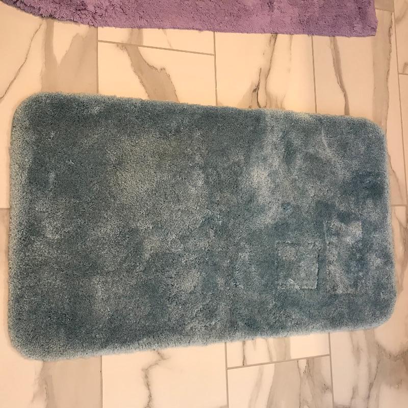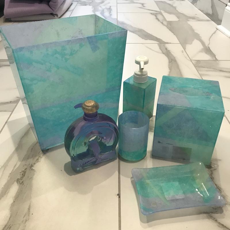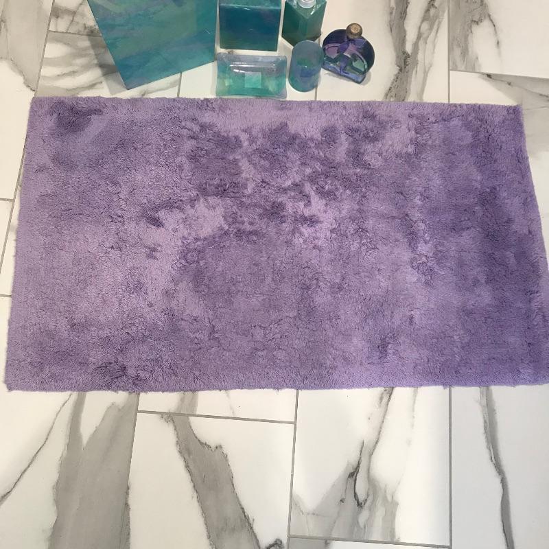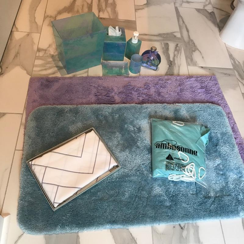 If blues and purples are your colors, then this lovely selection of must haves for any bathroom are just the ticket. Plastic bathroom essentials called “Spring Marble” are from Bed Bath & Beyond and include a tissue cover, soap dish, soap dispenser, trash receptacle, and tumbler. A matching unopened designer bath oil, rugs and shower curtains complete this lot. The teal rug has a non slip rubber bottom and the lavender rug appears woven. Both are very soft making them perfect for bare feet. The lavender matte is approximately 42” x 23.5”. Lastly, two shower curtains. that appear to be brand new or certainly close to it. One is a bright teal, sheer lined cloth by Ambesonne and the other is a white with gray chevron like patterns by Aimjerry. See photos. No shipping.