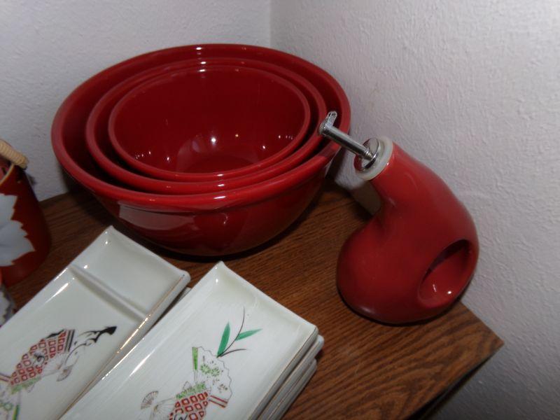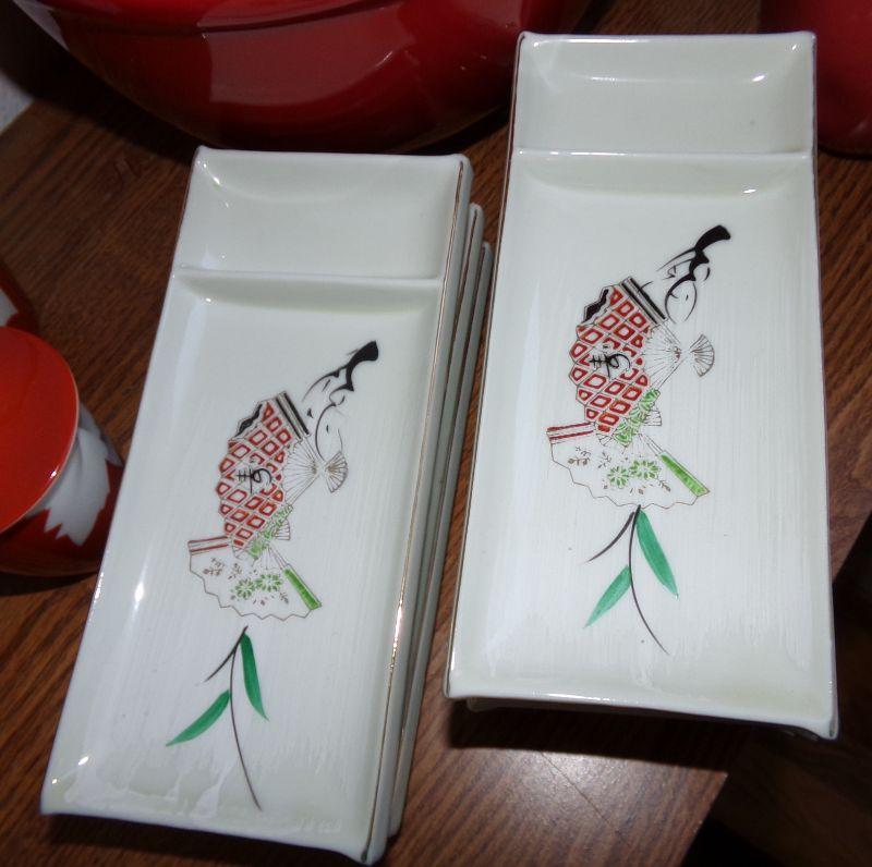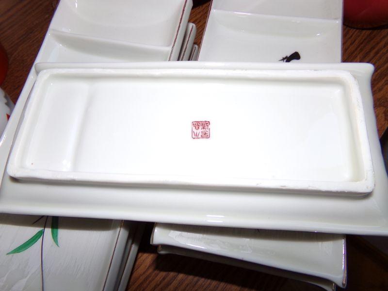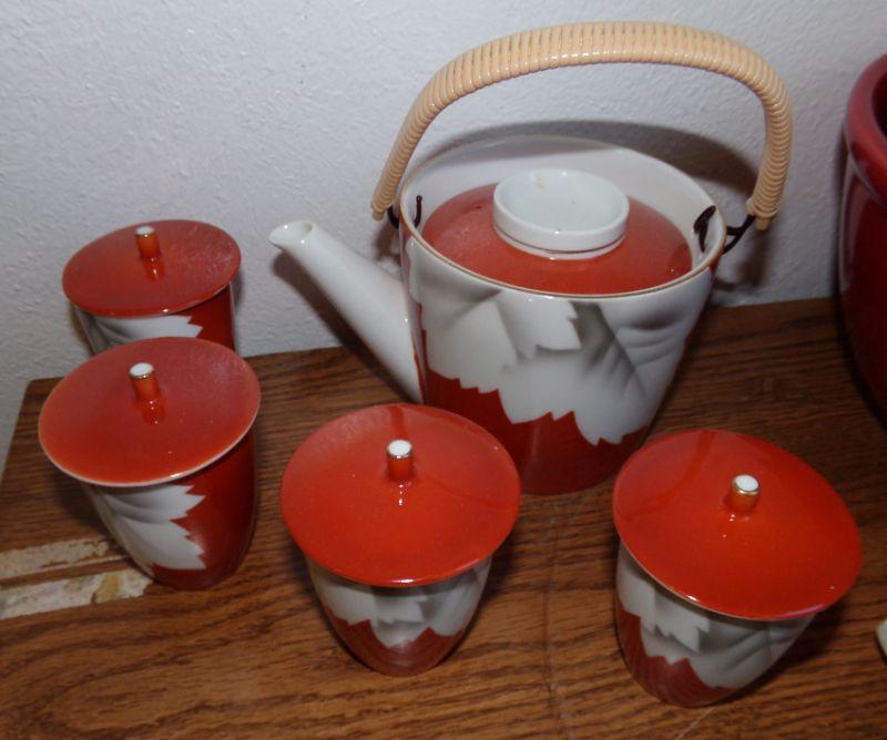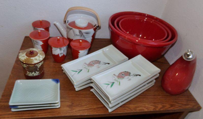 3 NESTING BOWLS, SUSHI PLATES, TEAPOT WITH 4 MATCHING TEACUPS WITH LIDS AND MORE