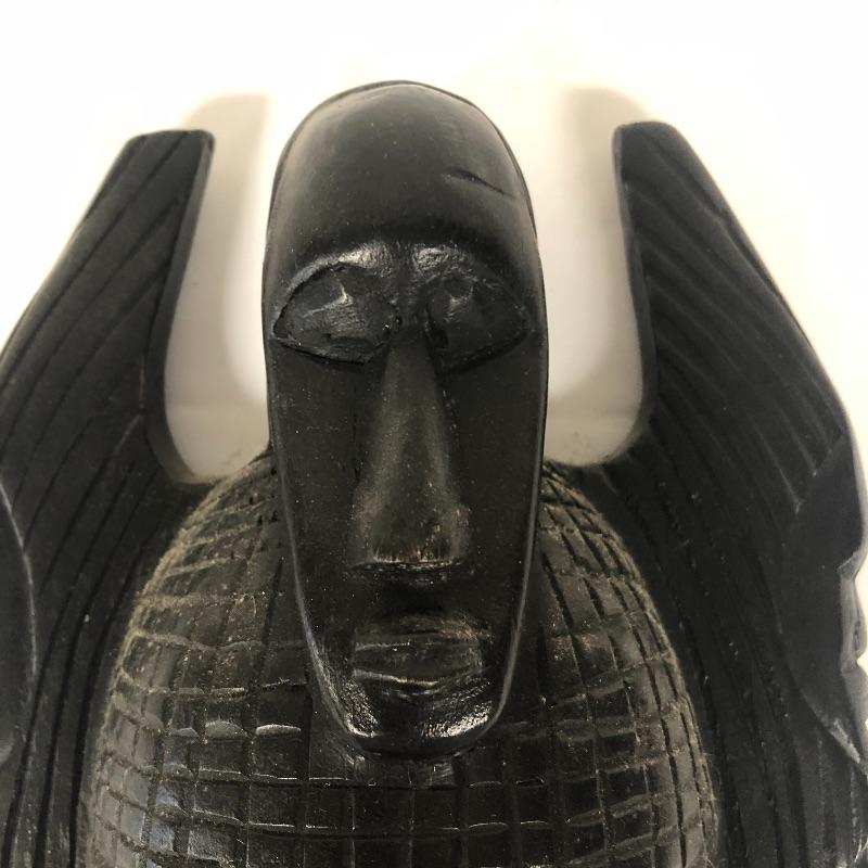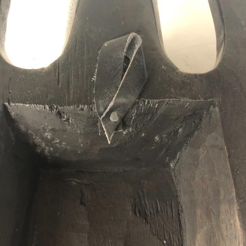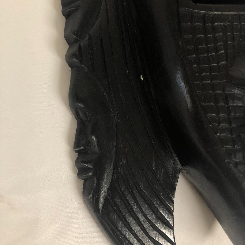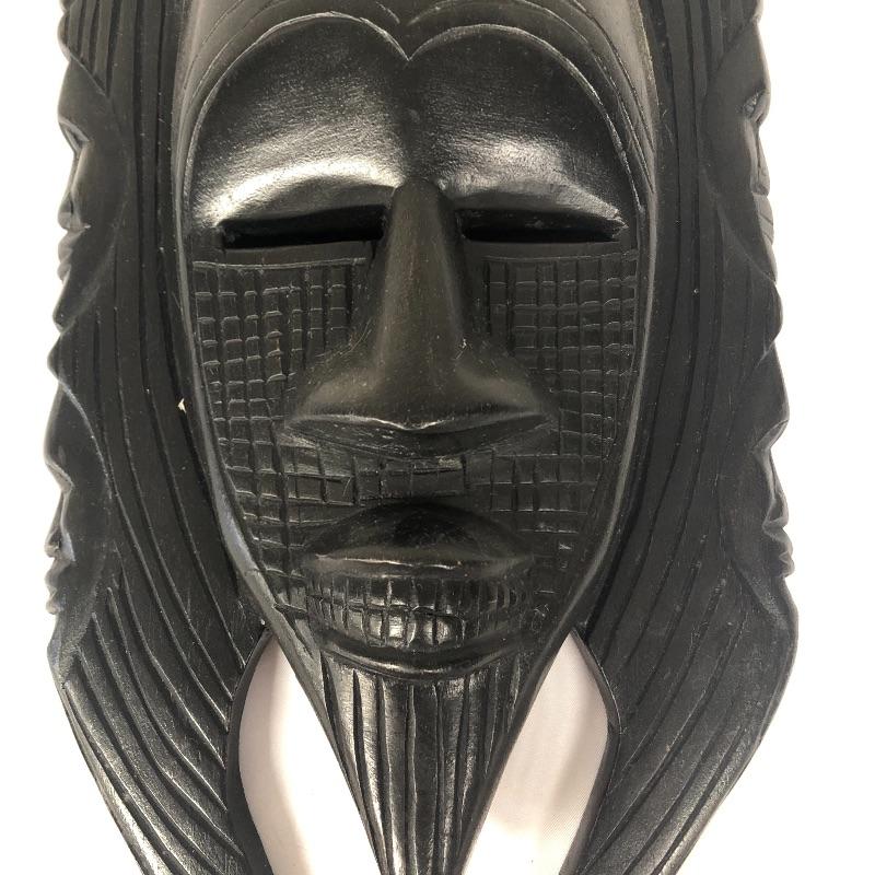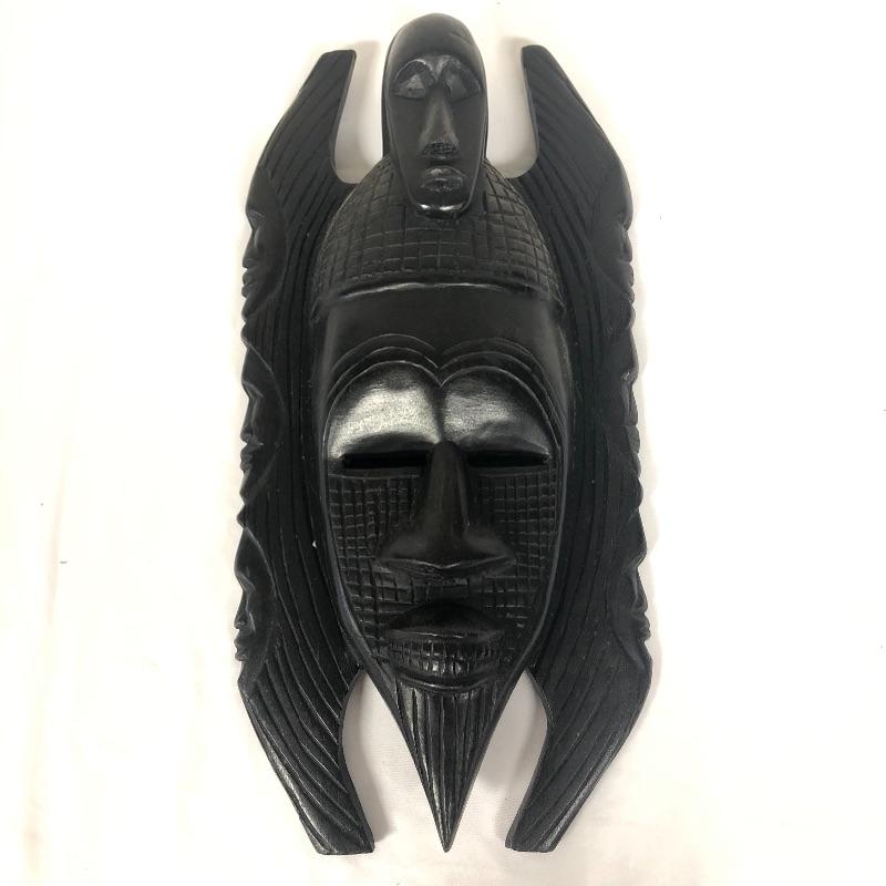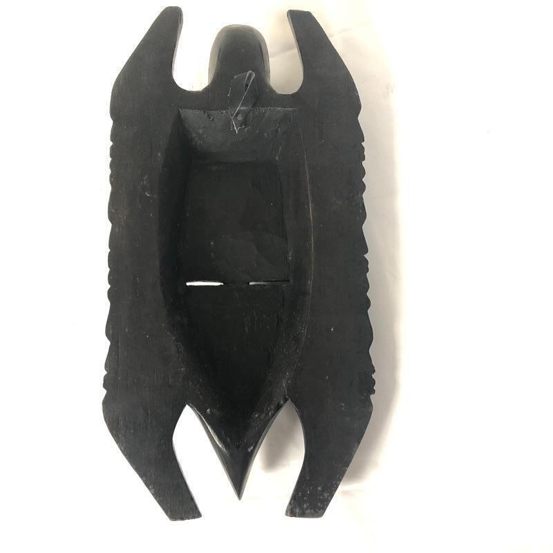 This mask is wooden, and it is stained or painted black. It appears to be in great condition, with only a few small scratches. It measures about 15” x 8” x 3.5.”