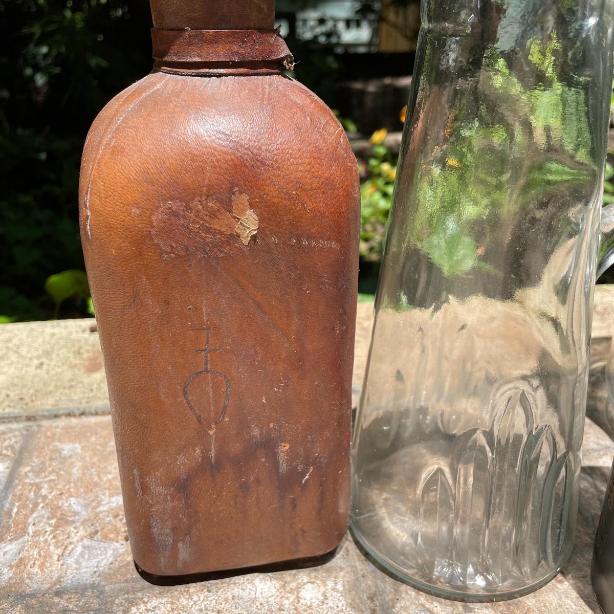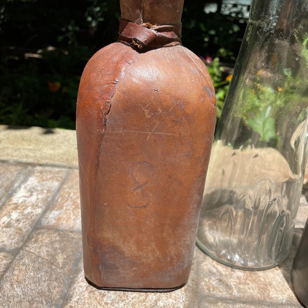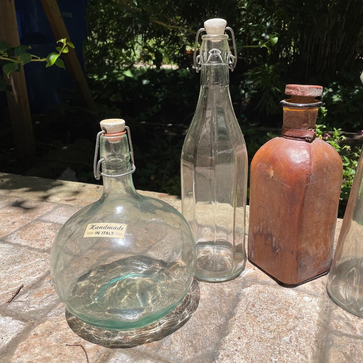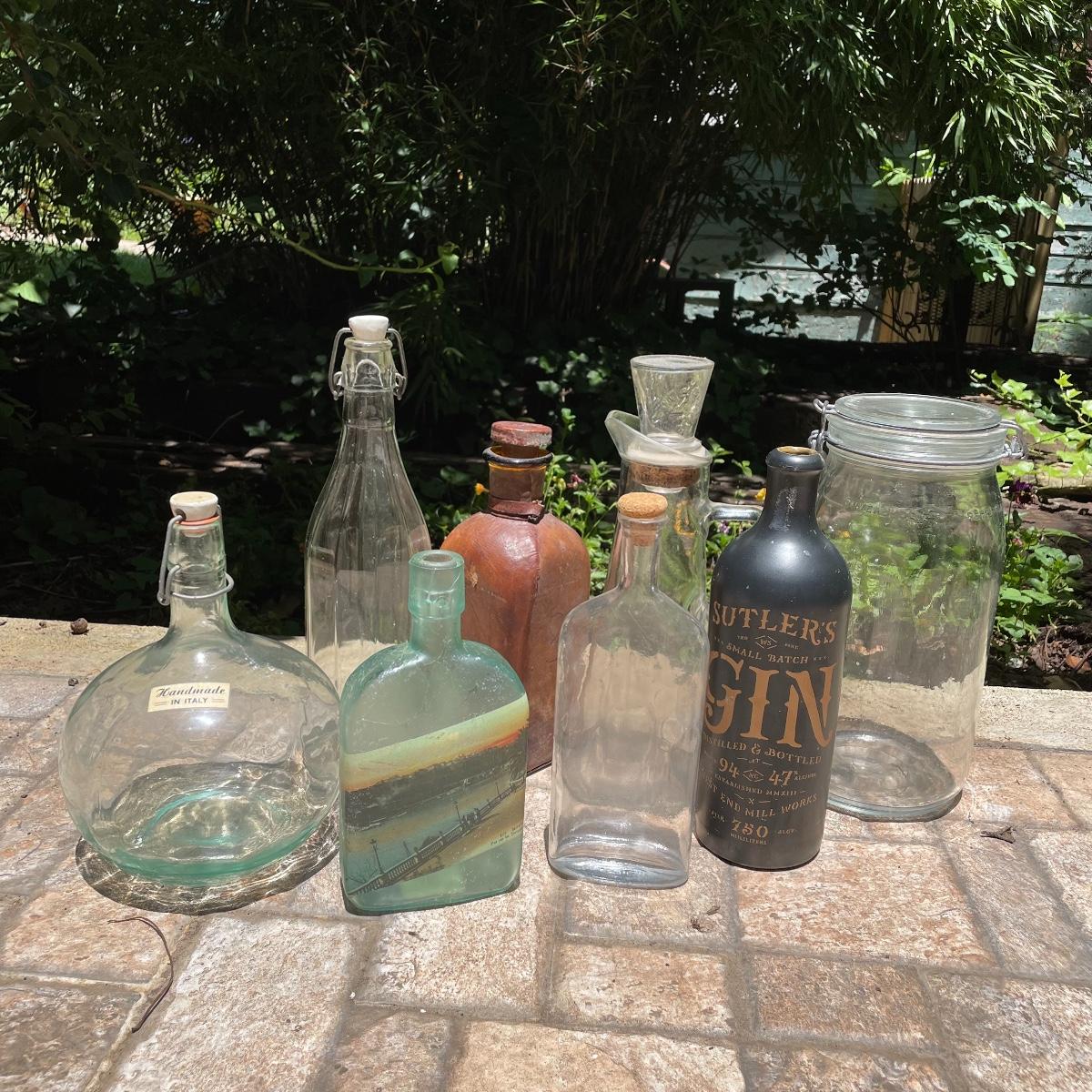 Eight unique and traditional bottles for flowers, canning, or beverages to achieve an authentic farmhouse look. Lot features a leather bottle with cork, this piece has a hole in the bottom that would need to be plugged if used with liquids. There are some symbols on every side of the bottle and the leather is in very nice shape. The leather bottle is accompanied by a ceramic label coated Gin bottle. Other hinged and lidded pieces include a large 5”d x 11” canning jar and a decanter handmade in Italy. See images. Local pick up only.