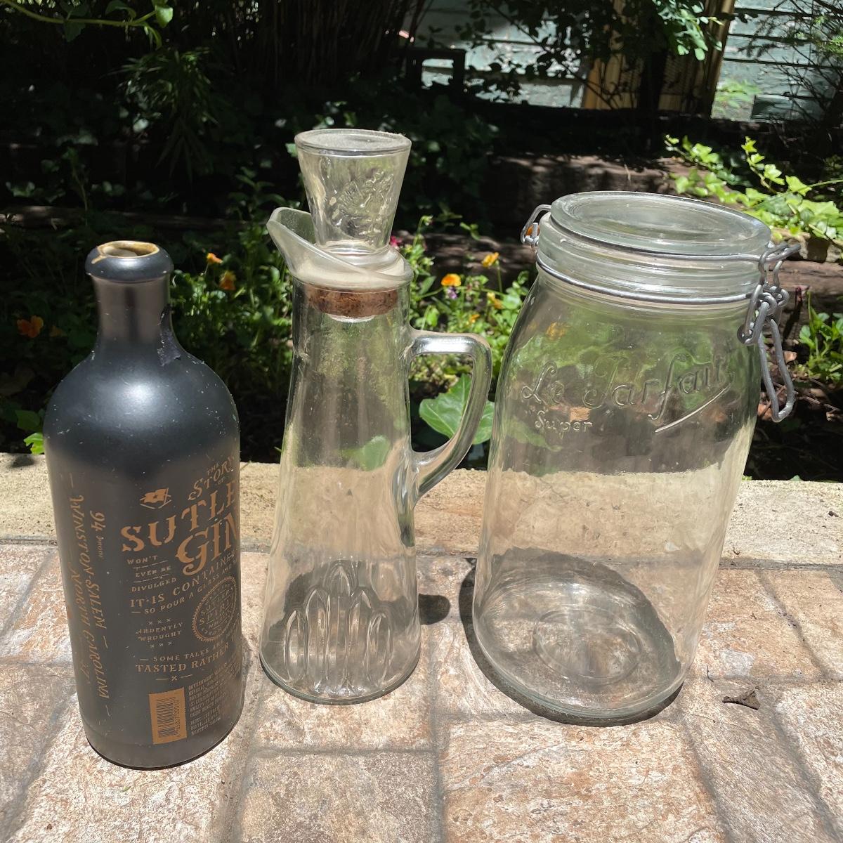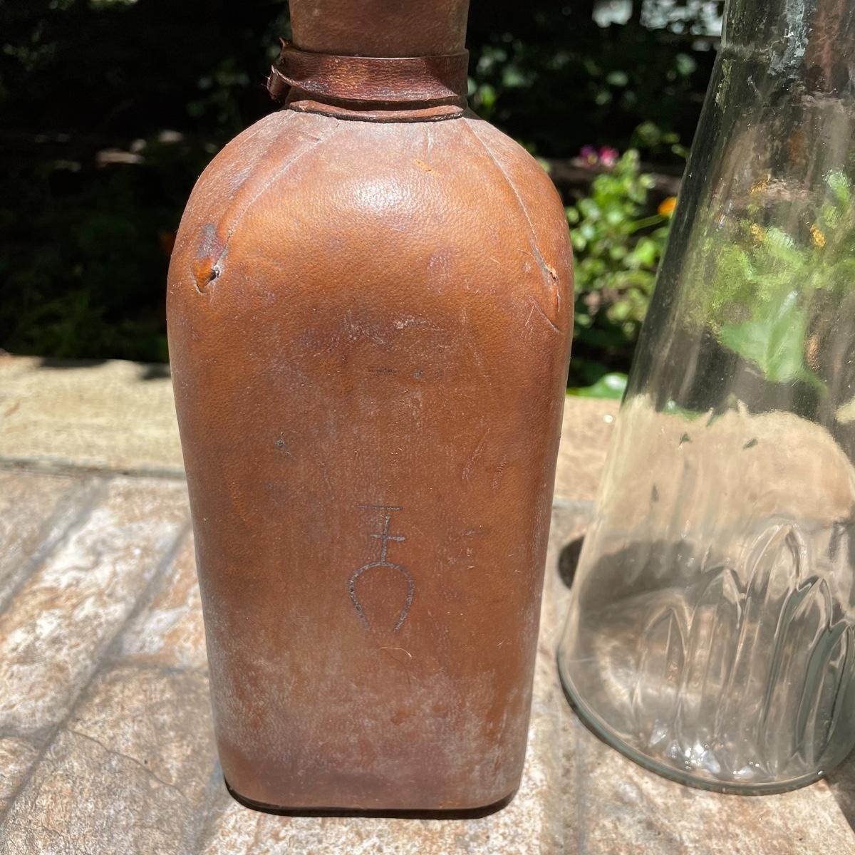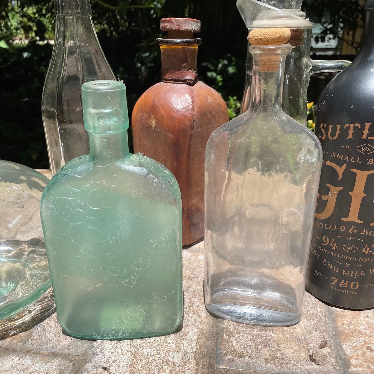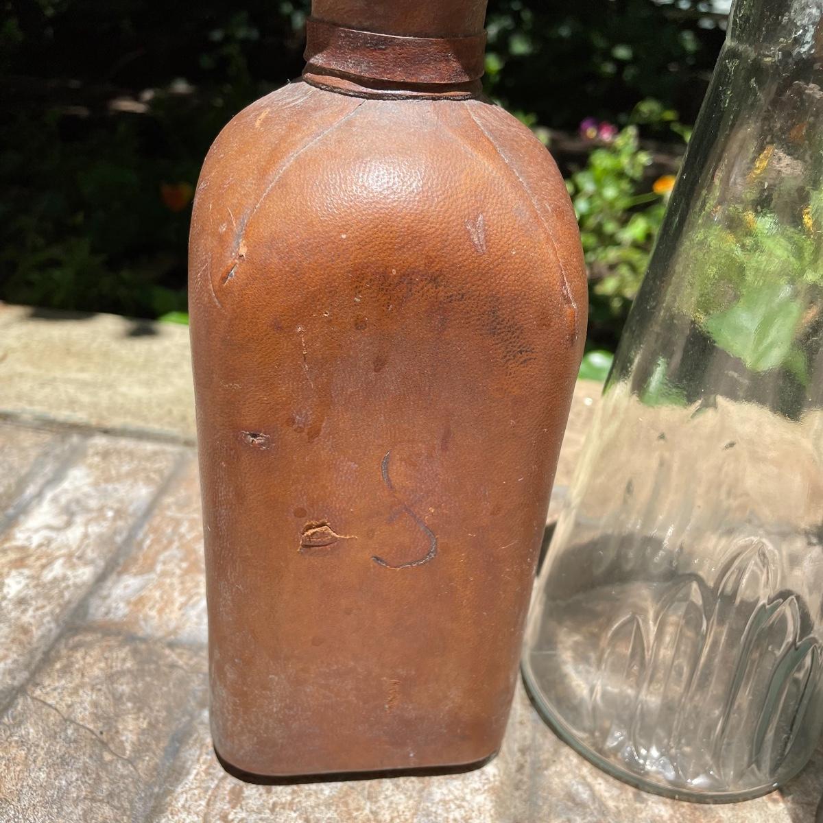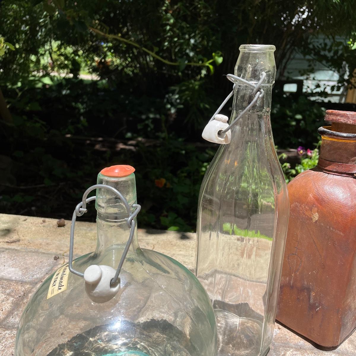 Eight unique and traditional bottles for flowers, canning, or beverages to achieve an authentic farmhouse look. Lot features a leather bottle with cork, this piece has a hole in the bottom that would need to be plugged if used with liquids. There are some symbols on every side of the bottle and the leather is in very nice shape. The leather bottle is accompanied by a ceramic label coated Gin bottle. Other hinged and lidded pieces include a large 5”d x 11” canning jar and a decanter handmade in Italy. See images. Local pick up only.