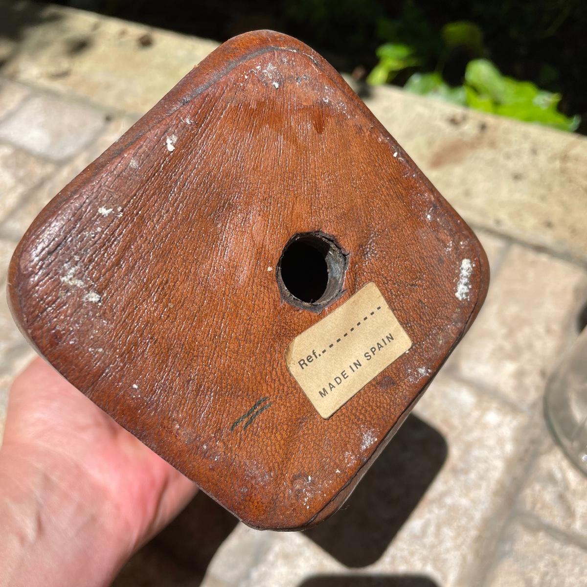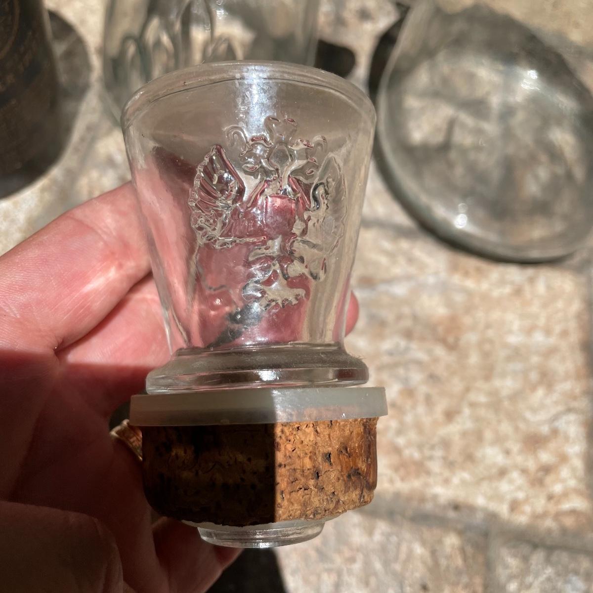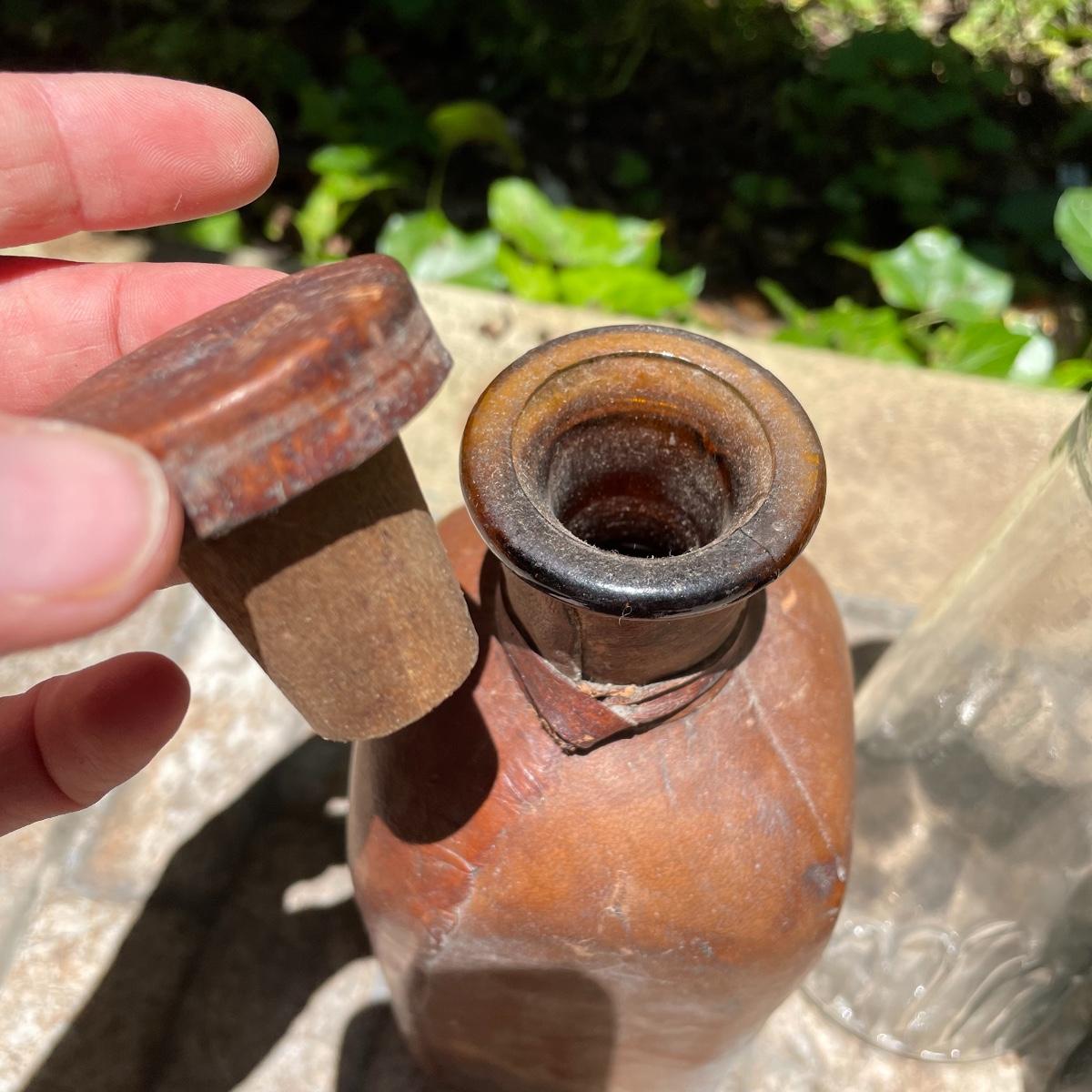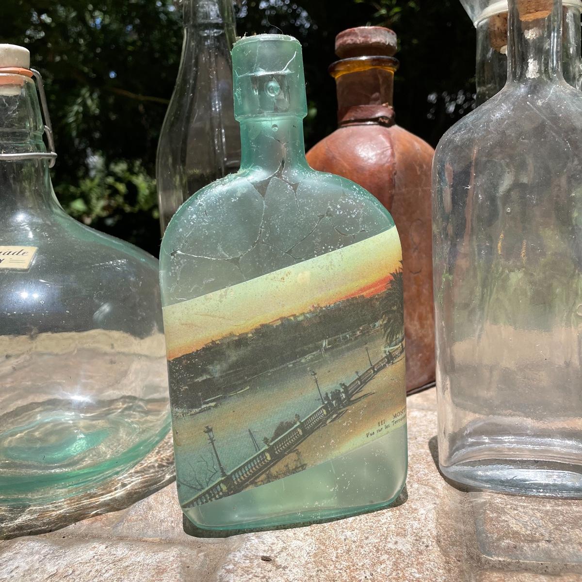 Eight unique and traditional bottles for flowers, canning, or beverages to achieve an authentic farmhouse look. Lot features a leather bottle with cork, this piece has a hole in the bottom that would need to be plugged if used with liquids. There are some symbols on every side of the bottle and the leather is in very nice shape. The leather bottle is accompanied by a ceramic label coated Gin bottle. Other hinged and lidded pieces include a large 5”d x 11” canning jar and a decanter handmade in Italy. See images. Local pick up only.