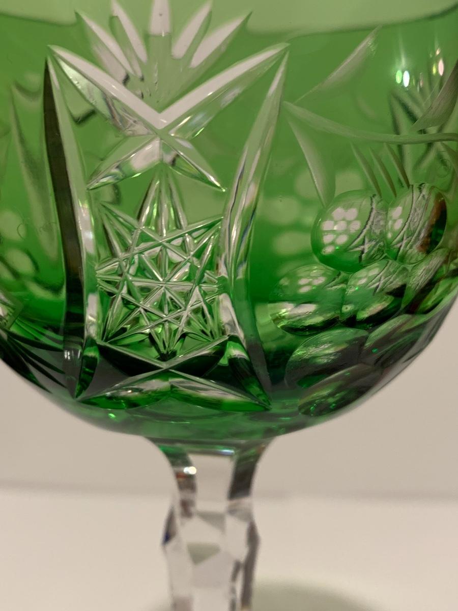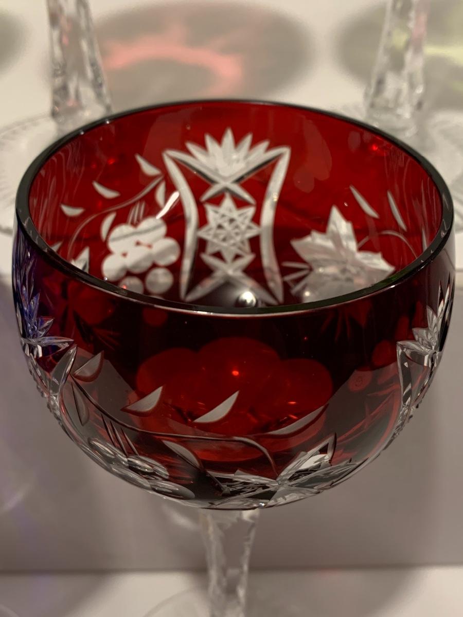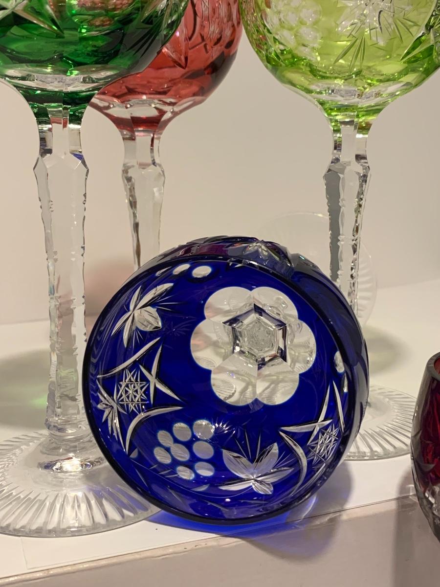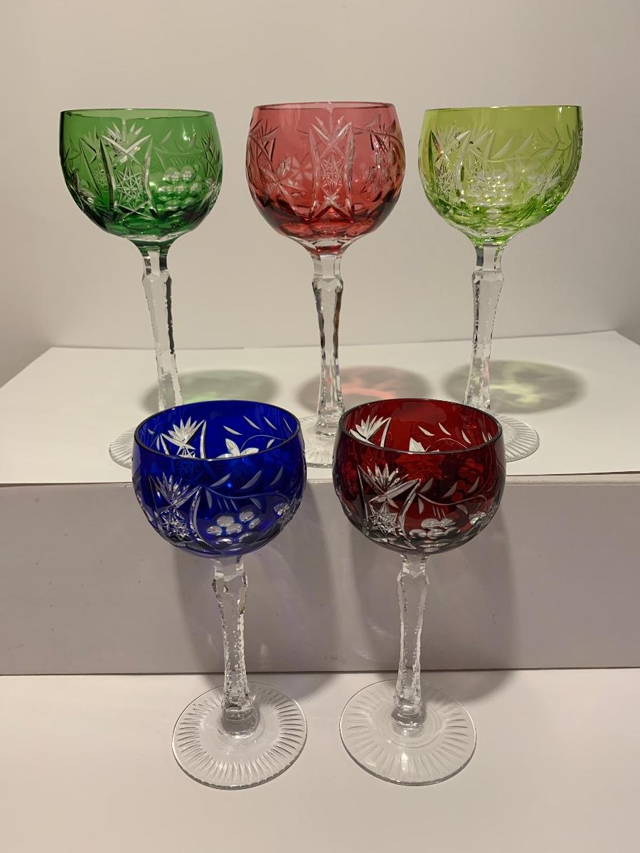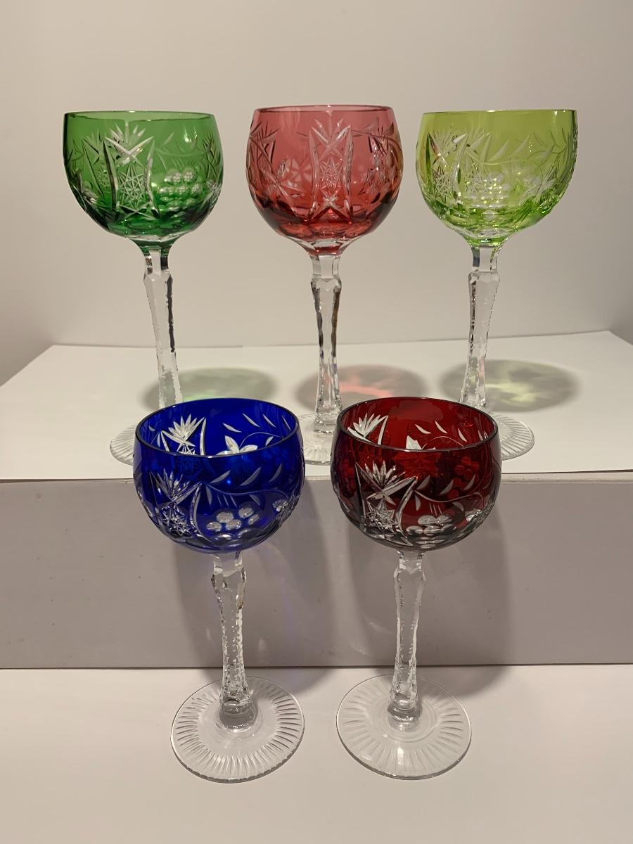 Beautiful set of 5 multicolored cut to clear stemware with notched stems fromGermany. Pretty grape and leaves pattern with a crystal-clear base. Just stunning. They have had minimal use if any. The crystal is nice and clear without any residue.