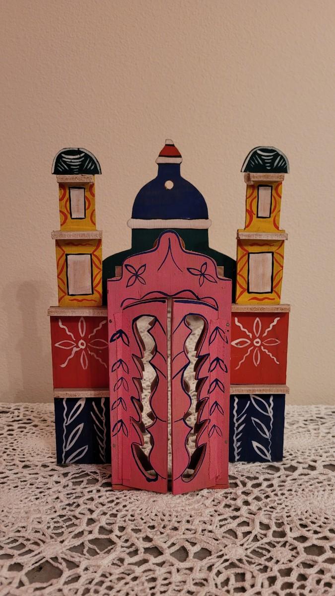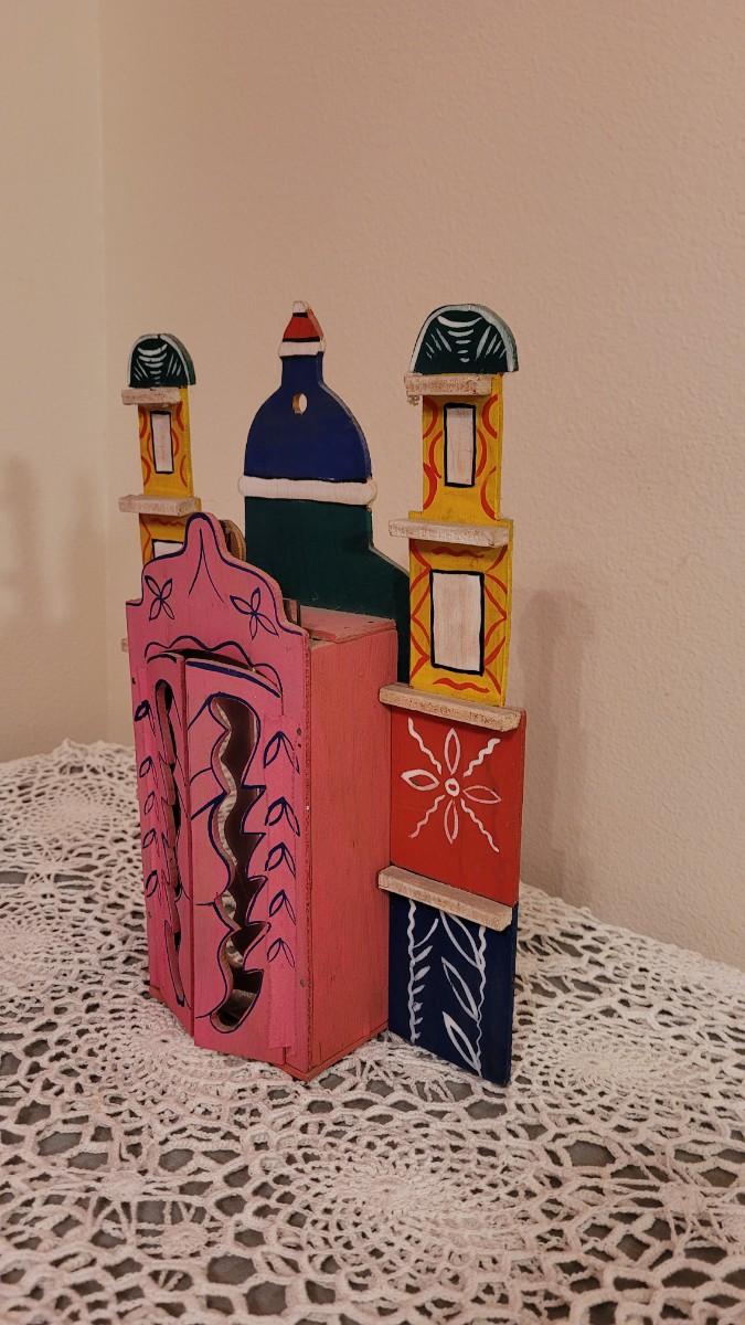 In South America it is common to see decorative boxes called "nichos" set upon tables and pedestals to display religious icons. These boxes may serve as a religious altar (to mark a significant religious event) or to honor a patron saint. Common structural conventions include hinged doors, carved borders, and multiple panels. Within the box there is a central figure or object for whose honor the nicho has been created. They are usually painted with striking colors, often contrasting bright and dark, and tend towards garish.