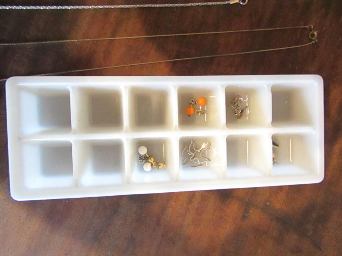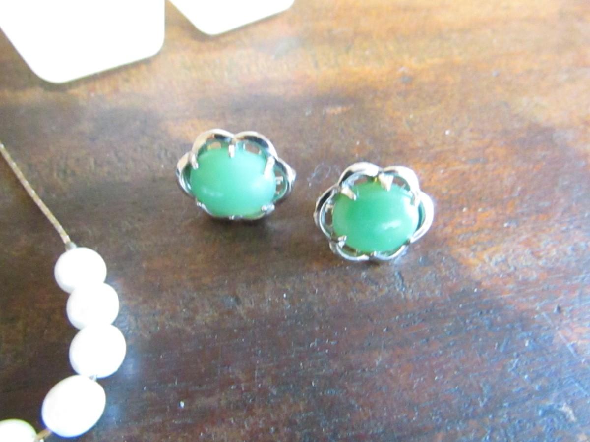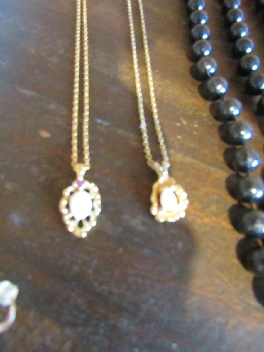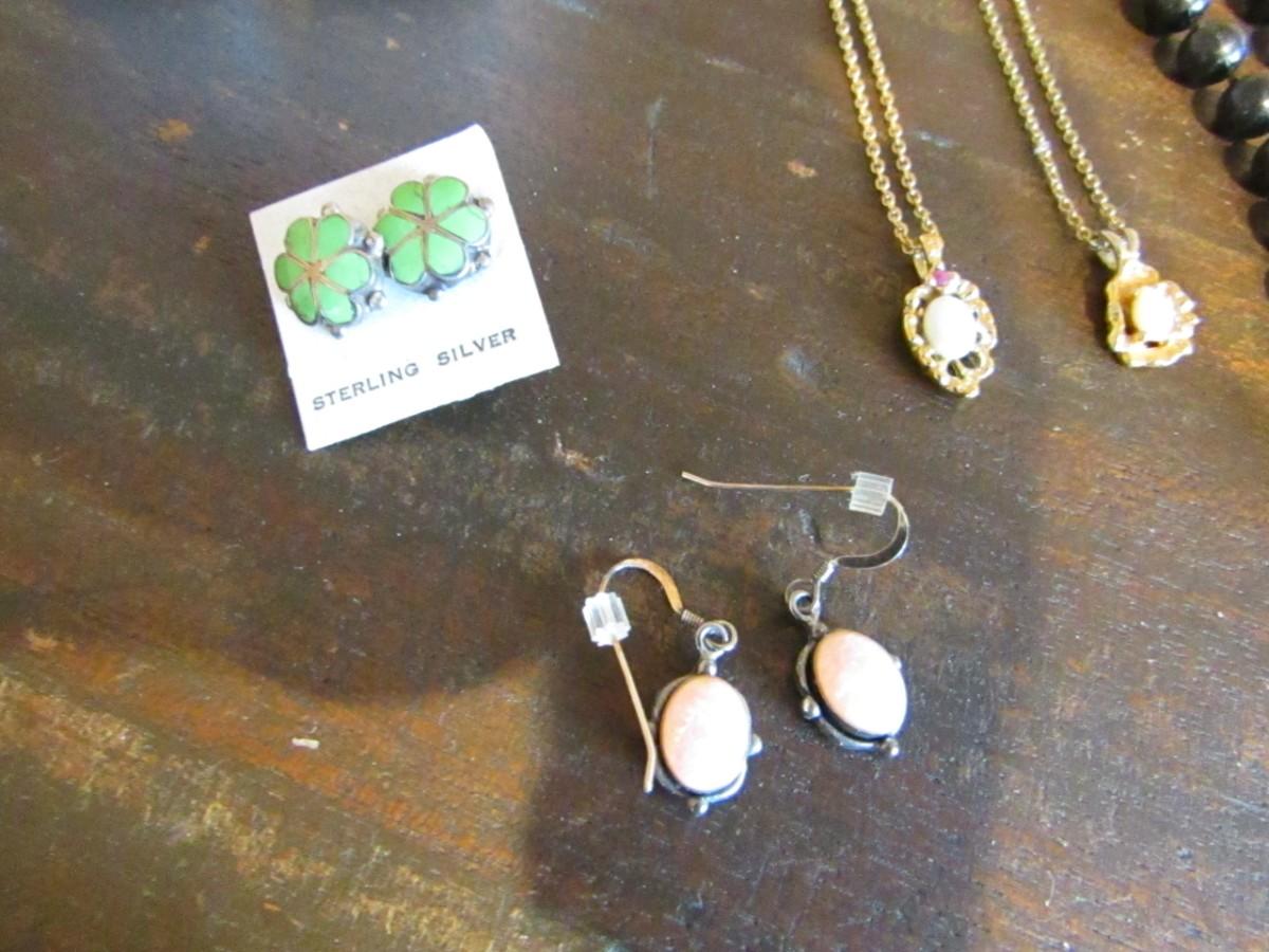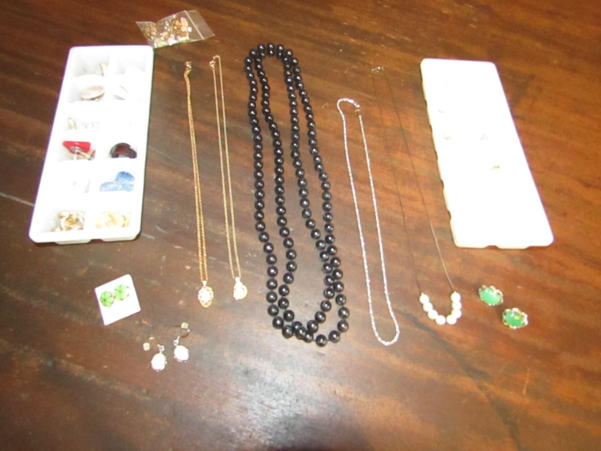NECKLACES, MANY PIERCED EARRINGS INCLUDING 2 THAT ARE MARKED STERLING, BACKS FOR EARRINGS AND 1 PAIR OF CLIP-ON EARRINGS