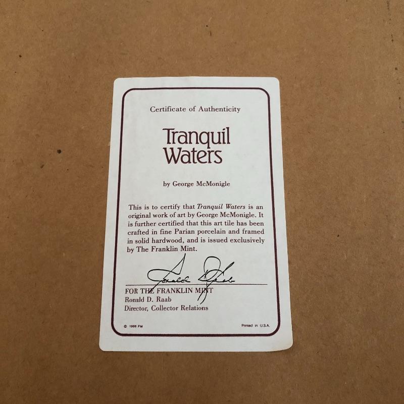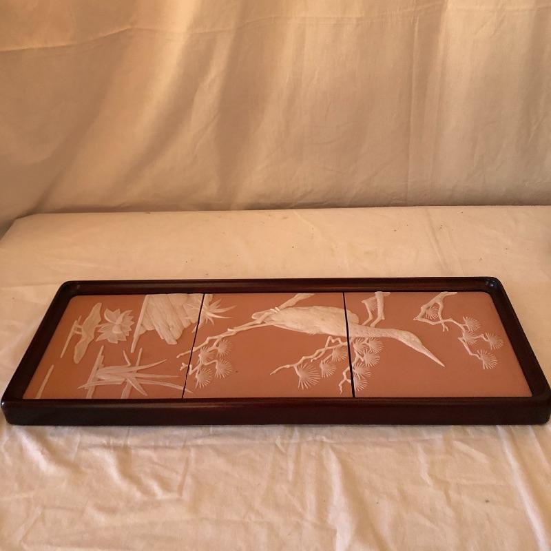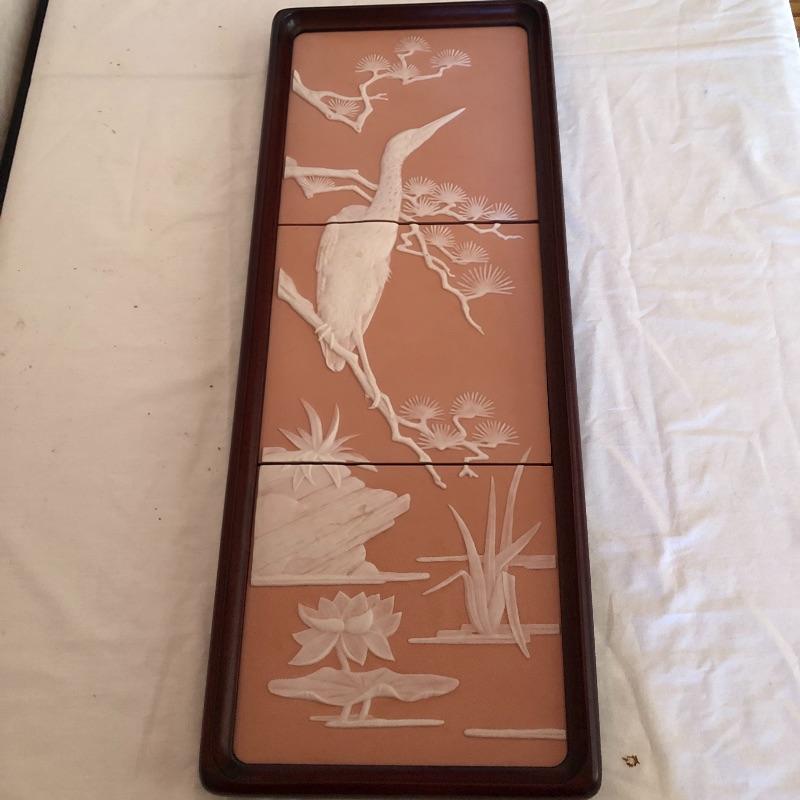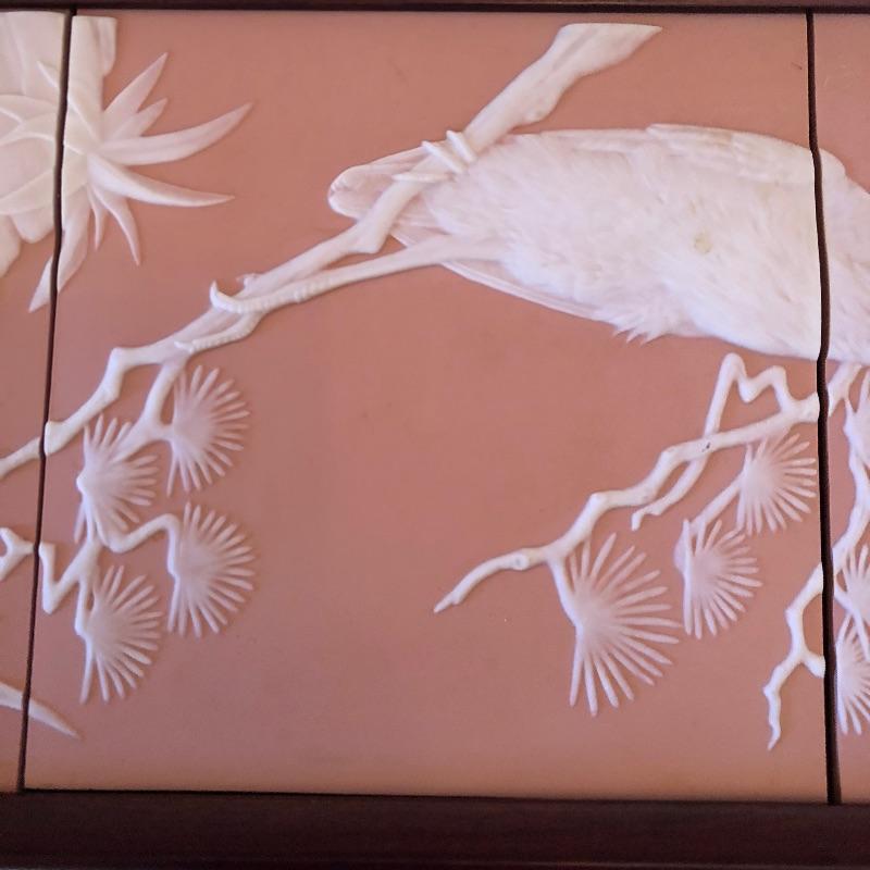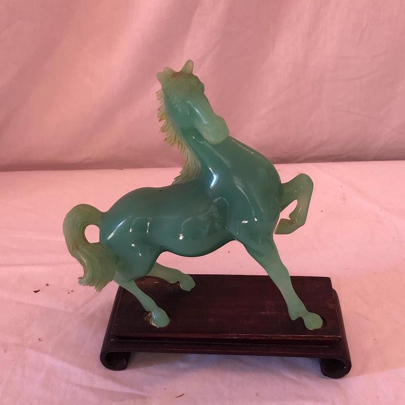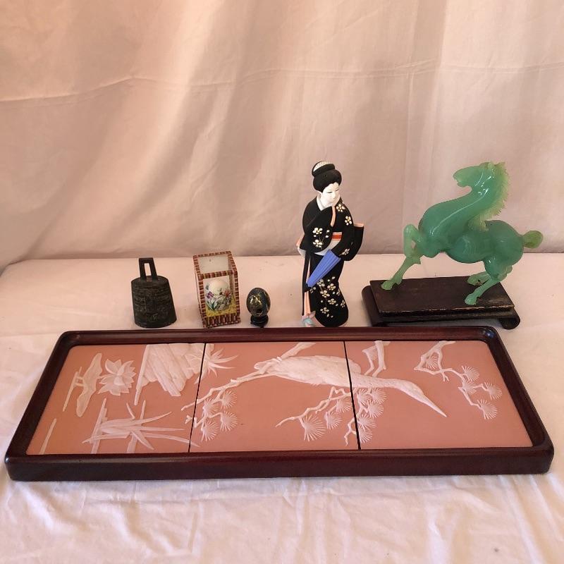 This lot contains several beautiful items, the most special of which is the tile art (25” x 9.5” ) titled “Tranquil Waters” by George McMonigle. This art is a beautiful shade of pink, with white detailing in a beautiful wooden frame. This is a piece anyone would be lucky to have in their home. This lot also contains two fake eggs (the dark colored one is either detachable or broken), a beautiful state of a horse, and a doll, that was made by “Toyo,” a company from Japan. It also comes with an antique bell of some kind. Local pickup only.