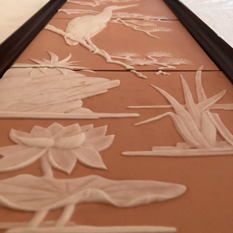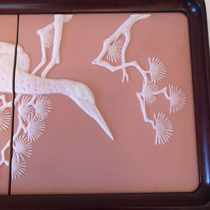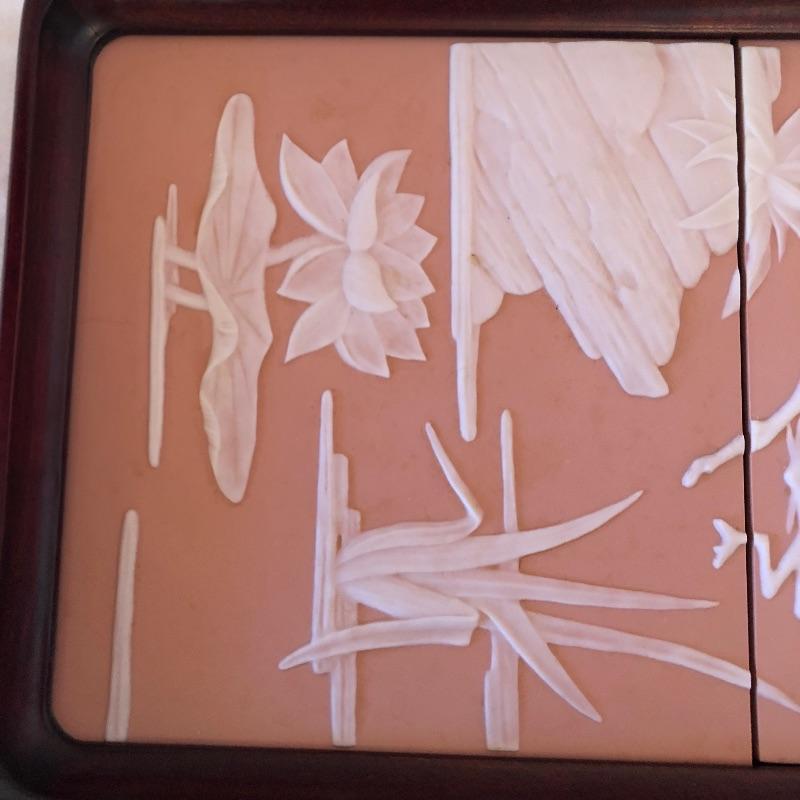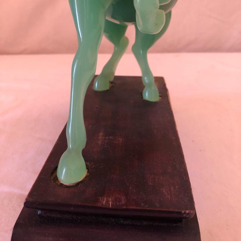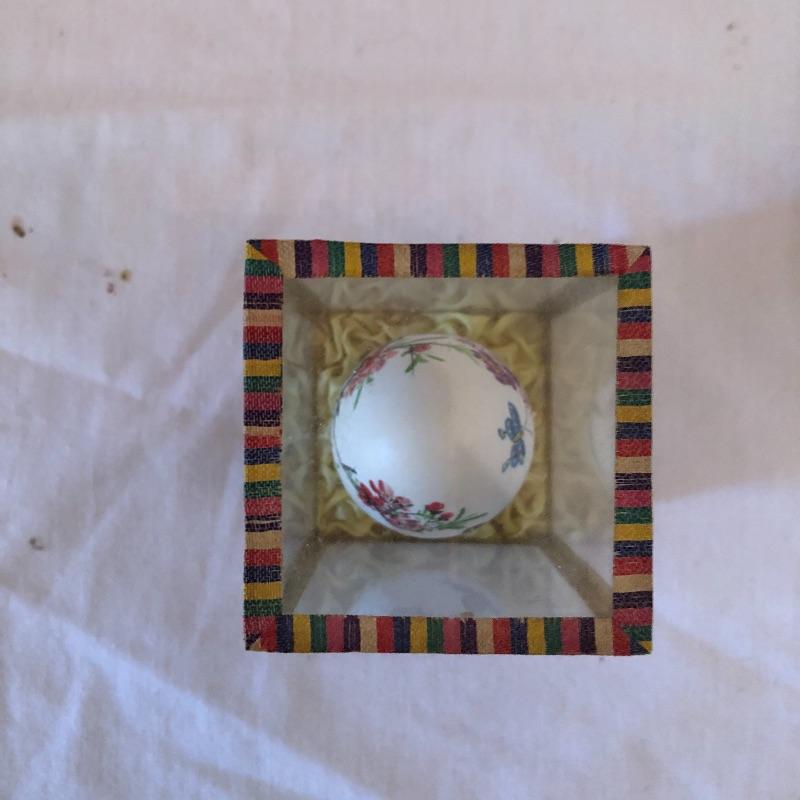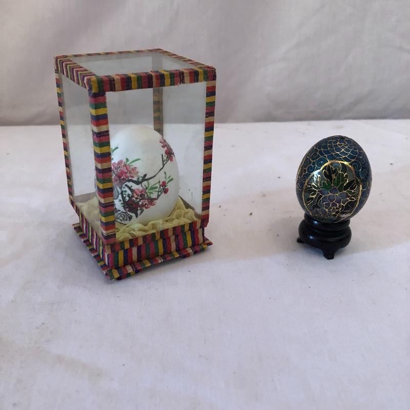This lot contains several beautiful items, the most special of which is the tile art (25” x 9.5” ) titled “Tranquil Waters” by George McMonigle. This art is a beautiful shade of pink, with white detailing in a beautiful wooden frame. This is a piece anyone would be lucky to have in their home. This lot also contains two fake eggs (the dark colored one is either detachable or broken), a beautiful state of a horse, and a doll, that was made by “Toyo,” a company from Japan. It also comes with an antique bell of some kind. Local pickup only.