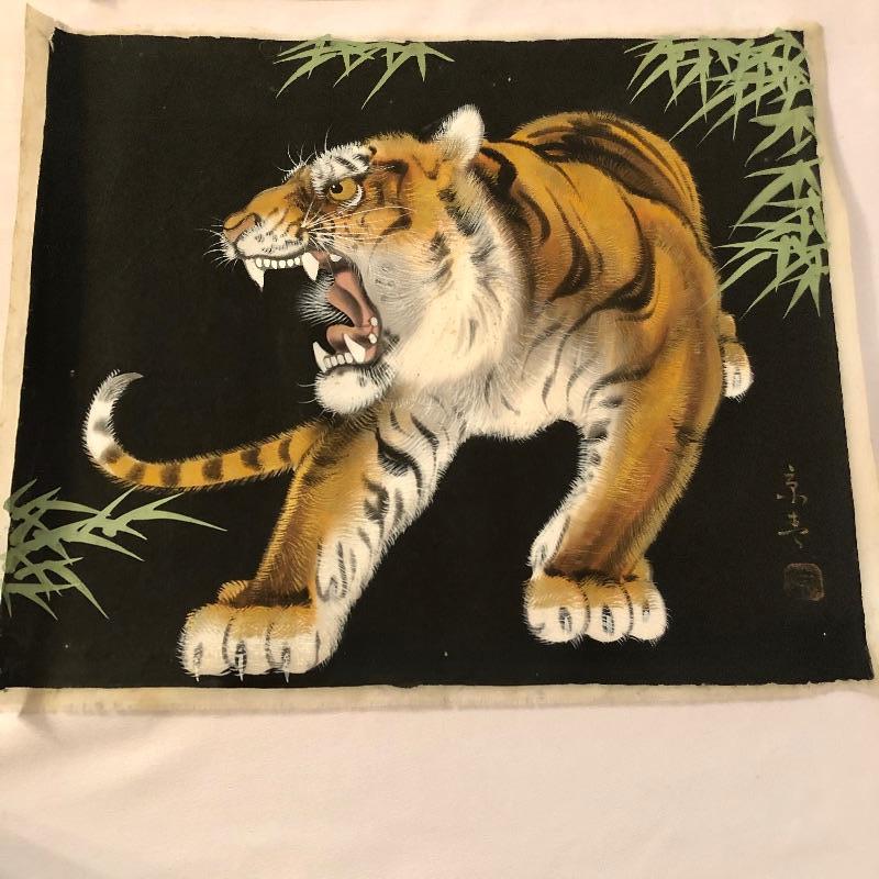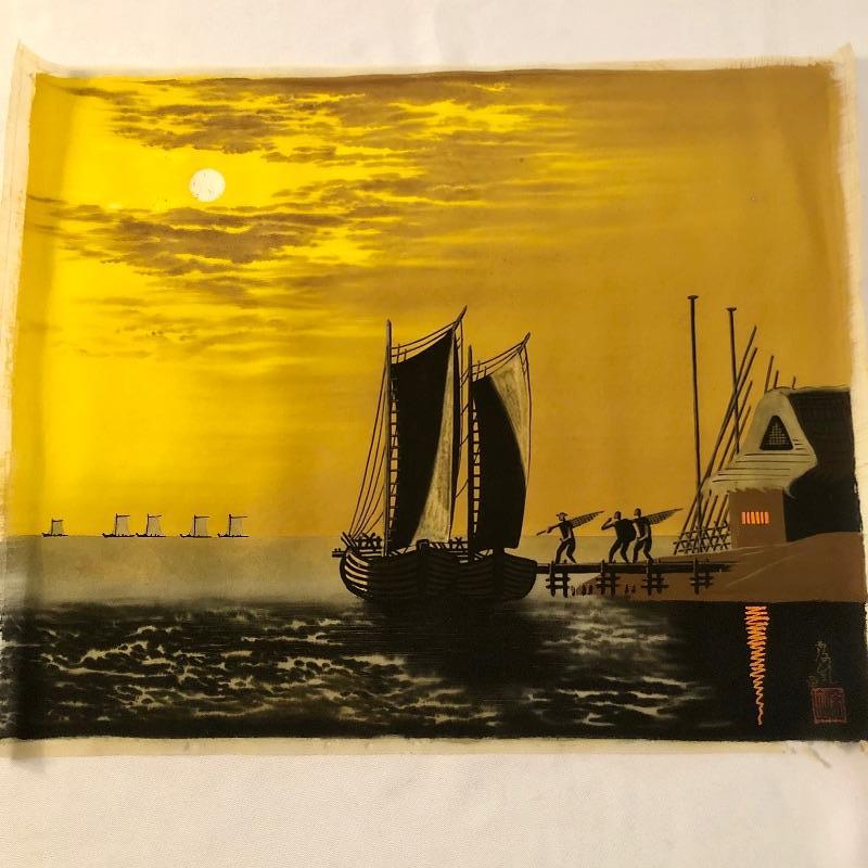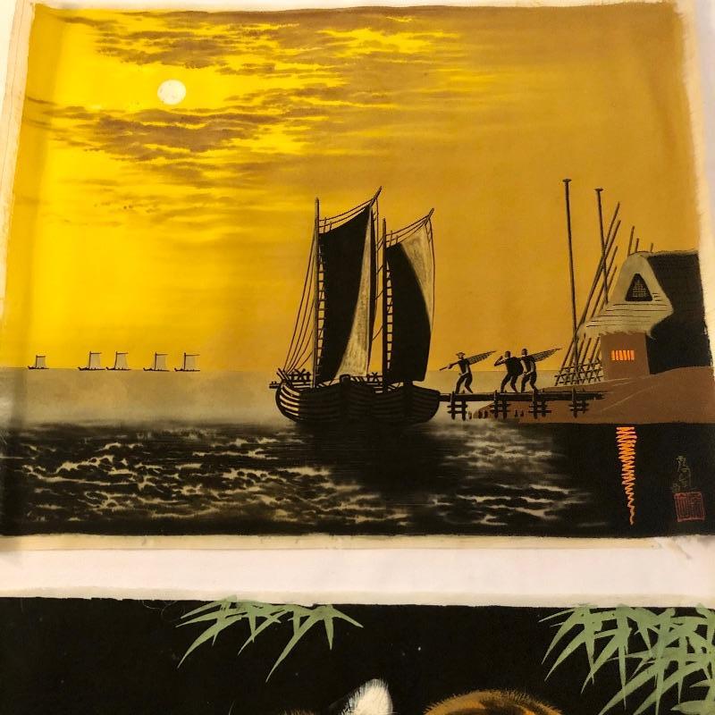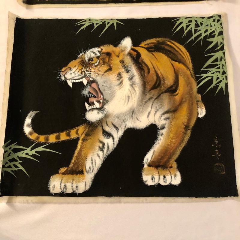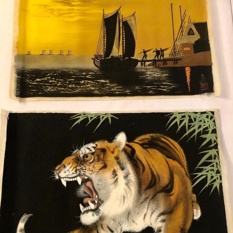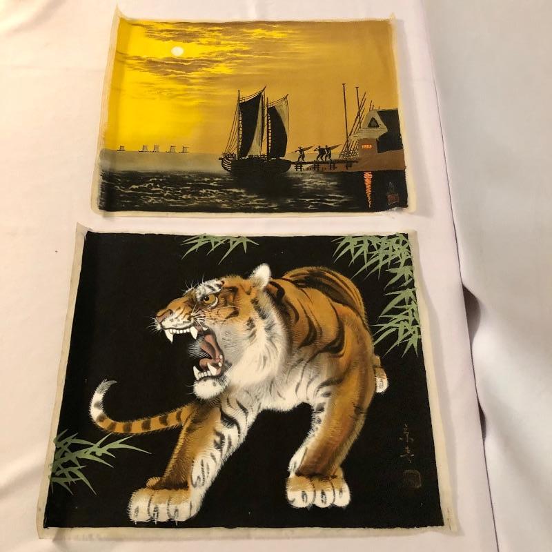 Both of these pieces of artwork are uniquely stunning! The tiger painting on silk is incredibly vibrant and realistic. It appears to be signed as does the boat scene. The second silk piece depicts fishermen heading out to sea at sunrise.