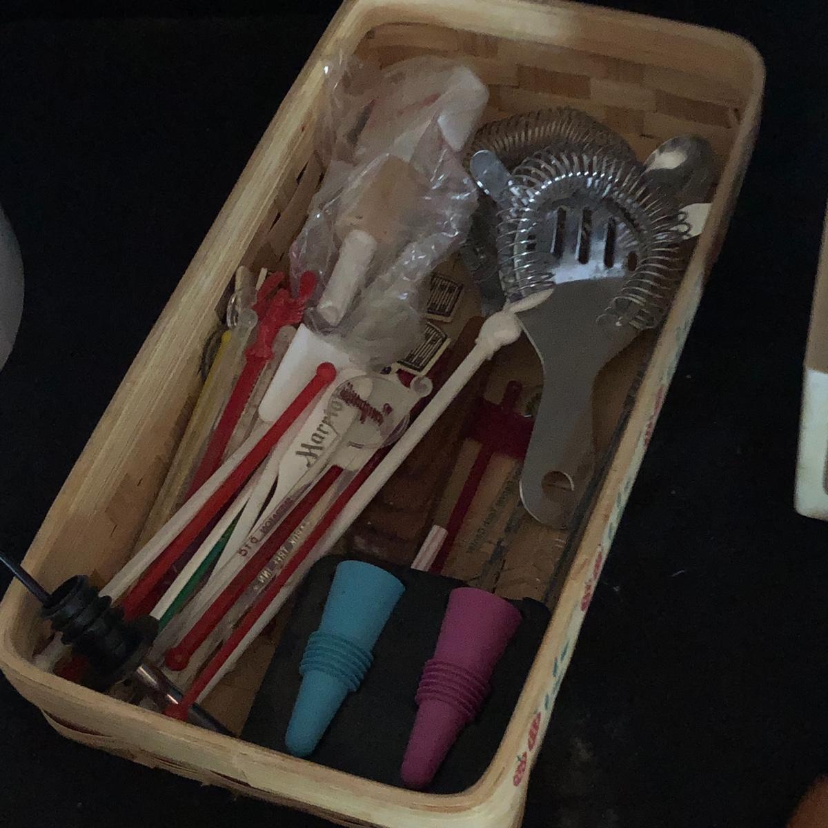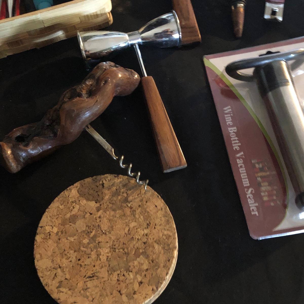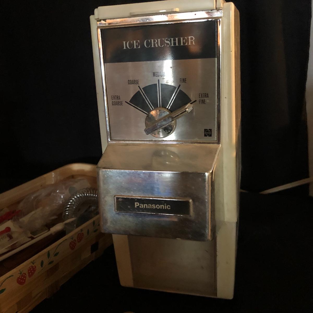 Stock your bar with this lot! It has everything you need to make a drink! There is a Panasonic ice crusher that comes with a tub to catch the ice and then a cool looking ice bucket to store it. The ice crusher powered on when its lid was lifted. This lot also includes two measuring shot glasses, three cork coasters, tree branch cork screw, jigger measure cup, bottle openers and so much more! There are also fifteen glasses of sorted sizes to compliment your bar. Local pick up only.